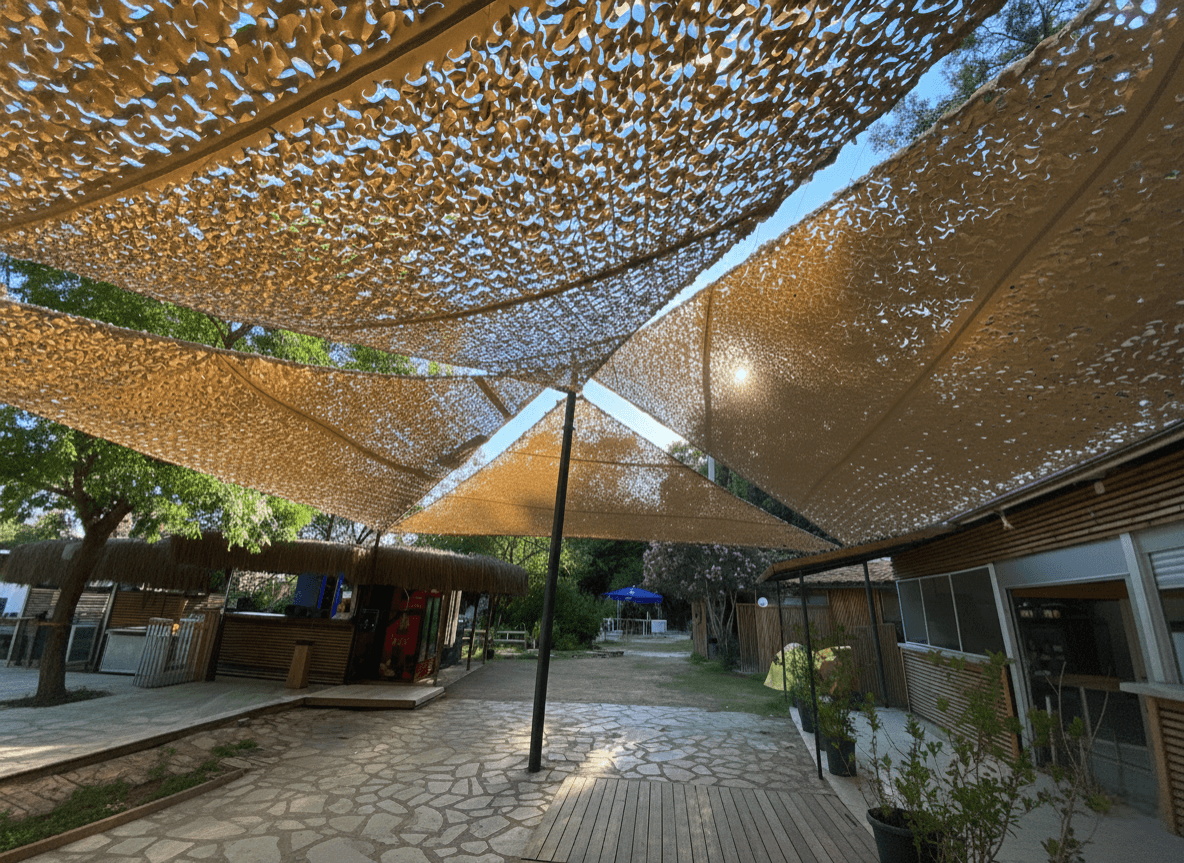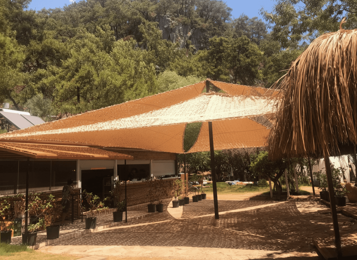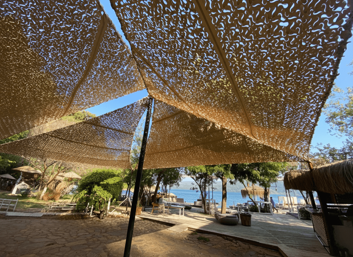 Akyaka’ nın en ikonik noktalarından biri olan Çınar Beach’ te, bölgenin eşsiz doğasını modern bir mimari dokunuşla kucaklayan özel bir Yarasa Tente projesine imza attık. Mekanın ruhuna uygun olarak seçilen Kamuflaj Kumaş kullanımıyla, hem güneşin yakıcı etkisini kırdık hem de Akyaka’nın meşhur termik rüzgarlarını bir avantaja dönüştürdük. Bu projede uyguladığımız CNC kesim kamuflaj kumaş, delikli yapısı sayesinde hava sirkülasyonunu maksimum seviyede tutarak misafirlere en sıcak saatlerde bile doğal bir ferahlık sunar. Tasarımın estetik derinliği, günün farklı saatlerinde zemin ve çevre üzerinde yarattığı büyüleyici gölge oyunlarıyla mekanın dekorasyonunu zenginleştirmektedir. Selçuk Tente’nin yüksek malzeme kalitesini her detayda hissettirdiğimiz bu uygulamada, kumaşın formunu rüzgara karşı koruması için tüm çevreye özel emniyet kolonu (şerit) dikilmiştir. Bu işlem, tentenin sarkmasını engelleyerek her daim ilk günkü gerginliğini korumasını sağlar. Köşe noktalarında ise basite kaçılmamış; kumaşı sandviç sistemiyle araya sıkıştıran altlı-üstlü krom plakalar kullanılmıştır. Bu paslanmaz ve şık bağlantı elemanları, Akyaka’nın sert deniz esintilerinde dahi sistemin sarsılmaz bir mukavemetle yerinde durmasını garanti altına almaktadır.