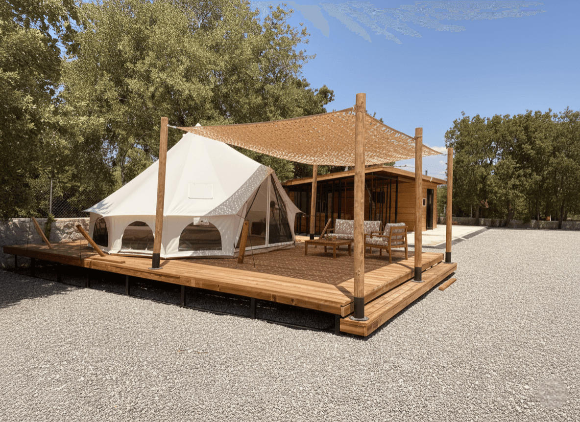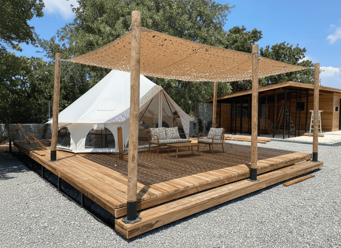 Datça’nın bereketli topraklarında, zeytin ve badem ağaçlarının arasındaki çadırın özgür ruhuna uygun bir dış mekan çözümü sunduk. İşletmenin açık hava alanlarını, Sabit Tente iskeleti üzerine uyguladığımız Kamuflaj Tente modelimizle hem modern hem de nostaljik bir görünüme kavuşturduk. Datça’ nın nemsiz ve serinletici rüzgarı dikkate alınarak geliştirilen lazer teknolojili özel "S" gözenekler, rüzgarın kumaş içinden direnç oluşturmadan geçmesini sağlar. Bu sayede yırtılma riski ortadan kalkarken, kumaşın o efsaneleşen hafif ve uçuşan formu korunur. Tamamen kapalı tavan sistemlerinin aksine bu model, misafirlere her daim nefes alan, ferah ve yarı gölgeli bir atmosfer sağlar. Sistem; özel geliştirilen emniyet kolonları, radansa bağlantıları ve güçlendirilmiş dikiş teknikleri sayesinde her türlü hava koşulunda yapıya güvenle tutunur. Kurulum aşamasında; radansalı, vidalamalı ve çelik halat bağlama ile gerdirmeli yöntemlerimiz kullanılarak kurulum en güvenli şekilde tamamlanmıştır.