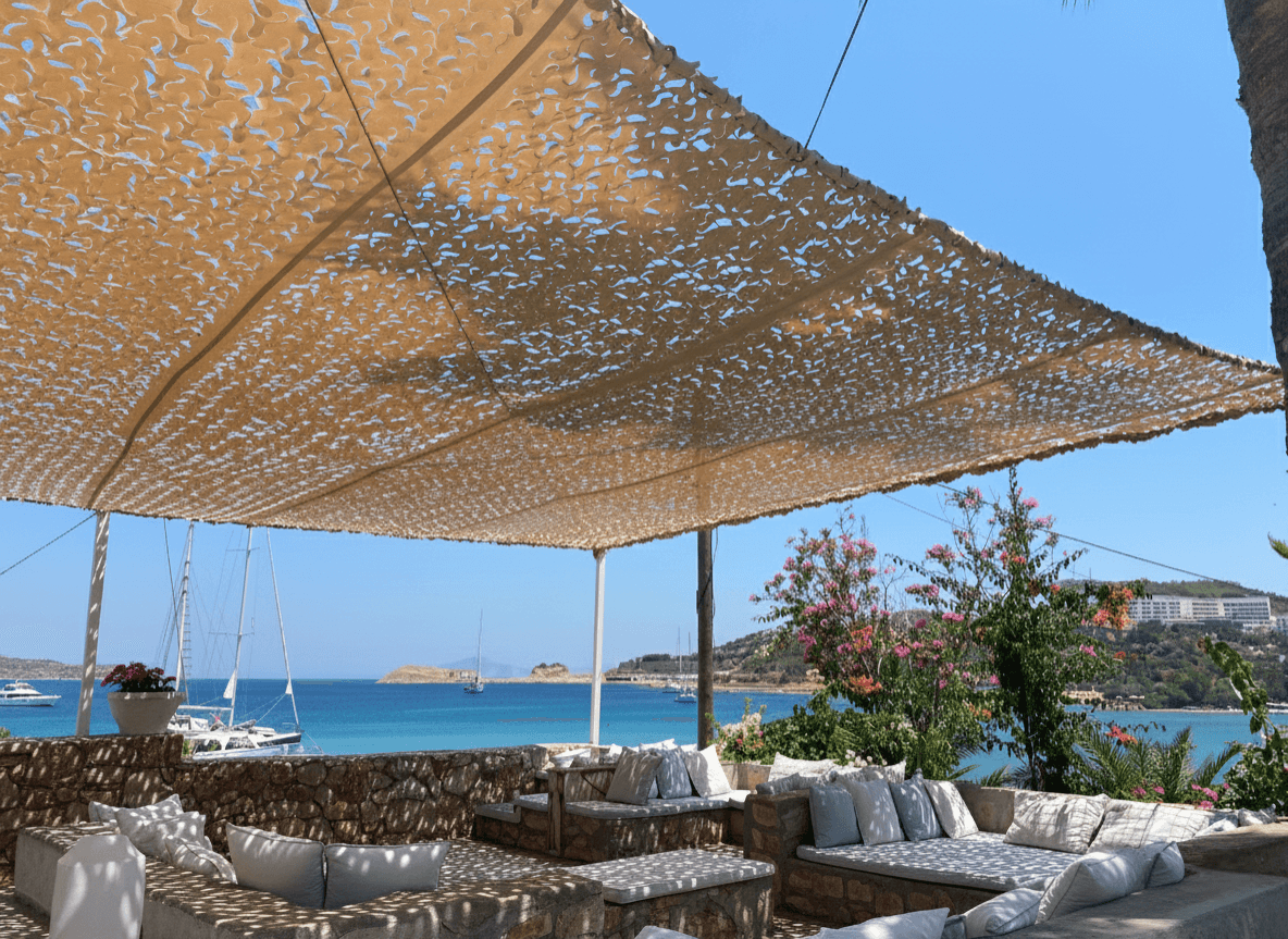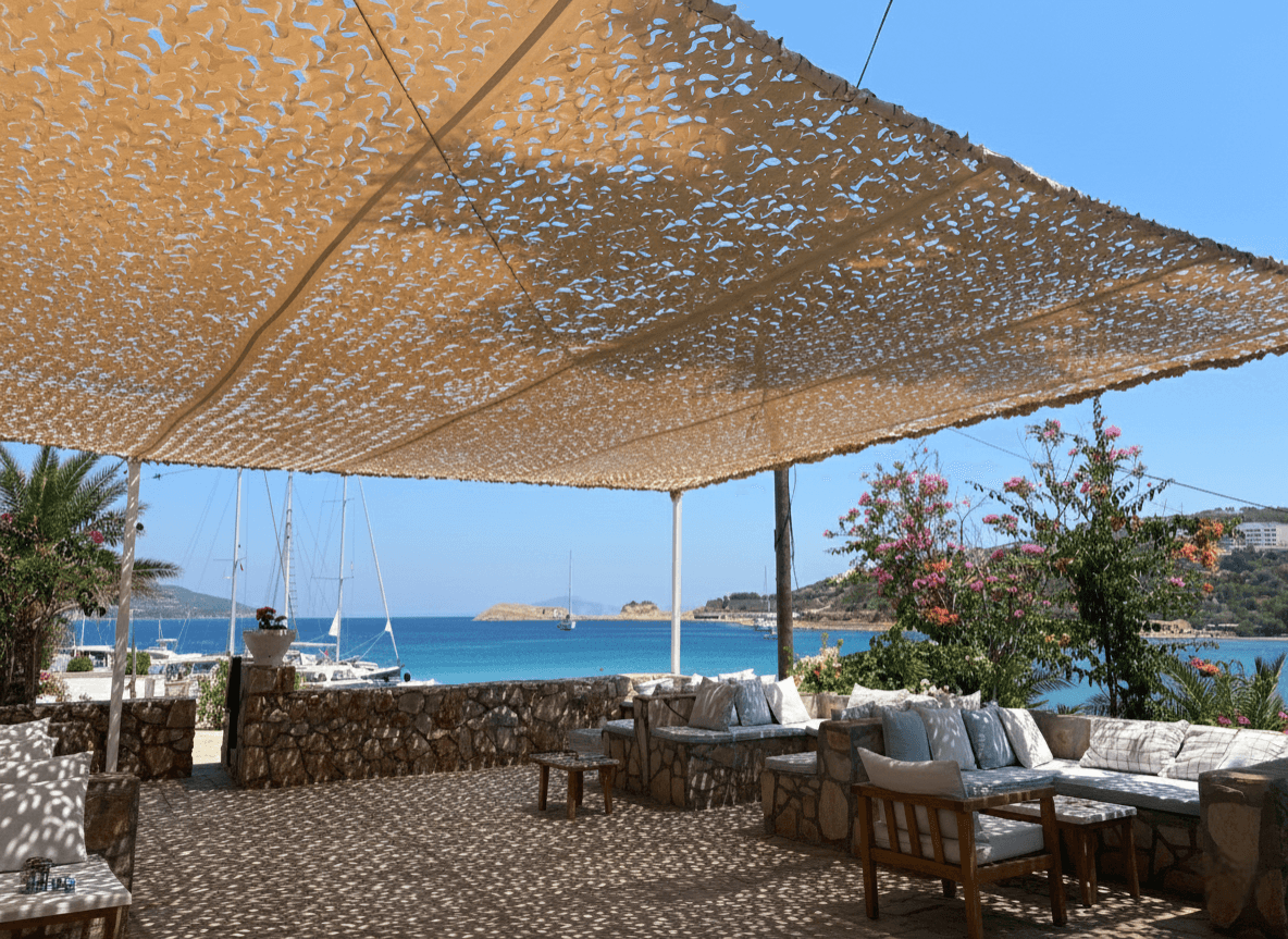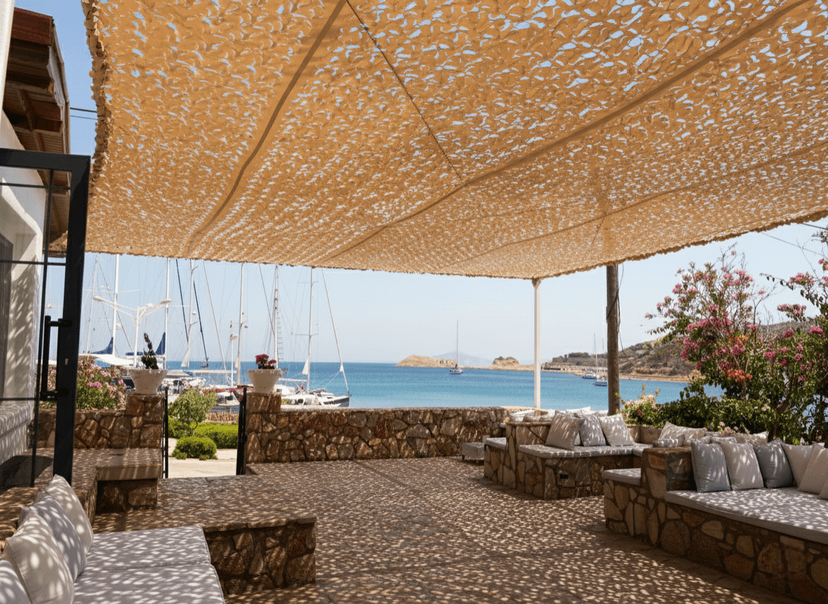 Datça’ nın o meşhur nemsiz havası ve begonvillerle süslü taş mimarisine sahip bu özel mülkte, dış mekan yaşam kalitesini Selçuk Tente uzmanlığıyla artırdık. Konutun bahçe ve veranda kullanım alanları için, Sabit Tente iskeleti üzerinde Kamuflaj Tente sistemimizi hayata geçirdik. Datça’ nın serinletici ama zaman zaman sertleşen rüzgarları dikkate alınarak tasarlanan lazer teknolojili özel "S" gözenekler, rüzgarın kumaş içinden direnç oluşturmadan geçmesini sağlar. Bu mühendislik çözümü, yırtılma riskini ortadan kaldırırken kumaşın hafif ve uçuşan formunu korumasına yardımcı olur. Mekanda kapalı bir tavan hissi yaratmak yerine; doğayla bütünleşik, nefes alan ve gün boyu ferahlık sağlayan yarı-gölgeli bir atmosfer sunulmuştur.