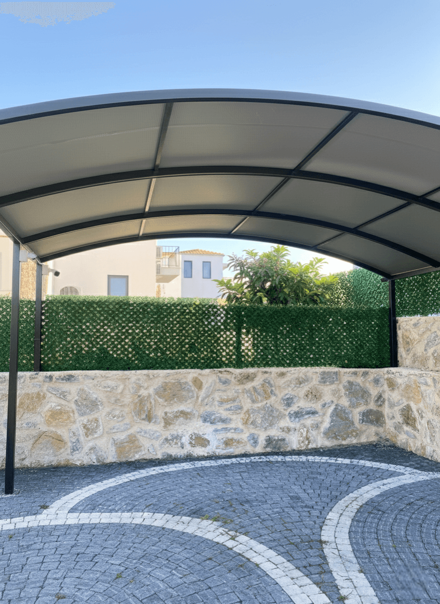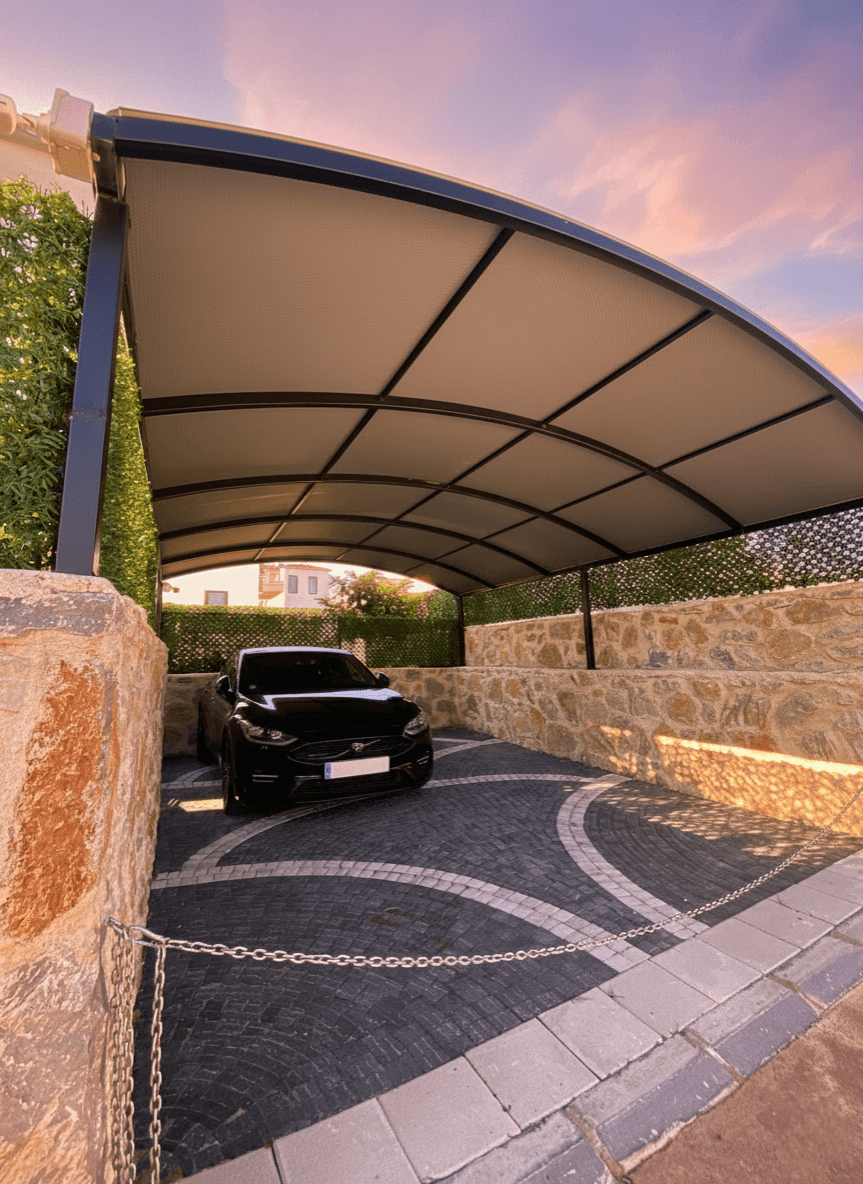Ege ve Akdeniz’ in buluşma noktası olan Datça’ da, modern bir özel konutun araç park alanı için hem dayanıklı hem de mimari estetiği tamamlayan profesyonel bir gölgelendirme çözümü sunduk. Konutun mevcut kavisli karkas yapısı üzerine, aracı dış etkenlerden dört mevsim korumak amacıyla kışlık uygulama disiplinimizi hayata geçirdik. Bu garaj projesinde temel önceliğimiz, Datça’ nın yakıcı güneşinden ve kışın gelen yağışlardan tam koruma sağlamaktı. Bu doğrultuda; su itici özelliği yüksek ve güneş ışınlarına karşı maksimum mukavemet sunan profesyonel kumaşlar tercih edilmiştir. Kışlık konseptin en hayati teknik gerekliliği olan su tahliyesi, karkas yapısındaki özel kavisli eğim sayesinde kusursuz hale getirilmiş; suyun yüzeyde göllenme yapmadan tahliye edilmesi sağlanmıştır. Bu yapı, sadece bir koruma alanı değil, aynı zamanda konutun girişine değer katan dekoratif bir tavan uygulaması niteliğindedir. Montaj aşamasında, konutun prestijli görünümüne uygun olarak en pürüzsüz ve bütünleşik işçiliği sunan Ahşap Çıta Üzeri Zımba Tekniği uygulanmıştır. Bu özel yöntemle; kumaş, ince ahşap çıtalar üzerine yüksek gerginlikle sabitlenerek ek yeri görünmeyen, pürüzsüz ve uzun ömürlü bir tavan dokusu elde edilmiştir.