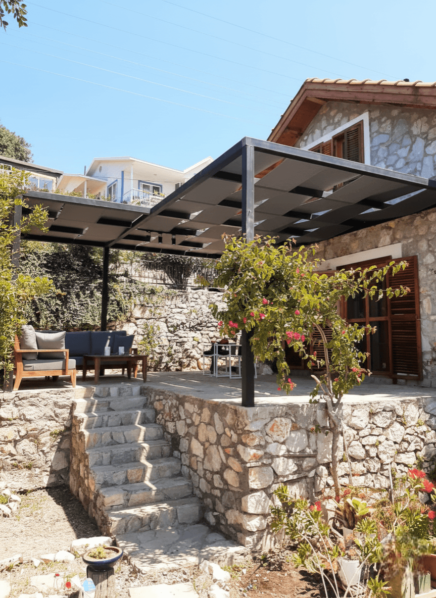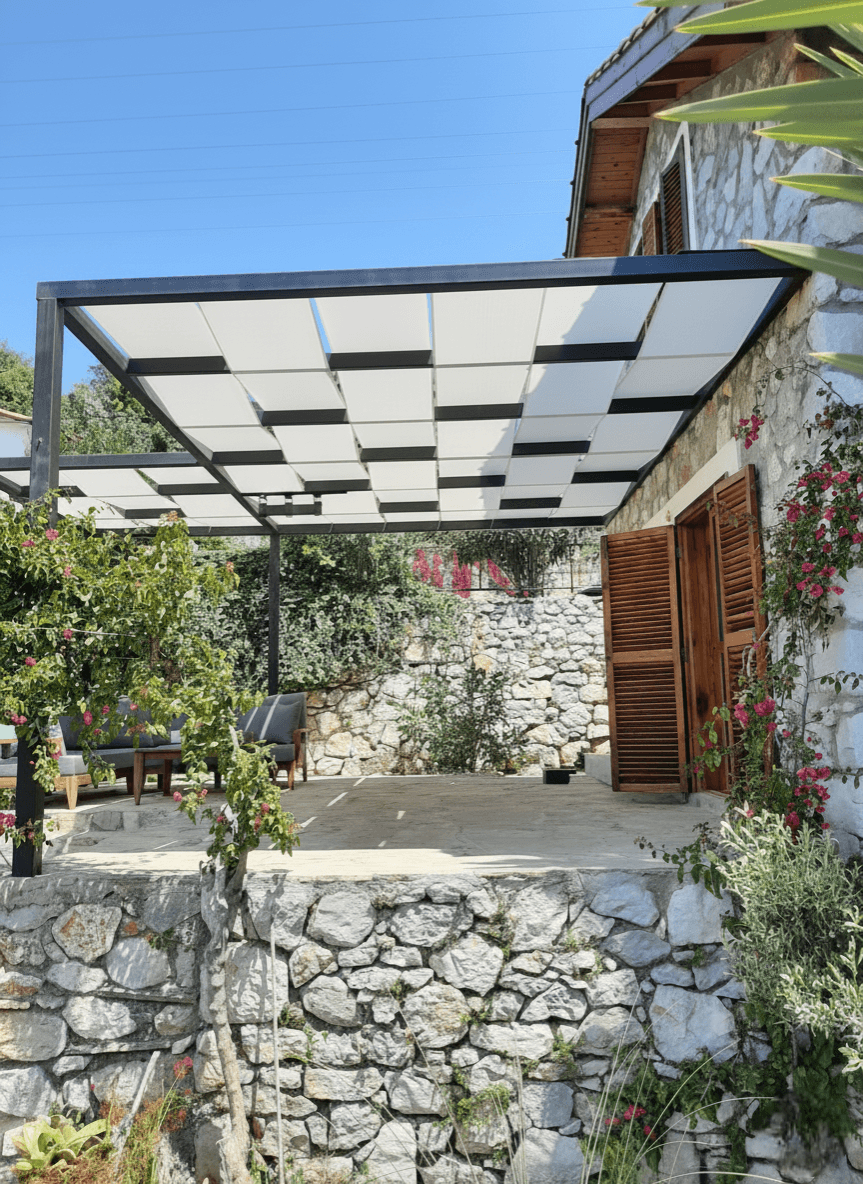 Marmaris’ in eşsiz doğasında yer alan bu özel konutun teras ve dinlenme alanı için, hem estetik bir tavan görüntüsü sunan hem de ferahlık sağlayan profesyonel bir gölgelendirme çözümü sunduk. Konutun mevcut pergola yapısı üzerine, Marmaris’in uzun yaz dönemine en uygun düşen yazlık uygulama disiplinimizi hayata geçirdik. Bu projede, güneşin yakıcı etkisini minimize eden ancak doğal hava akışını kesmeyen, yüksek kaliteli ithal akrilik kumaş tercih edilmiştir. Mekana modern ve dekoratif bir derinlik katan, halk arasında "battı/çıktı tente", "sarhoş tente" veya "alttan üstten tente" olarak bilinen parçalı/bantlı “sabit tente” uygulama tekniği kullanılmıştır. Yazlık konseptin sağladığı avantajla, kumaş yapısı suyu süzdüğü için yüzeyde su birikme riski barındırmaz; bu sayede konutun mevcut yapısına tamamen düz ve yatay bir düzlemde, ek bir eğim gerektirmeden güvenle uygulanabilmiştir. Montaj aşamasında, Marmaris’in sahil rüzgarlarına karşı maksimum dayanıklılık sağlamak adına kumaşın doğrudan yapıya sabitlendiği en sağlam yöntem olan Vidalama Sistemi uygulanmıştır. Bu teknik, akrilik kumaşın o asil ve şık duruşunu sarsılmaz bir teknik altyapıyla birleştirerek konutun dış mekan yaşam kalitesini zirveye taşımıştır.