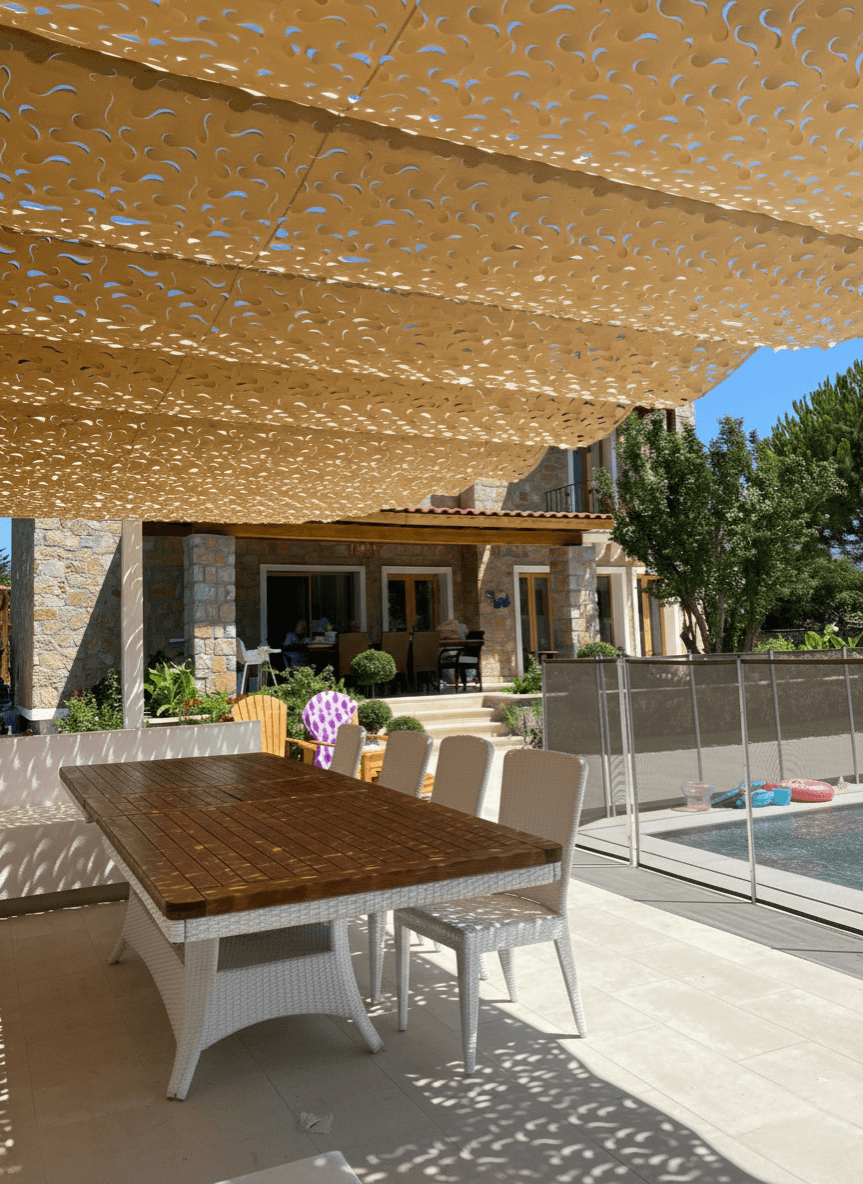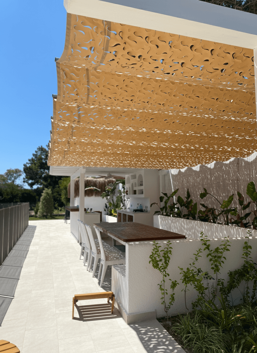Bodrum’un doğal dokusuna sadık kalınarak inşa edilen bu özel konut projesinde, dış mekanı evin en keyifli odasına dönüştürdük. Taş mimarinin ağırlığını, Selçuk Tente’ nin hafif ve estetik tasarımıyla dengeledik: Telli Tente Sistemi.Evin avlu ve geçiş alanlarında uyguladığımız CNC Kesim Kamuflaj Kumaş, Bodrum’ un dik gelen güneş ışınlarını kırarak zemine ve taş duvarlara yumuşak, hareketli desenler bırakıyor. Çelik halatlar üzerinde bir akordiyon zarafetiyle süzülen sistem, dilediğiniz an gökyüzüyle aranızdaki sınırı kaldırırken; kapalı konumda sunduğu harika gölge ile en sıcak saatlerde bile teras keyfini mümkün kılıyor. Fotoğraflarda göreceğiniz o doğal ışık-gölge denge, ahşap mobilyalar ve bitkilerle birleşerek ev sahiplerine huzur dolu bir Egeatmosferi sunuyor.