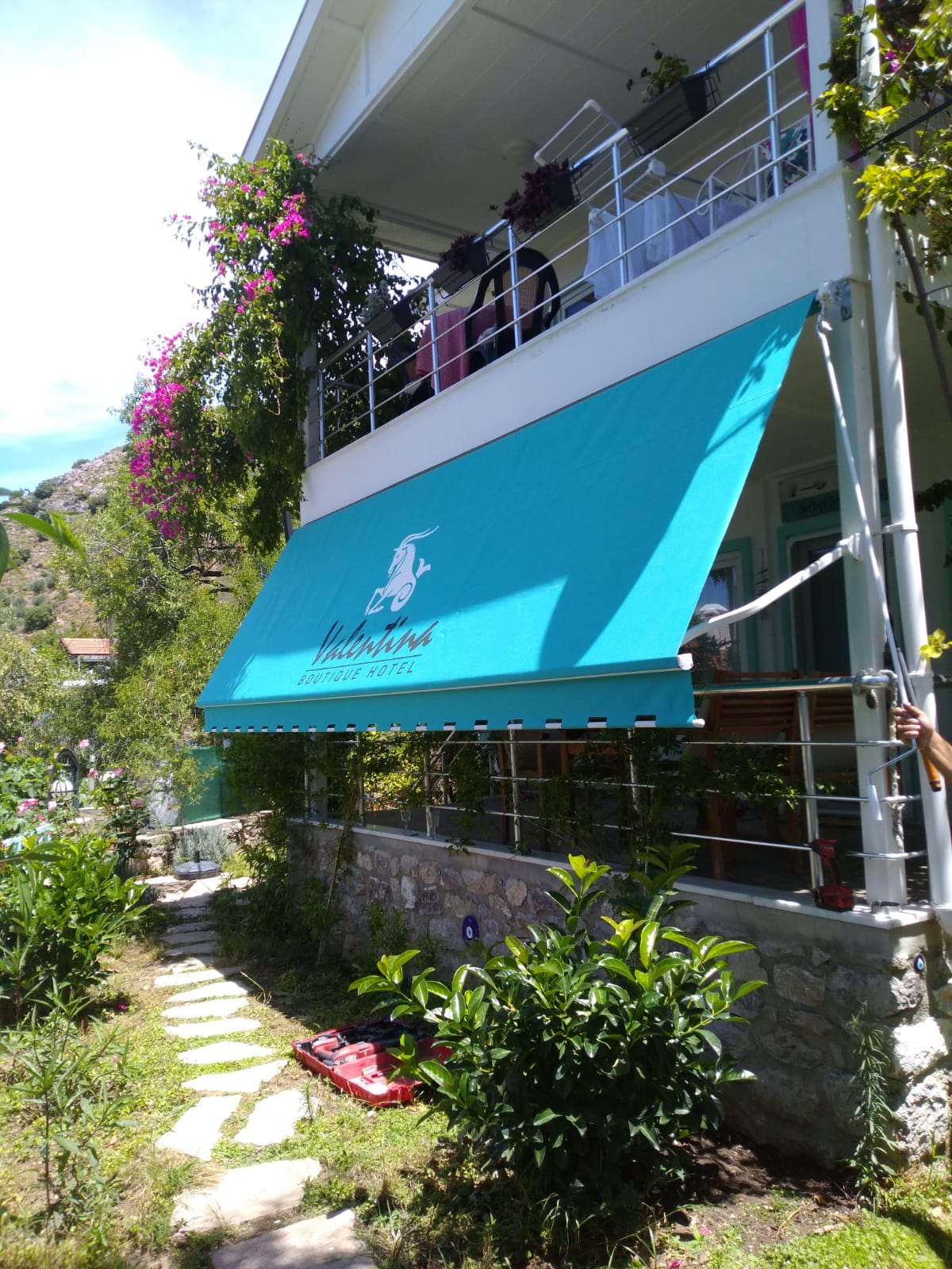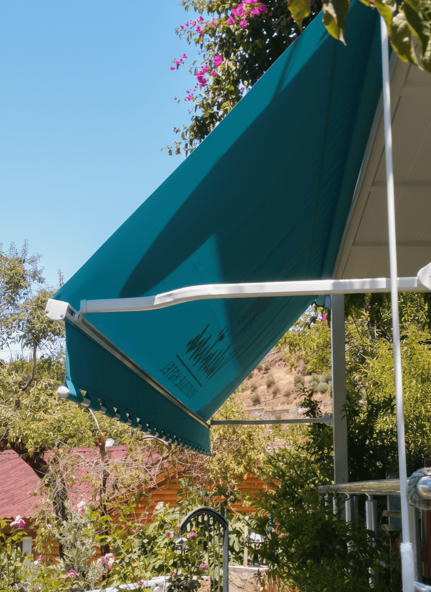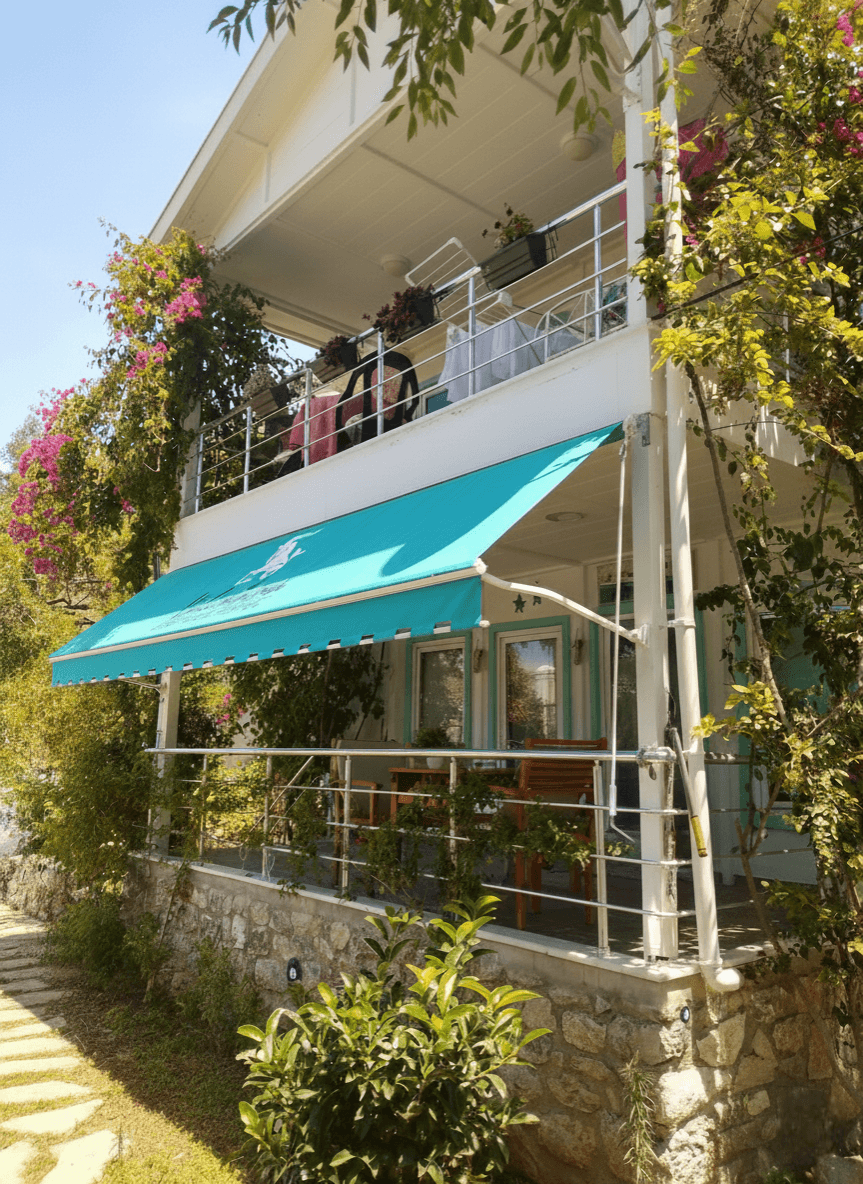 • Alt Ağırlıklı Kare Saçak: Kumaş ile tam bir görsel bütünlük sağlayan alt ağırlıklı kare saçak tercihi, tentenin rüzgarda çok daha stabil durmasını sağlarken konuta modern bir imza atmıştır.