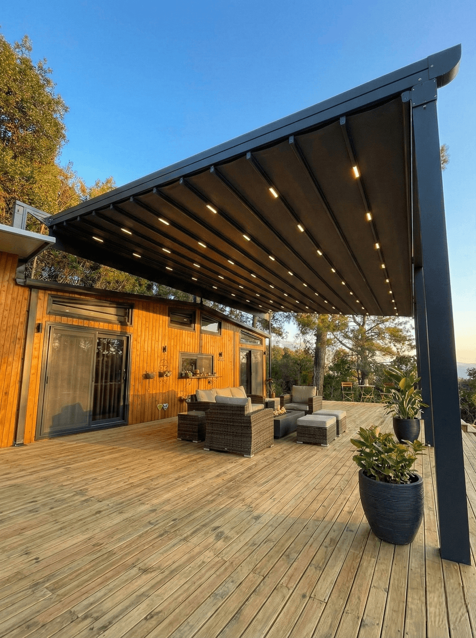 Marmaris’ in huzurlu doğasında yer alan bu özel Tiny House projesinde, konutun önündeki geniş ahşap deck alanını Selçuk Tente’nin modern Pergola (Raylı Tente Sistemi) ile taçlandırdık. Küçük ev yaşamının (Tiny House) sunduğu özgürlüğü, dış mekanı her mevsim kullanılabilir hale getiren teknolojik bir konforla birleştirerek, evin metrekaresini gökyüzüyle sınırlandırdık. Bu özel konut uygulamasında öne çıkan detaylar şunlardır: