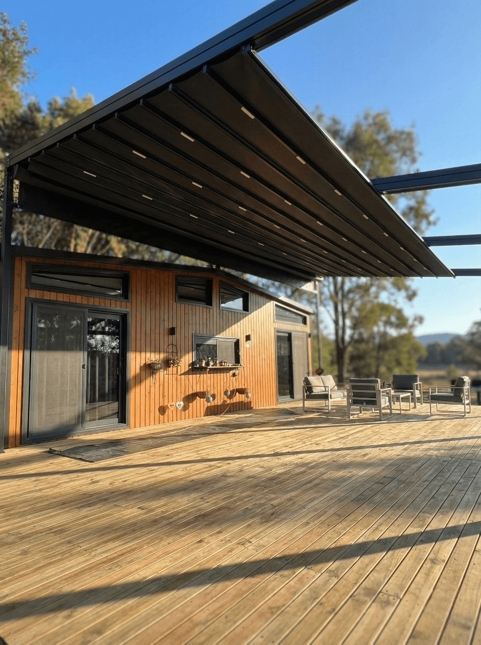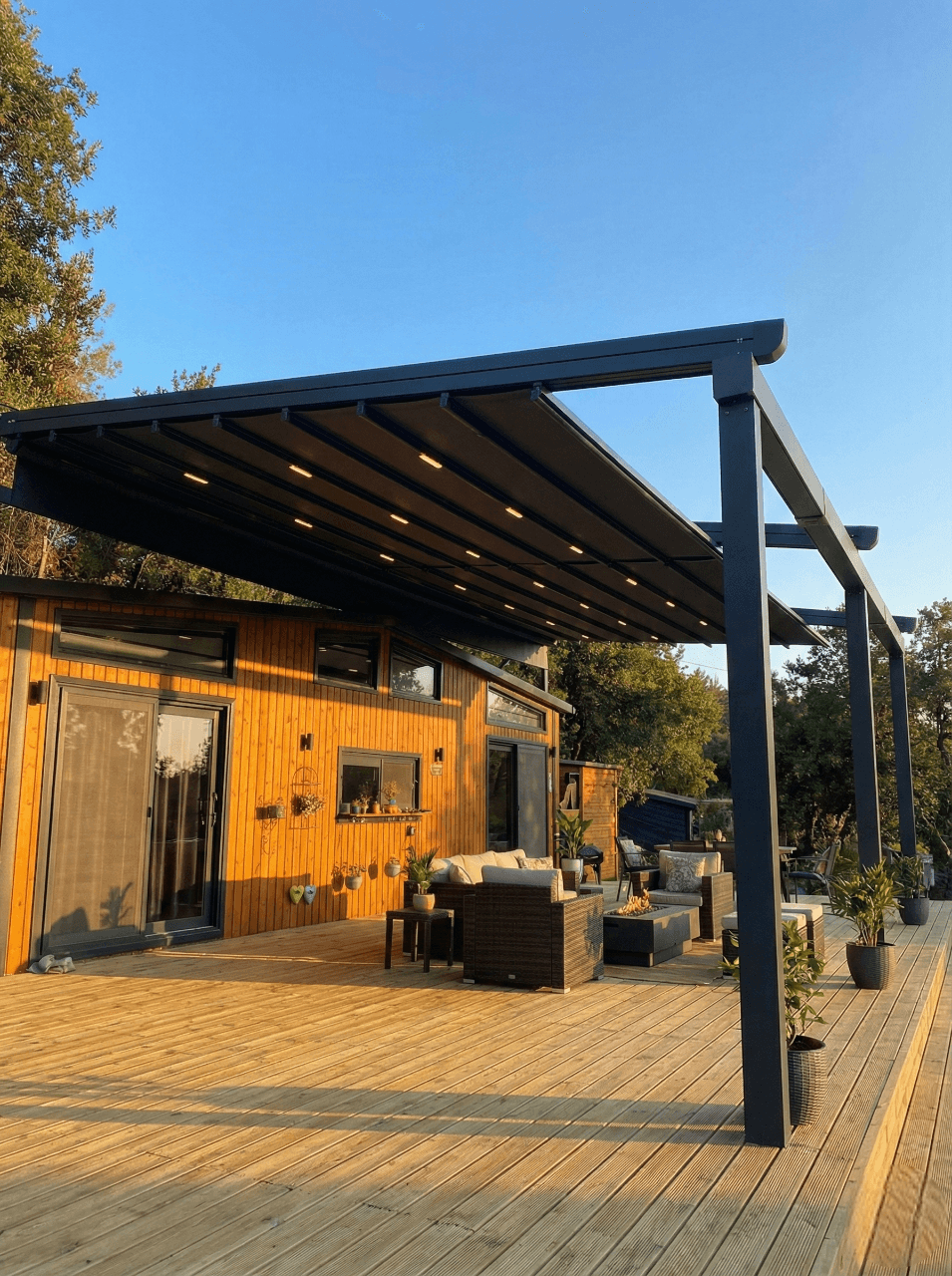 • Doğal Mimari ile Kusursuz Uyum: Tiny House'un ahşap dış cephesi ve geniş deck alanı ile uyumlu, modern antrasit profiller tercih edilerek mekana prestijli bir görünüm kazandırılmıştır.