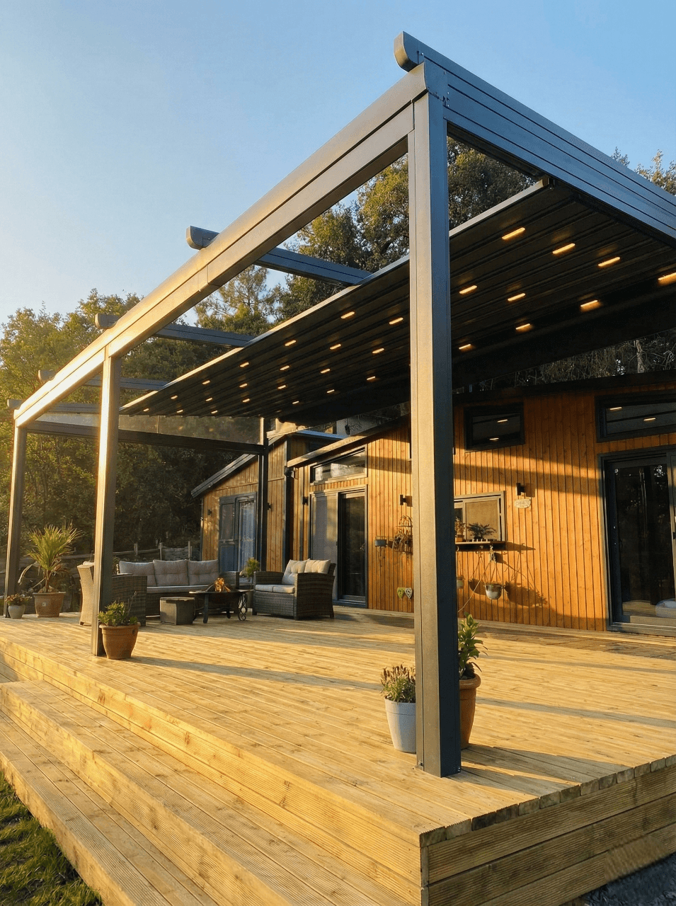 • Akşam Saatlerinde Görsel Şölen: Kumaş profillerine entegre edilen LED ışık sistemi, akşam saatlerinde deck üzerinde şık ve huzurlu bir ambiyans yaratırken, Tiny House'un dış cephesini de estetik bir aydınlatmayla vurgular.