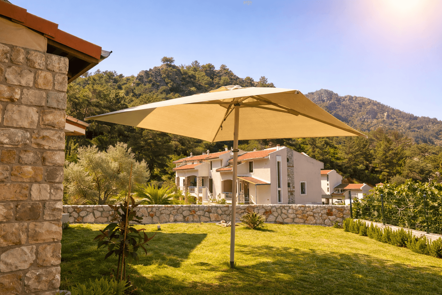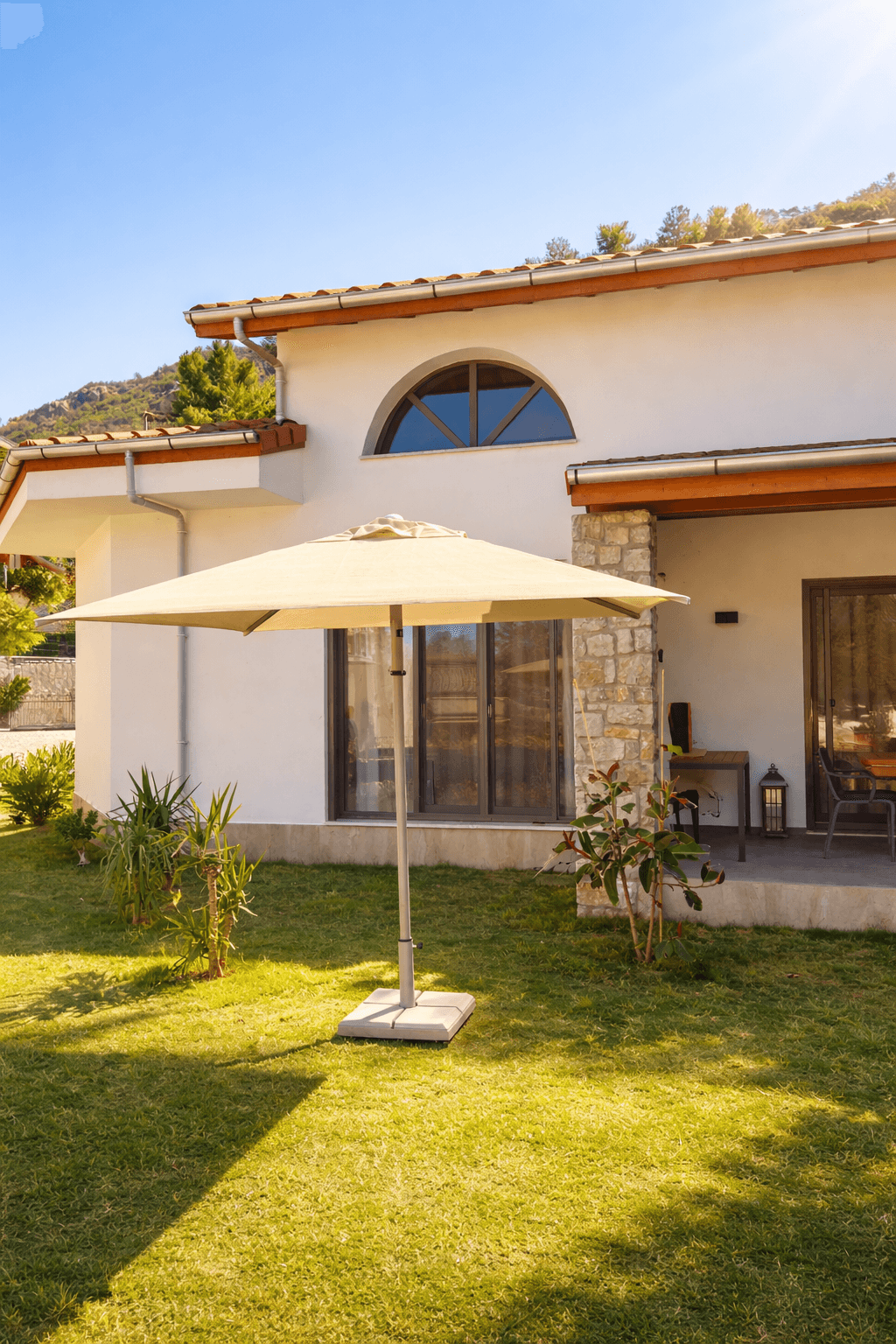 Mimari doku ve doğal çevreyle uyumlu sade tasarımı sayesinde bu uygulama, Marmaris’teki özel konutlar için uzun ömürlü ve prestijli bir bahçe şemsiyesi çözümü olarak öne çıkmaktadır.