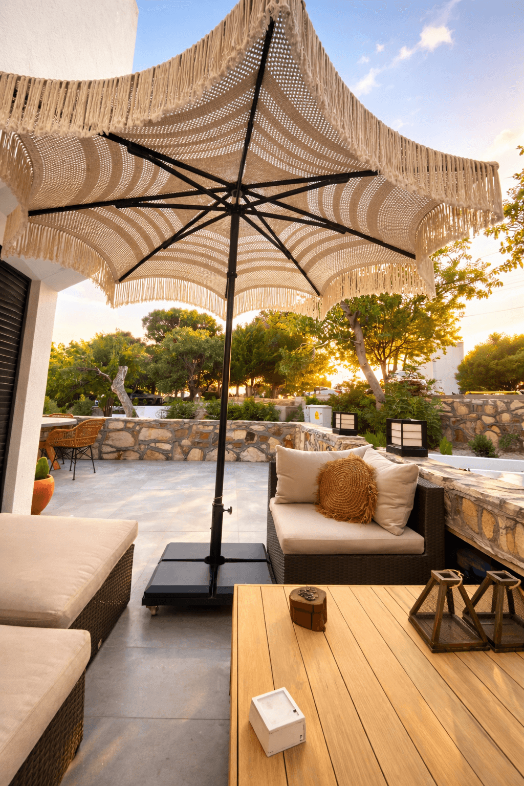 Ayvalık’ın doğal iklimi ve açık yaşam kültürüyle uyumlu bu özel konutta, açık alan estetiğini güçlendirmek ve konforlu gölgelendirme sağlamak amacıyla 50 Serisi – Ø 280 Yuvarlak Makrome Şemsiye tercih edilmiştir. El işçiliğiyle hazırlanan makrome örgü, mekâna sıcak ve doğal bir karakter kazandırırken yuvarlak formu sayesinde gölgeyi yumuşak ve dengeli biçimde dağıtır.