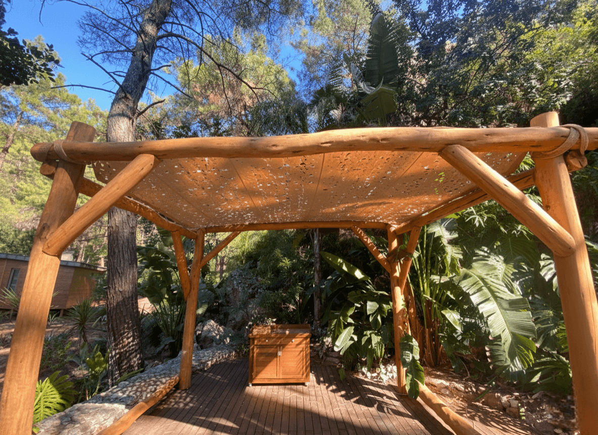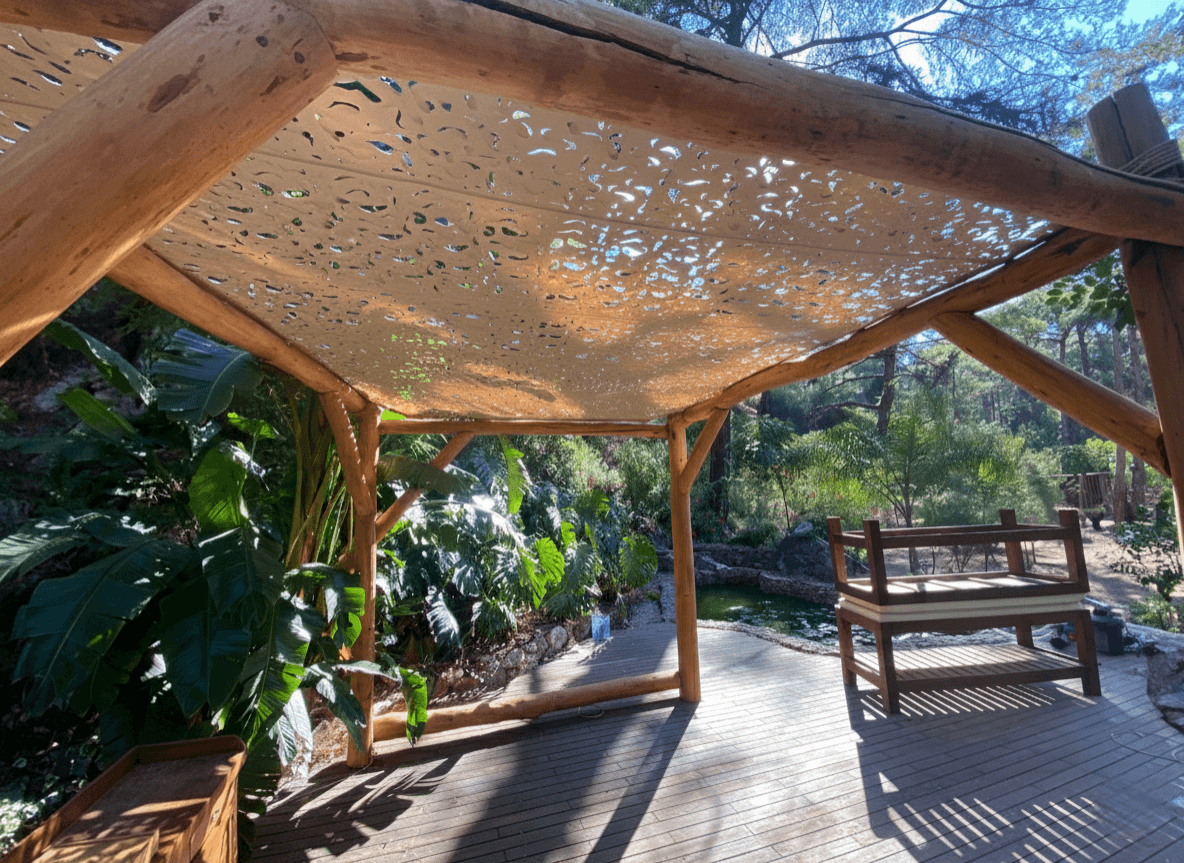 Muğla’nın Marmaris ilçesine bağlı Turgutköy’de, şelaleleri ve eşsiz doğasıyla bilinen bir lokasyonda hizmet veren Ada Capra, misafirlerine huzur dolu bir Ege deneyimi sunmaktadır. Bu butik işletmenin dış mekan alanı için, Turgutköy’ün doğal ve sakin ruhuna uyum sağlayan Sabit Tente iskeleti üzerine Kamuflaj Tente uygulamamızı gerçekleştirdik. Turgutköy’ün meşhur imbat rüzgarları ve denizden gelen esintiler göz önüne alınarak tasarlanan lazer teknolojili özel "S" gözenekler, rüzgarın kumaşın içinden engellenmeden akıp gitmesini sağlar. Bu mühendislik çözümü, rüzgar direncini minimuma indirerek yırtılma riskini ortadan kaldırırken kumaşın uçuşan hafif formunu korur. İşletmede basık ve tamamen kapalı bir tavan yerine; ferah, nefes alan ve ışığın sanatsal bir şekilde süzüldüğü yarı-gölgeli şık bir atmosfer yaratılmıştır.