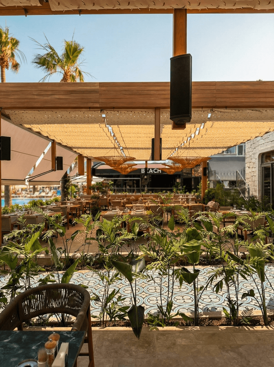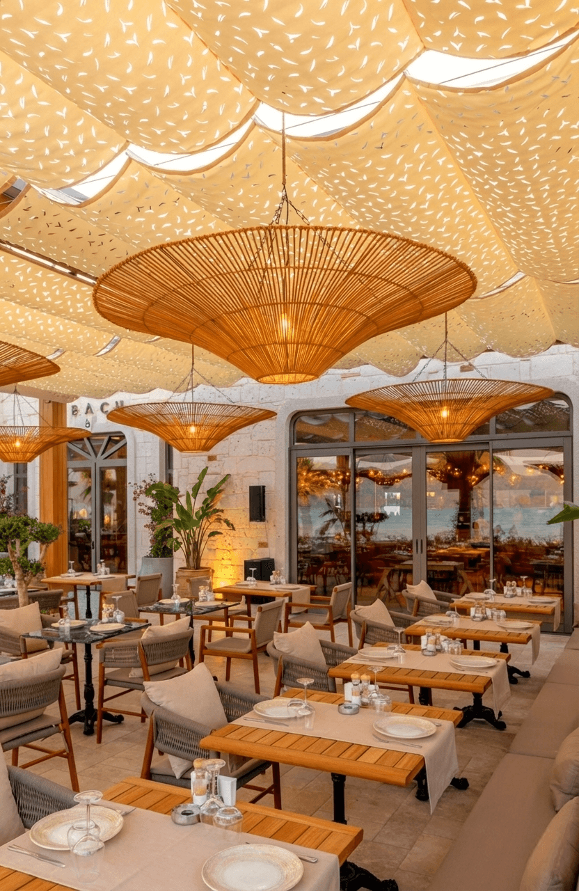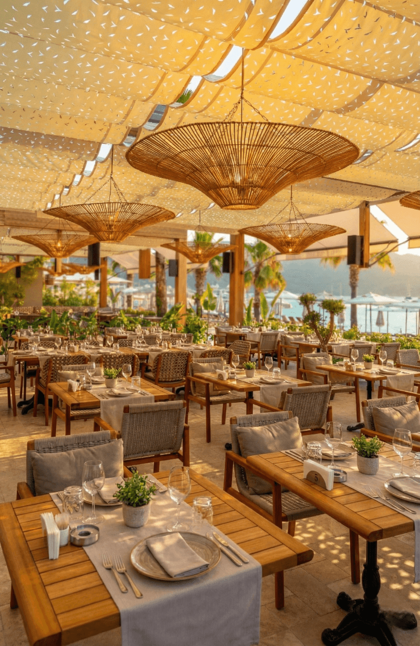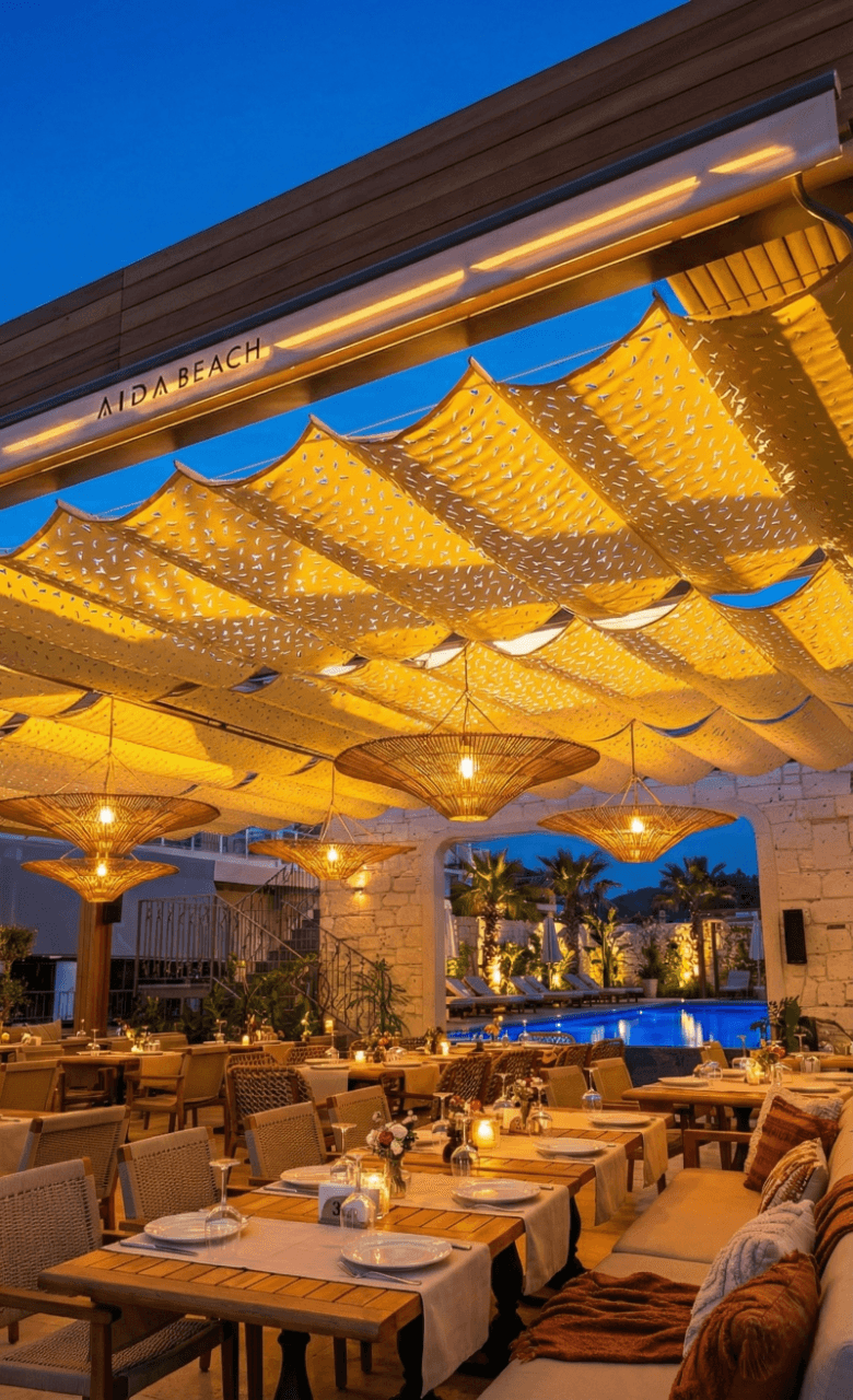 Marmaris’in kristal sularına karşı, Aida Beach’in seçkin atmosferinde güneşle aranızdaki en zarif engel: Selçuk Tente Telli Tente Sistemi. Mekanın bohem dokusuyla kusursuz bir uyum yakalayan Kamuflaj Kumaş tercihimiz, CNC kesim detaylarıyla güneş ışığını adeta bir ağacın gölgesi gibi doğal ve huzurlu bir şekilde zemine yansıtıyor. Krom halatlar üzerinde süzülen alüminyum kanallar, akordiyon yapısıyla dilediğiniz an gökyüzüyle buluşmanızı sağlarken; kullanılan özel kamuflaj doku, mekana modern bir derinlik katıyor. Yazın kavurucu sıcağında "harika gölge" arayanların vazgeçilmezi olan bu sistem, estetiği ve fonksiyonelliği bir arada sunuyor.