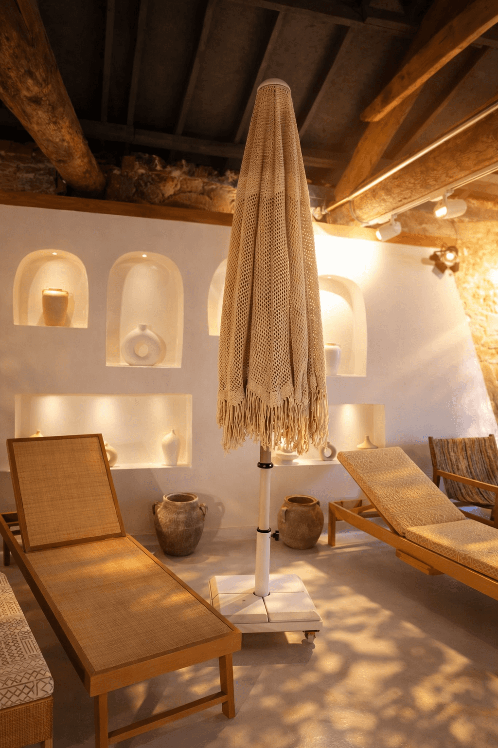 Ayvalık’ın doğal dokusunu ve butik konaklama anlayışını yansıtan Ajlan Home, dış mekânlarında sıcak ve karakterli bir atmosfer yaratmak için Selçuk Tente 50 Serisi – Makrome Şemsiye’yi tercih etmiştir. El örgüsü makrome kumaş, ışığı yumuşak şekilde filtreleyerek konuklara ferah bir gölge sunarken, bohem estetiği mekânın mimari diliyle bütünleştirir.