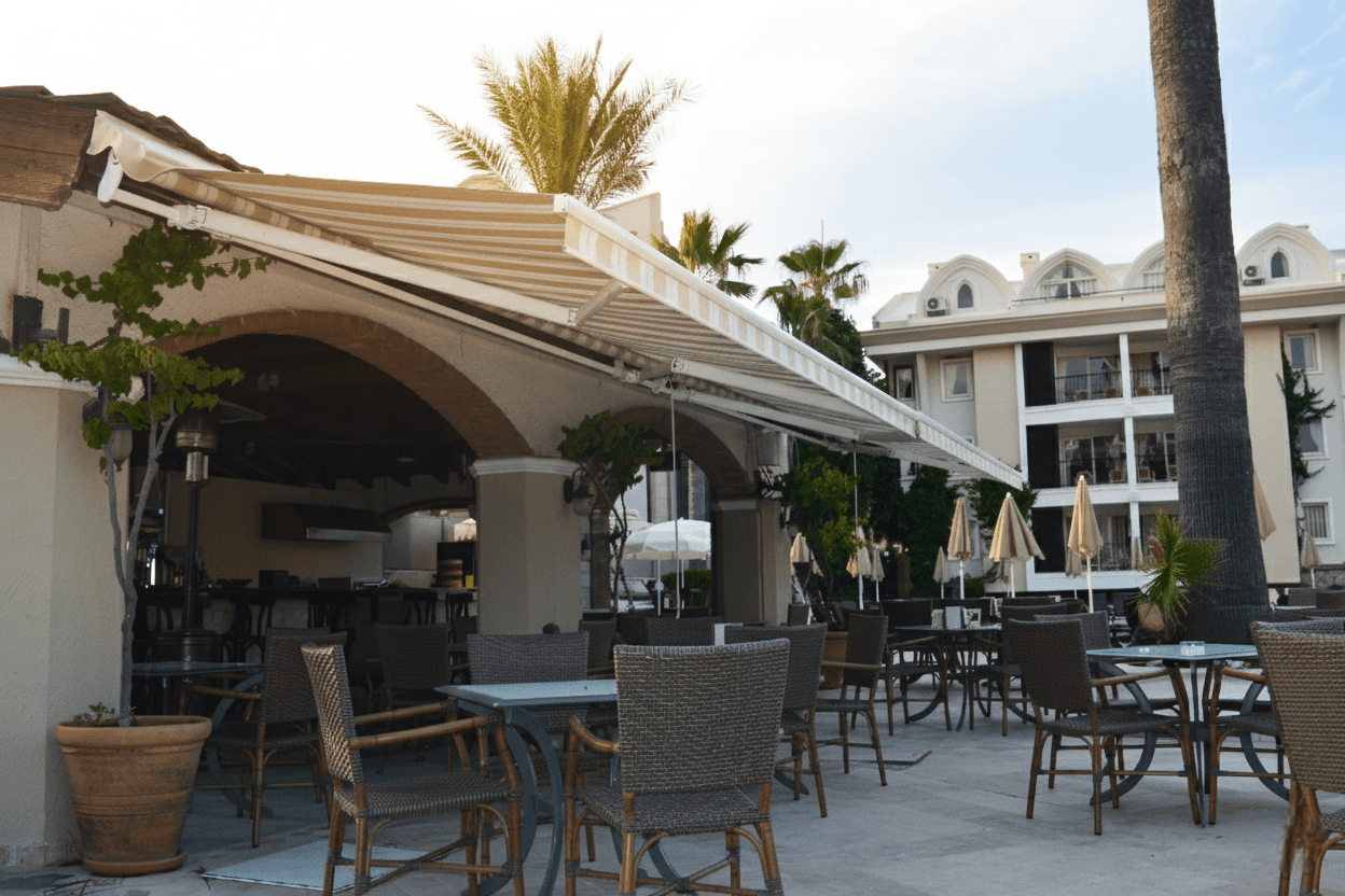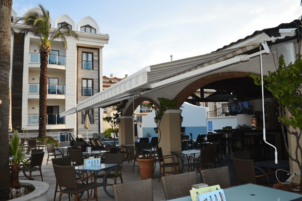 Marmaris’ in kalbinde konfor ve estetiği bir arada sunan Anastasia Otel için, dış mekan kullanım alanlarını en verimli hale getiren Mafsallı Tente (EKO Model) projemizi tamamladık. Otelin giriş ve sosyal alanlarında uyguladığımız bu sistem, hem işletme maliyetleri açısından ekonomik hem de görsel açıdan son derece şık bir çözüm sunmaktadır.