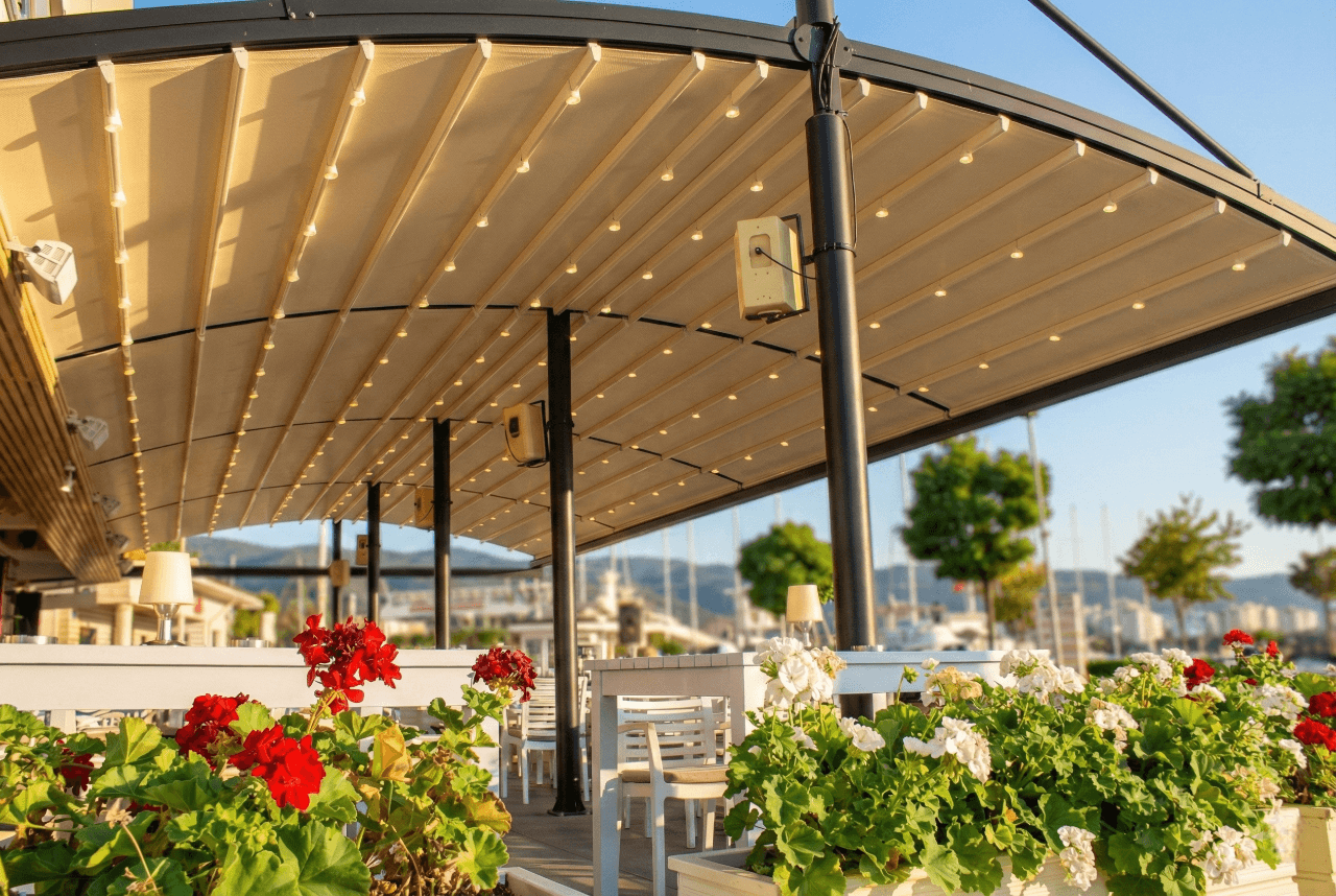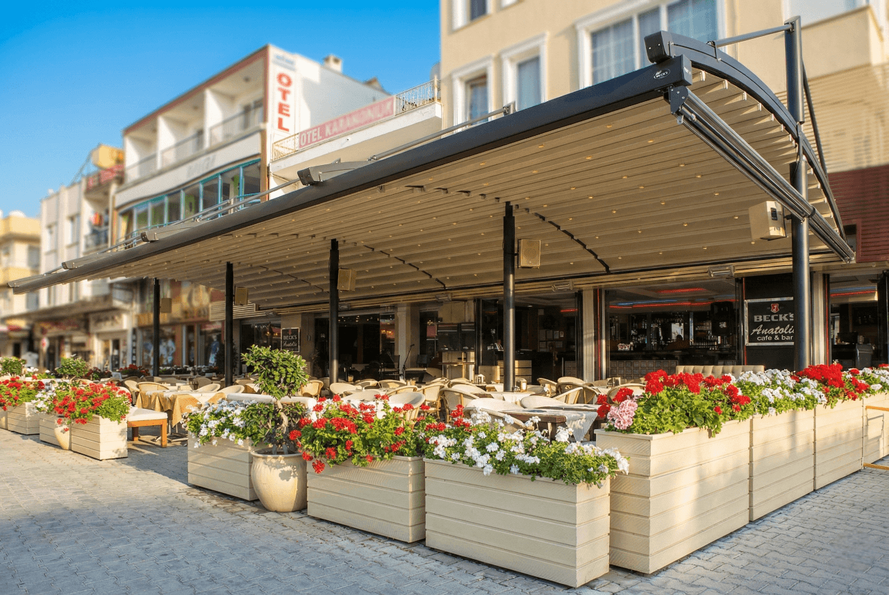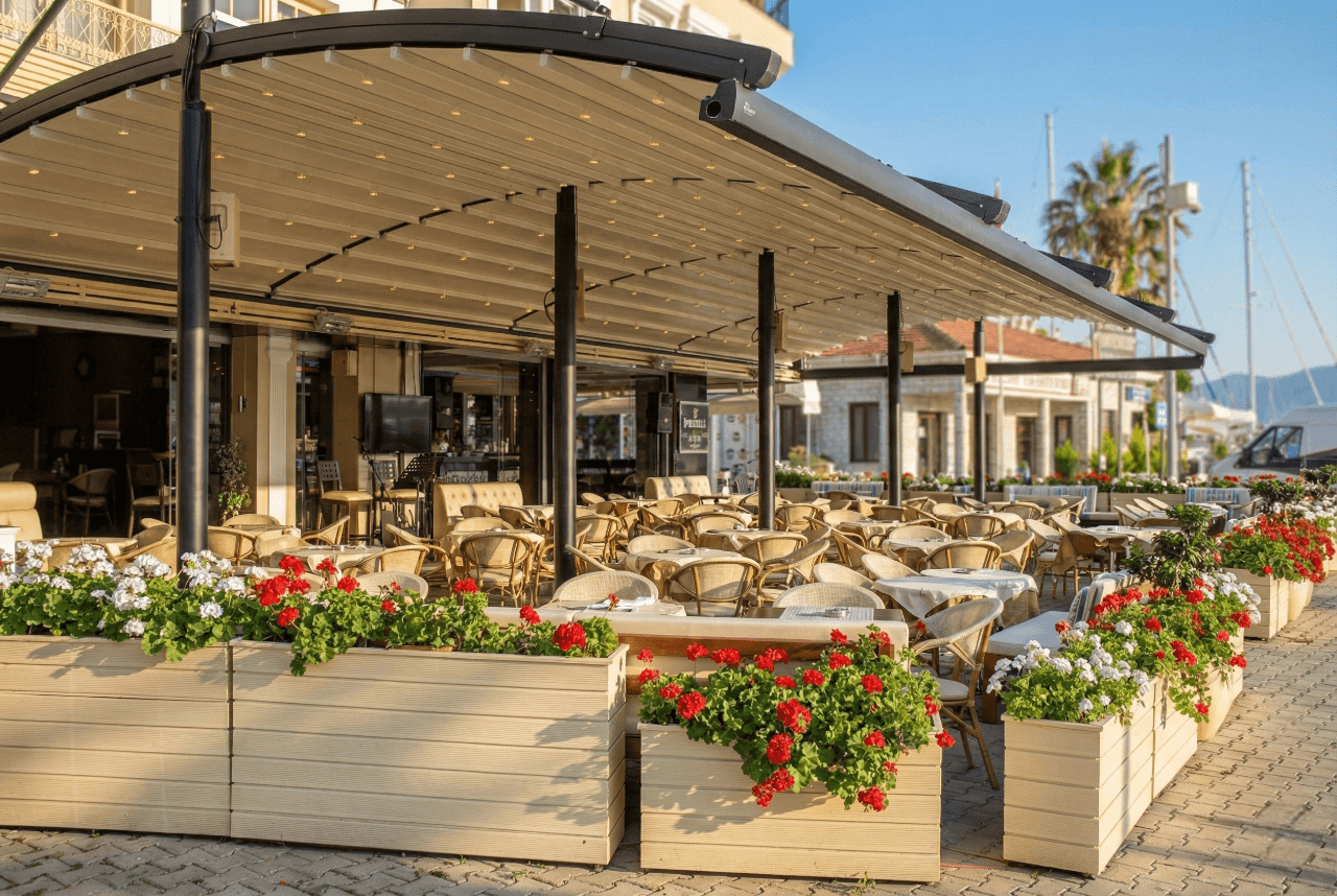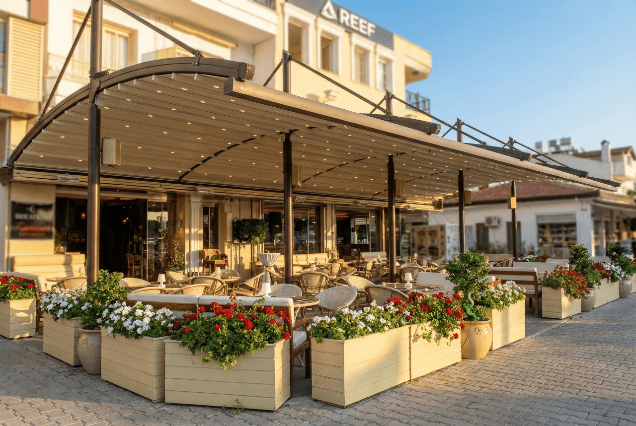 Anatolia Bar’ın o büyüleyici sahil şeridinde, çiçeklerle bezeli terası ve radius modelin zarafeti birleşince ortaya Marmaris’in en çok tercih edilen buluşma noktalarından biri çıktı. Anatolia Bar'ın o beyaz çiçek kutularıyla kavisli siyah/füme Pergola profillerinin oluşturduğu kontrast gerçekten nefes kesici. Yat limanından geçen herkesin dönüp bir daha baktığı bu proje, Selçuk Tente'nin estetik vizyonunun Marmaris'teki en güzel yansımalarından biri oldu. Siz de mekanınıza mimari bir imza atmak ve Pergola modellerimizi online sipariş ile incelemek için sitemizi ziyaret edebilirsiniz: