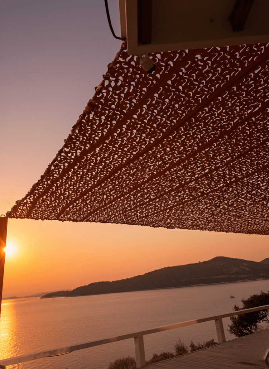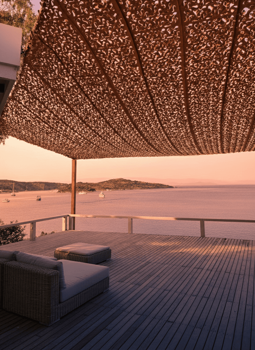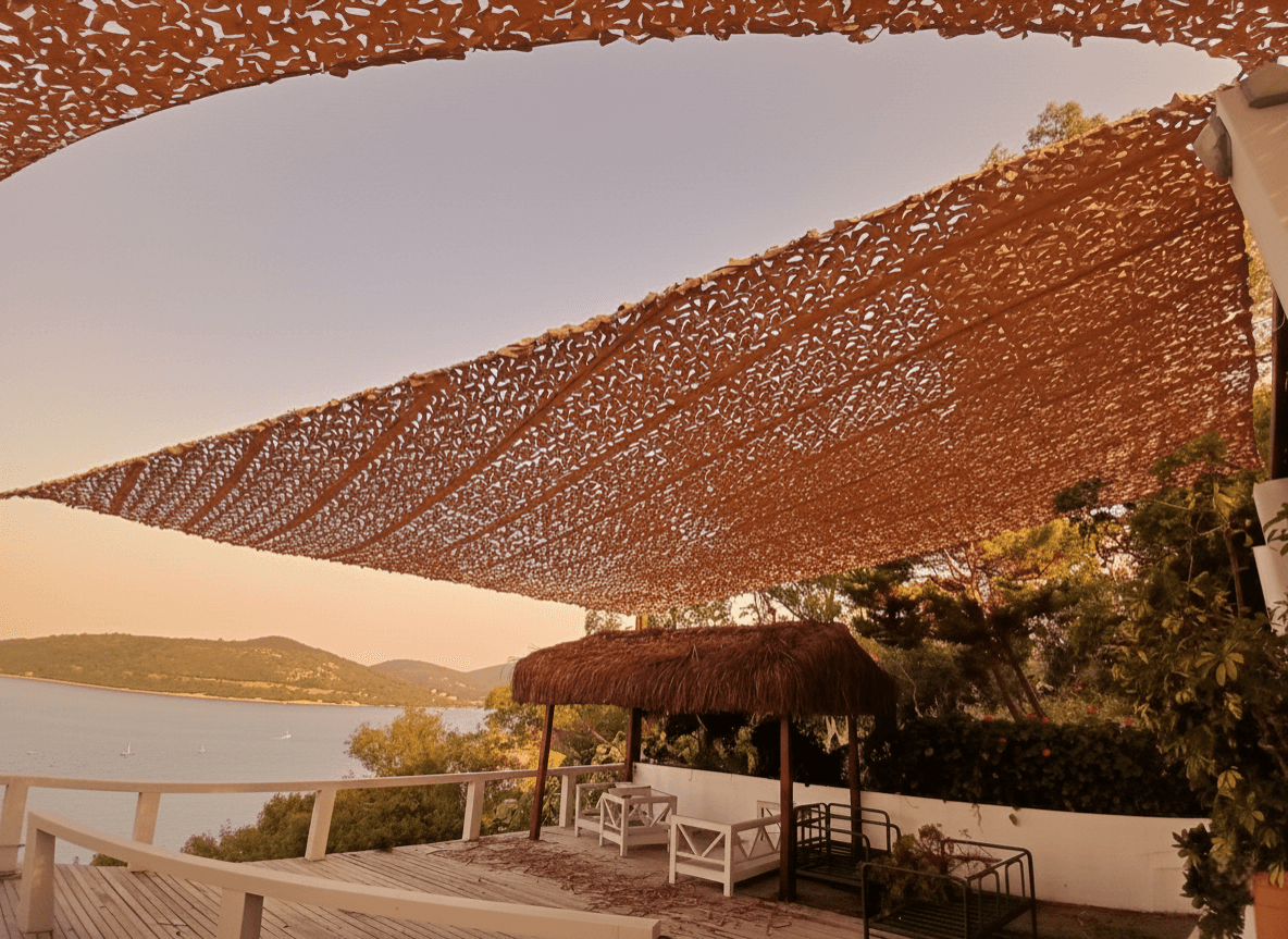 Bodrum’un merkezine ve denize yürüme mesafesinde bulunan, misafirlerine butik bir hizmet sunan Beste Otel’ in açık hava ortak alanları için estetik bir dönüşüm gerçekleştirdik. Sabit Tente iskeleti üzerine uyguladığımız Kamuflaj Tente sistemi, otelin genel ambiyansına modern bir kimlik kazandırdı. Bodrum’un yakıcı güneşini filtreleyen ancak ferahlığını kesmeyen lazer kesim "S" gözenekler, rüzgarın kumaş içinden akışını sağlayarak yırtılma ve deformasyon riskini minimize eder. Tamamen kapalı tavan sistemlerinin aksine, bu model otel misafirlerine nefes alan, gölge desenlerinin zeminde dans ettiği şık bir atmosfer sağlar. Sistemin dayanıklılığı, özel radansa bağlantıları ve güçlendirilmiş dikiş tekniklerimizle yapılandırılmıştır. Kurulum işlemleri; radansalı, vidalamalı ve çelik halat bağlama ile gerdirmeli montaj yöntemlerimizle yapılarak, her türlü hava koşuluna karşı dirençli bir dış mekan alanı oluşturulmuştur.