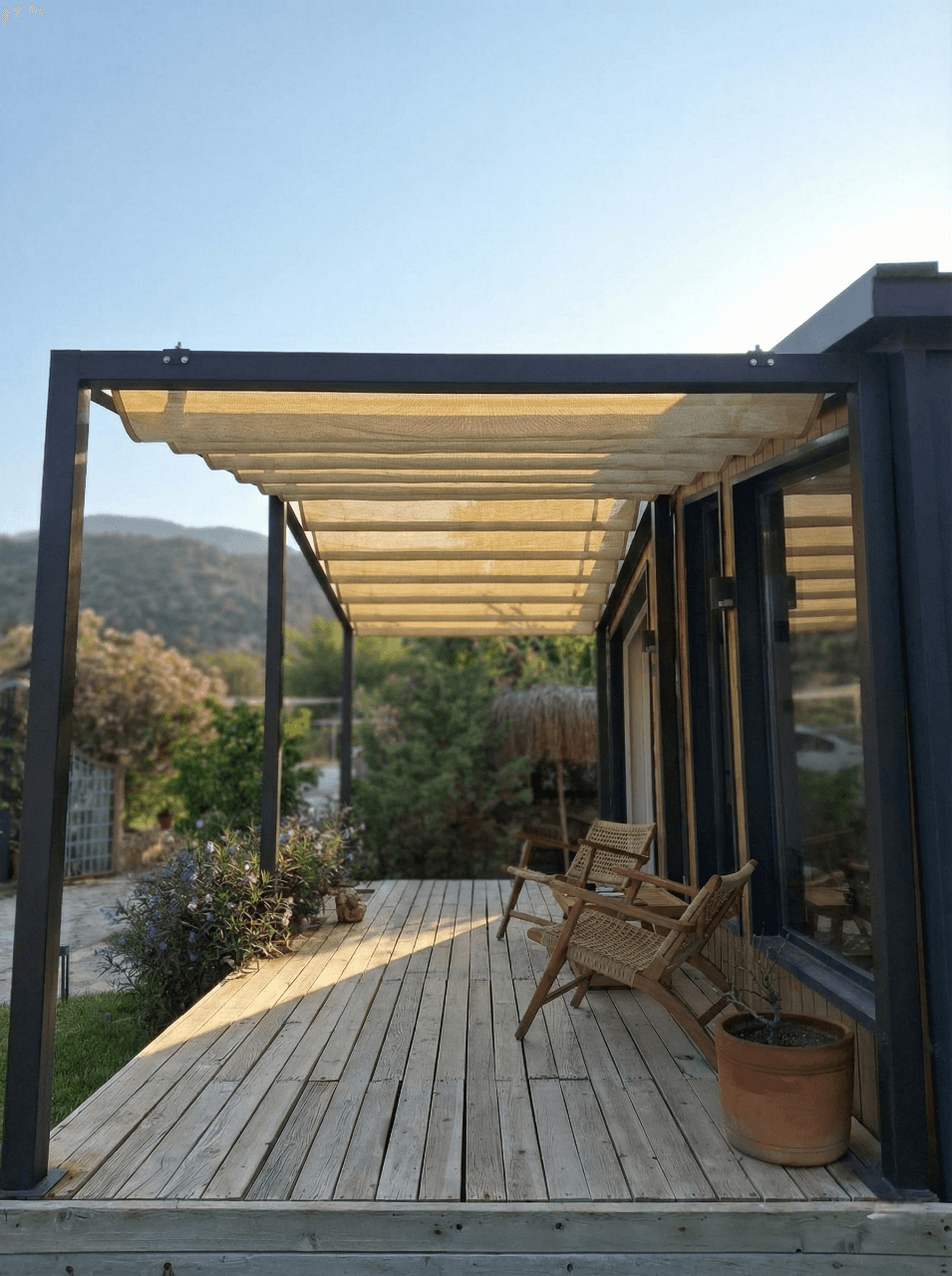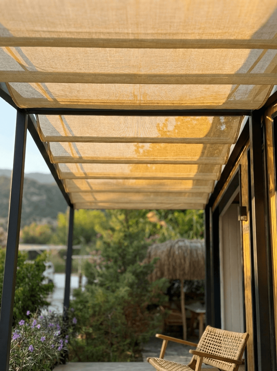 Ege ve Akdeniz’in kucaklaştığı, rüzgarın kekik koktuğu Datça Kargı’da; Bizim Ev’in sıcak ve samimi atmosferine Selçuk Tente dokunuşu. Doğallığın ön planda olduğu bu özel projede, karmaşadan uzak, yalın bir konfor alanı yarattık. Telli Tente Sistemimiz, bu minik ama ruhu büyük mekanın ahşap mimarisiyle kusursuz bir uyum yakaladı. Tercih ettiğimiz Screen Kumaş, Datça’nın o meşhur berrak gökyüzünün altında sade ve tertemiz bir hat oluşturuyor. Krom halatlar üzerinde bir tüy hafifliğiyle hareket eden akordiyon sistemimiz, misafirlere diledikleri an güneşin tadını çıkarma, diledikleri an ise o "harika gölgeye" sığınma özgürlüğü sunuyor. Fotoğraflardaki o yumuşak ışık geçişleri, kumaş kalitemizin ve doğru projelendirmenin bir eseri. Doğanın içinde, ev sıcaklığında bir gölge keyfi.