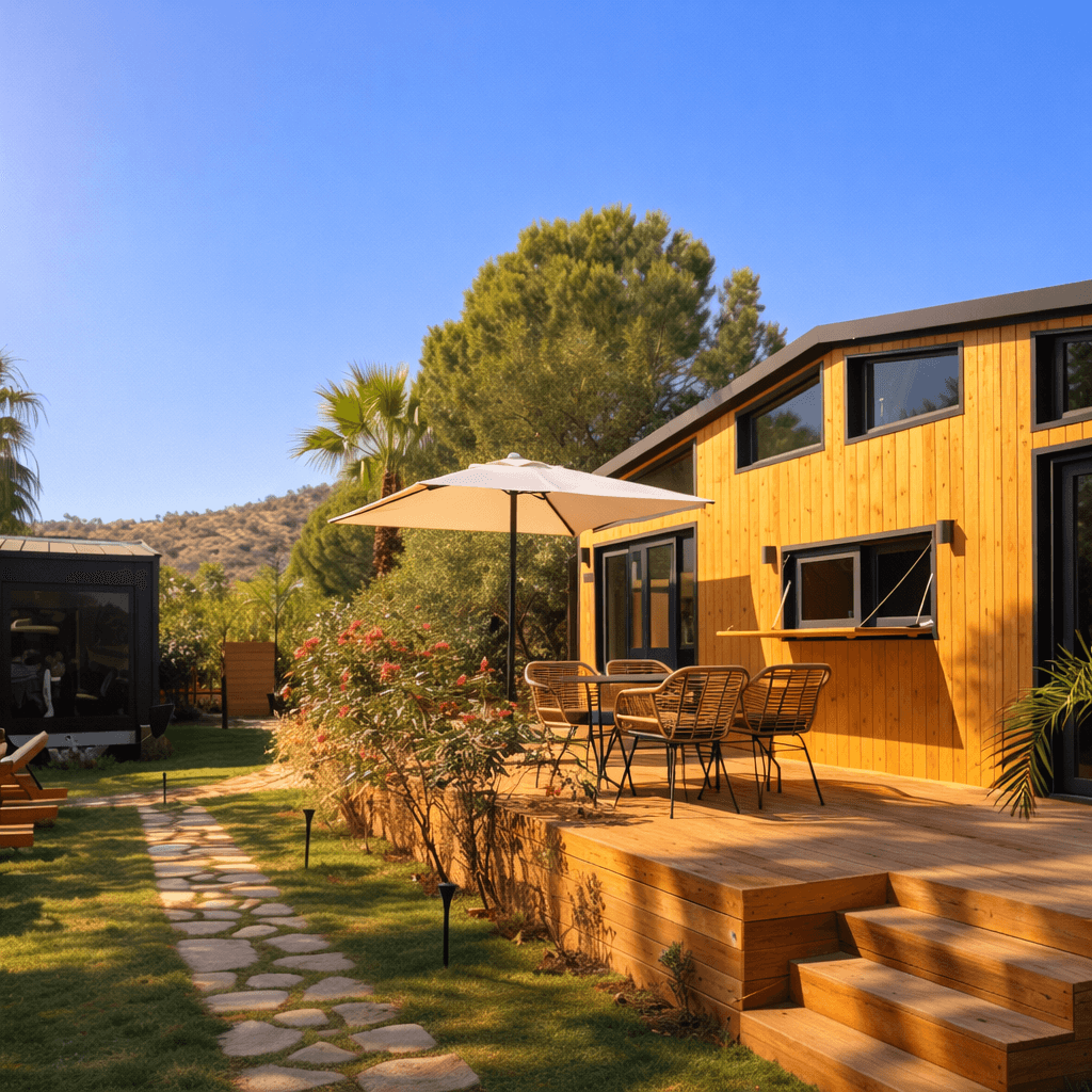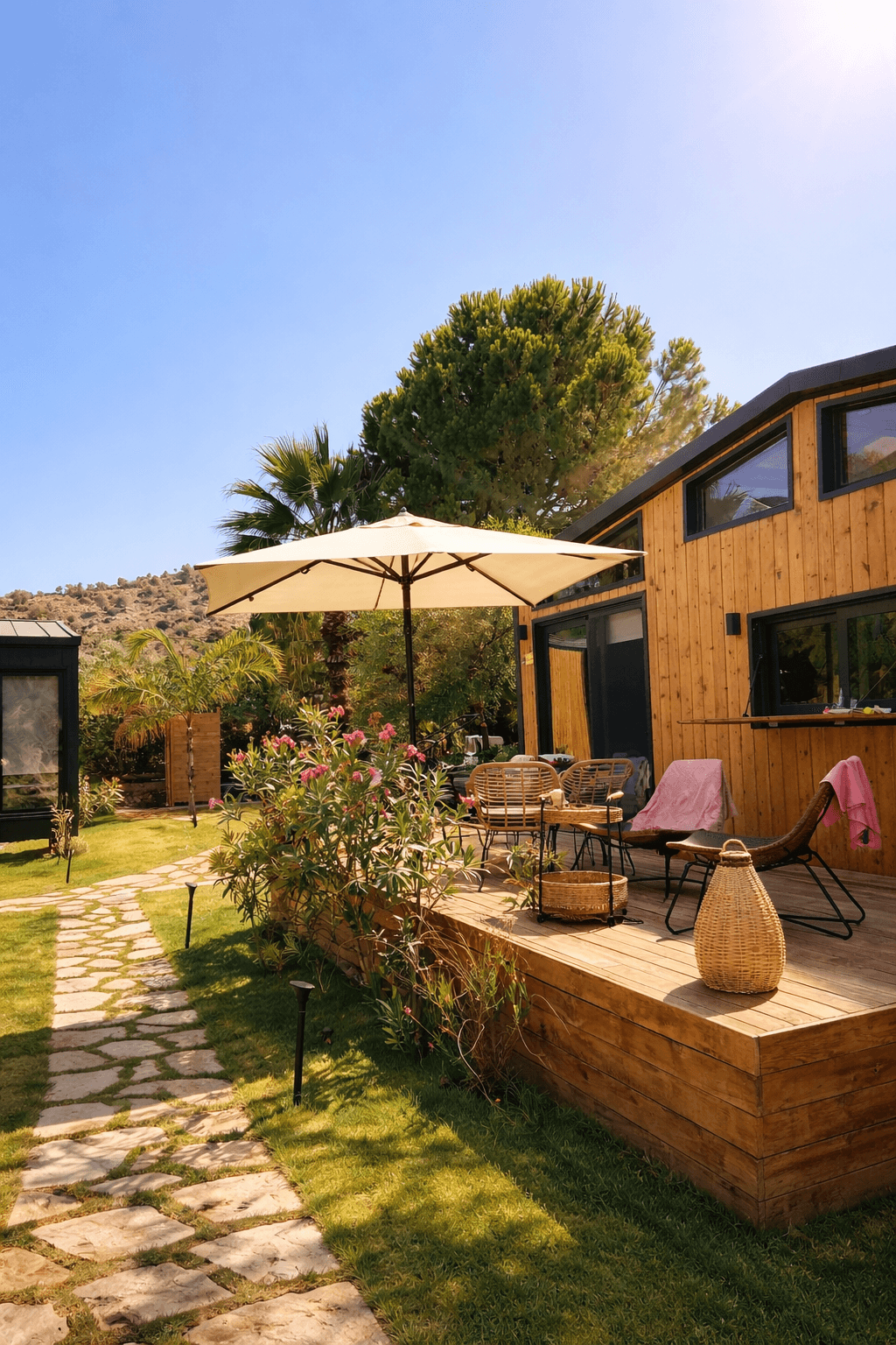 Datça’da konumlanan Bizim Ev Datça’ nın açık yaşam alanlarında, güneşten korunma ve uzun süreli dış mekân konforu sağlamak amacıyla 50 Serisi – 250x250 Kare Şemsiye tercih edilmiştir. 50 mm çapındaki güçlü alüminyum orta borusu ve tamamı alüminyumdan oluşan taşıyıcı sistemi sayesinde şemsiye, sahil ve rüzgâra açık Datça iklim koşullarında yüksek stabilite ve dayanıklılık sunar. 250x250 cm kare ölçüsü, özel konut ve butik işletmelerde dengeli gölge alanı oluşturarak kullanım konforunu artırır. Kilitlemeli açma-kapama mekanizması ise günlük kullanımda pratik ve güvenli bir çözüm sağlar.