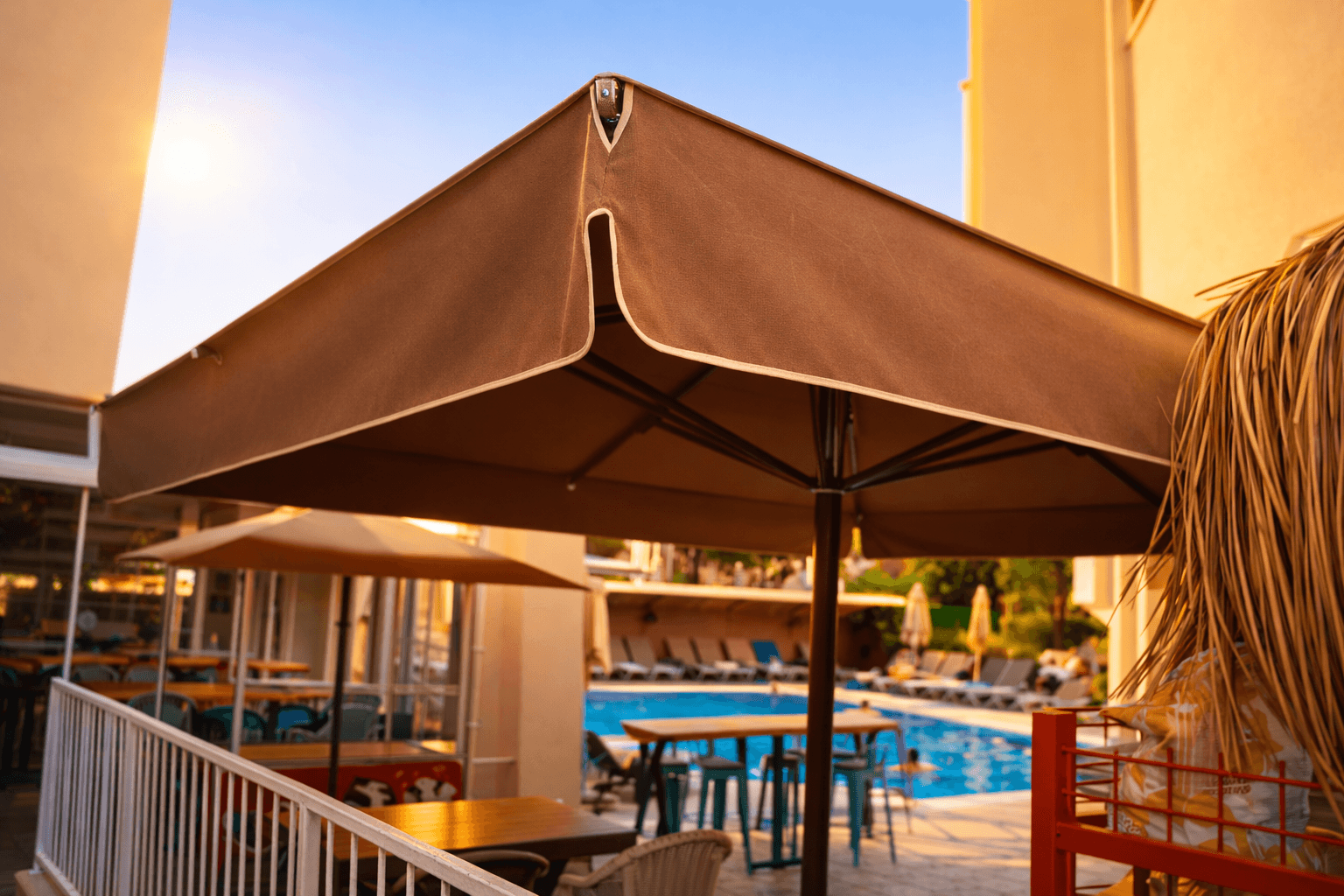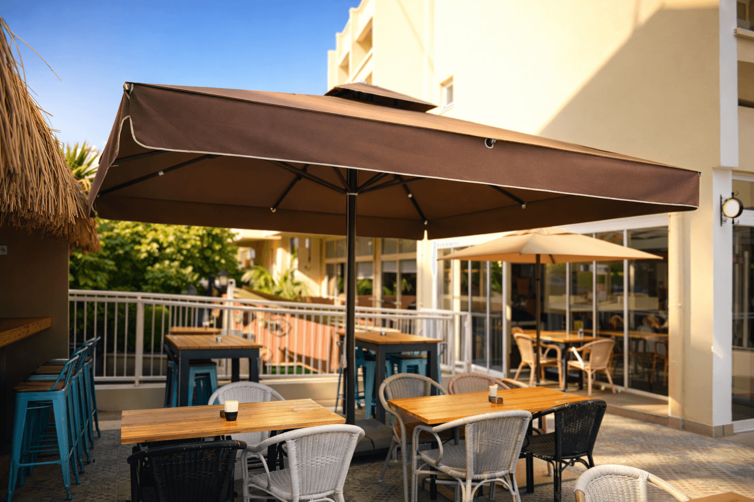 Şehir içi konumu ve samimi atmosferiyle öne çıkan Blue Place, açık alan düzeninde konforu ve fonksiyonelliği merkeze alan bir yerleşim sunuyor. Kafe ve oturma alanlarında tercih edilen 70 Serisi – 400×400 Kare Şemsiye, geniş kare formu sayesinde birden fazla masa grubunu tek bir gölgelendirme altında toplayarak ferah ve düzenli bir kullanım alanı oluşturuyor. Büyük ölçüsü, gün boyu değişen güneş açılarında kesintisiz gölge konforu sağlıyor.
