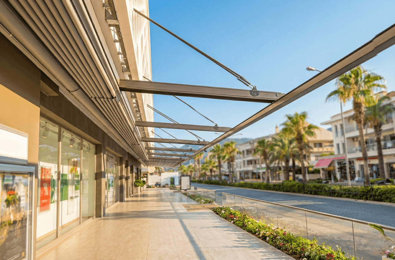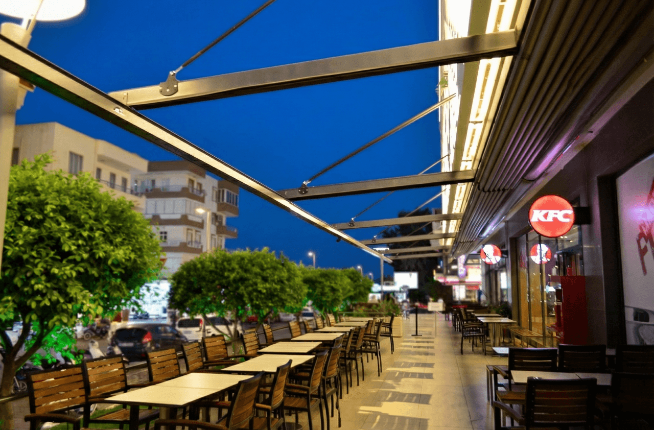 Marmaris’ in en prestijli noktalarından Blue Port AVM çevresindeki sosyal alanlar için, mimari estetiği ve kullanım özgürlüğünü en üst seviyeye çıkaran Askılı Sistem Pergola (Raylı Tente) projemizi hayata geçirdik. Çok uzun ve geniş mekanların kapatılmasında karşılaşılan "ayak kalabalığı" sorununa, zemine basmayan özel askılı konstrüksiyonumuzla profesyonel bir çözüm sunduk. Blue Port projesinde Selçuk Tente uzmanlığıyla fark yaratan noktalar şunlardır: