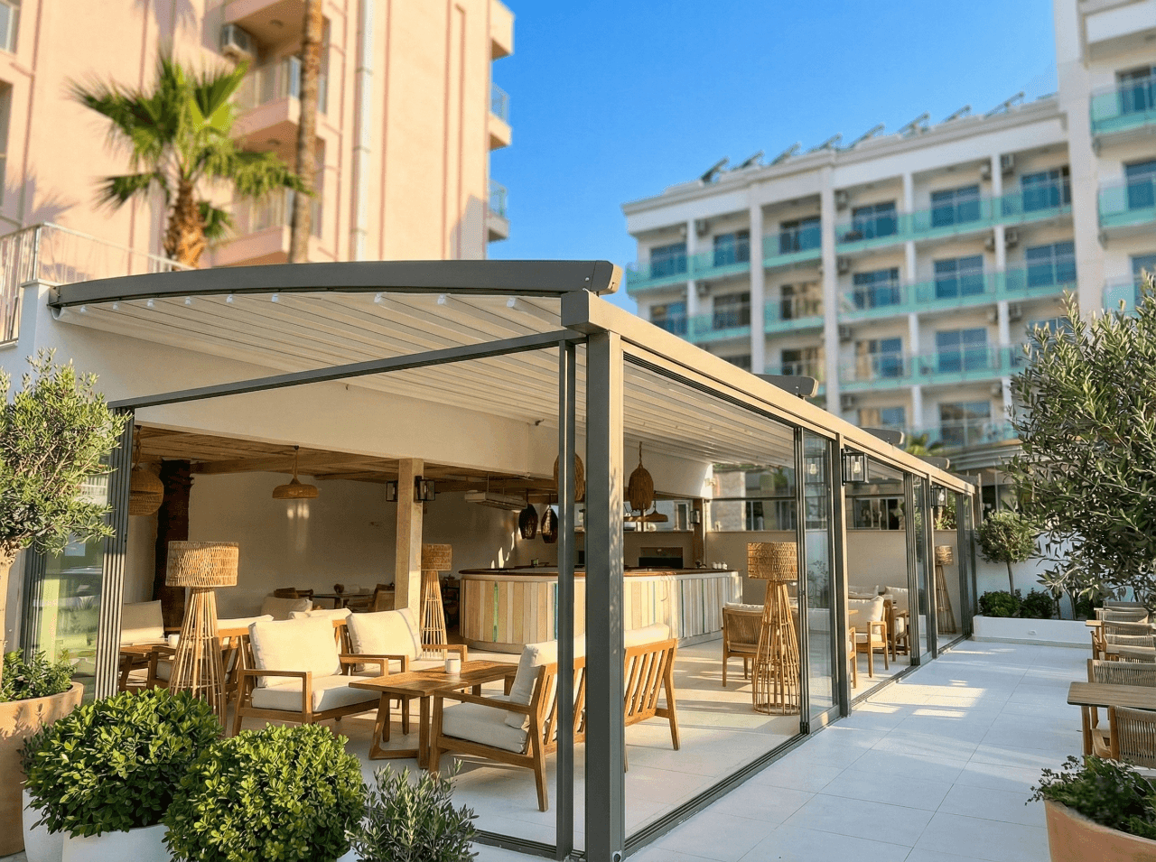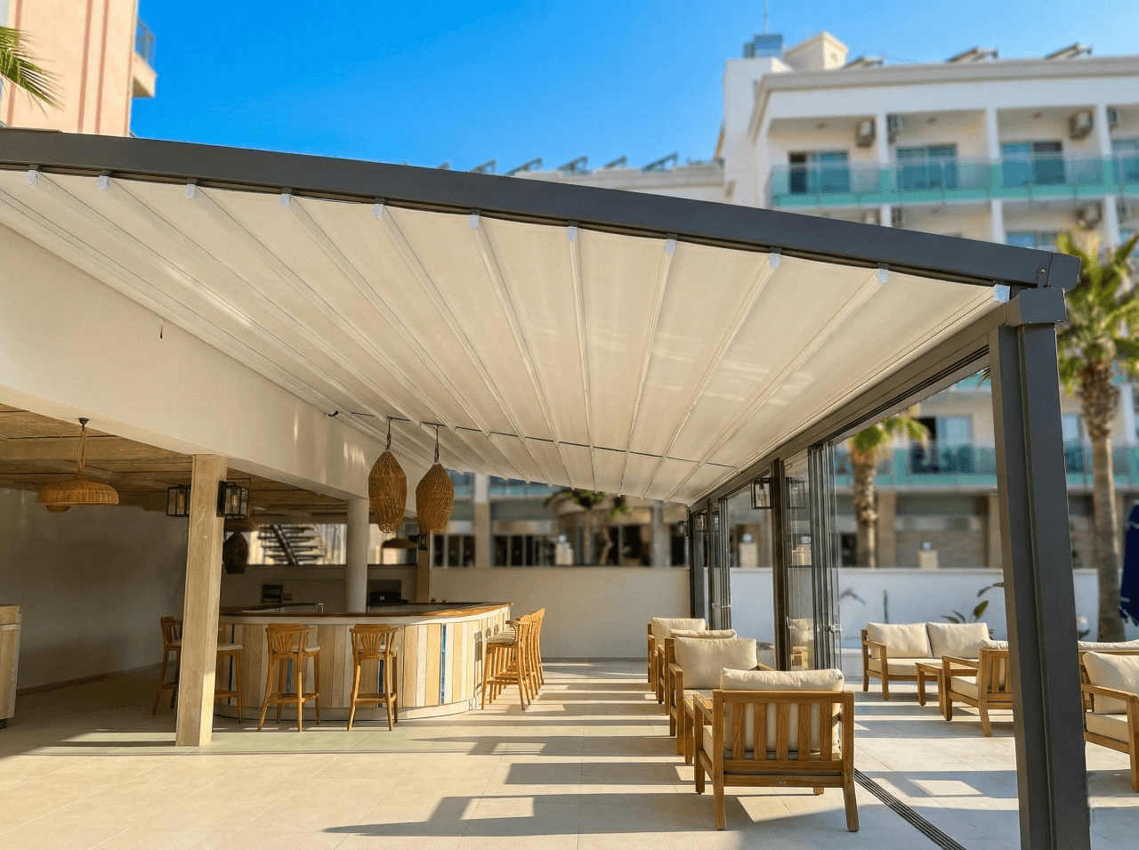 Marmaris’ in prestijli tesislerinden Bluebays Otel’ in modern mimarisini, Selçuk Tente’ nin tasarım ödüllü Radius Pergola (Raylı Tente Sistemi) ile taçlandırdık. Otelin teras ve dinlenme alanlarına muazzam bir hacim ve estetik katan bu kavisli sistem, misafirlerin kendilerini hem doğanın içinde hem de saray konforunda hissedeceği bir atmosfer yarattı. Blue Bays Otel projesinde öne çıkan ayrıcalıklar şunlardır:,