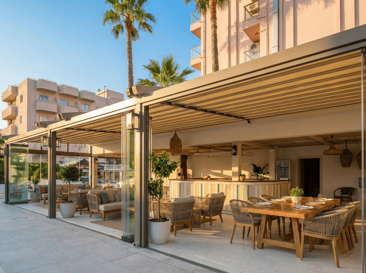 • Entegre LED Aydınlatma Şıklığı: Kavisli profillere gömülen özel LED ışıklar, akşam saatlerinde otel bahçesinde büyüleyici ve prestijli bir ambiyans yaratarak davetkar ruhunu pekiştirir.