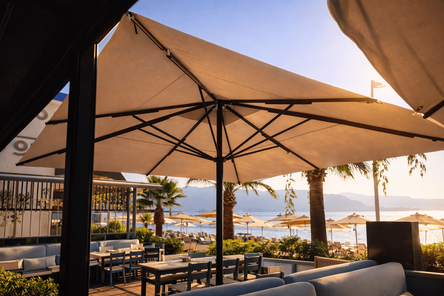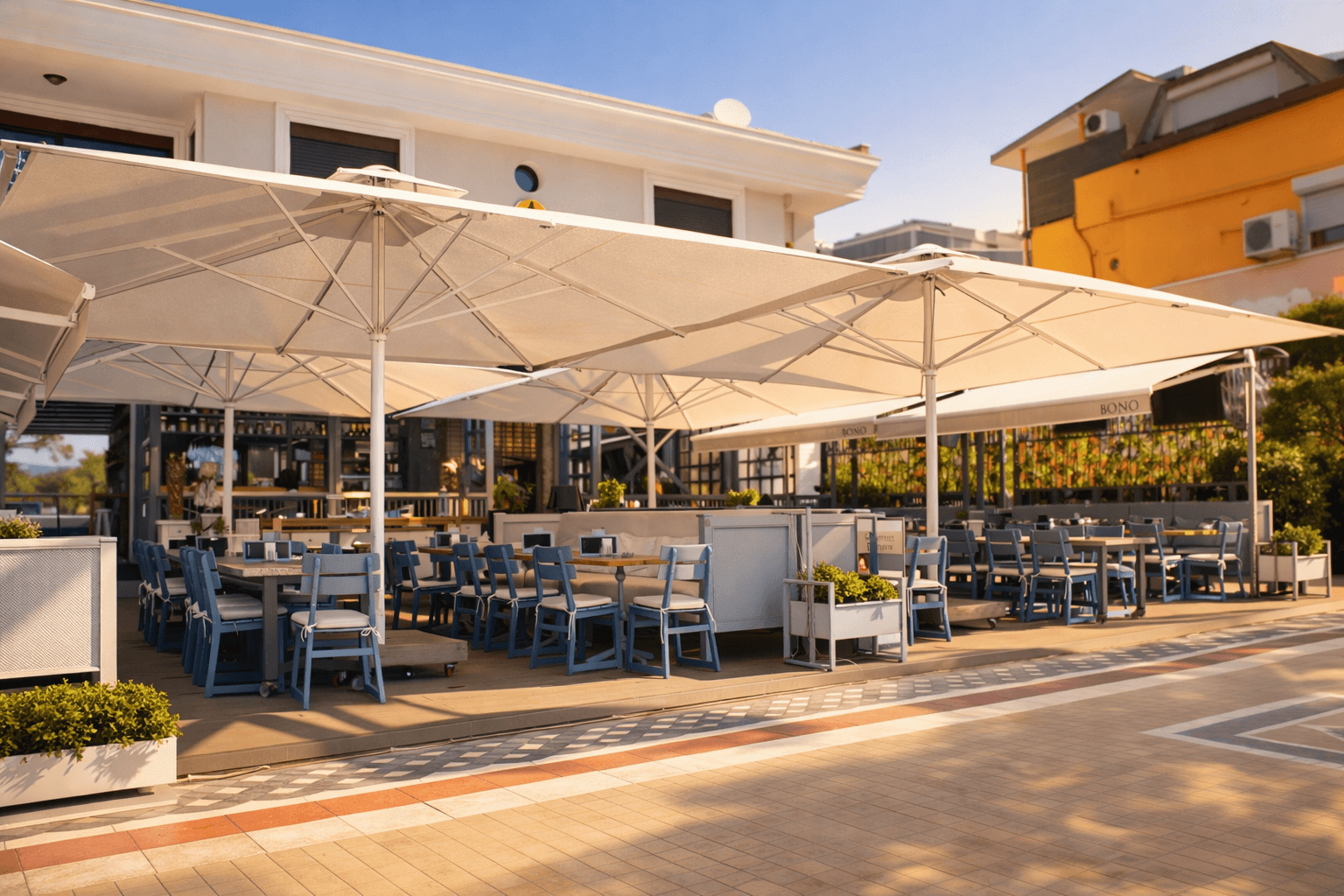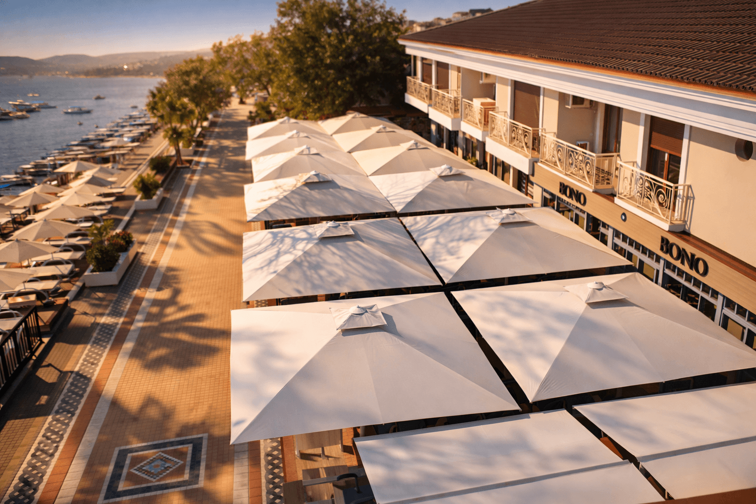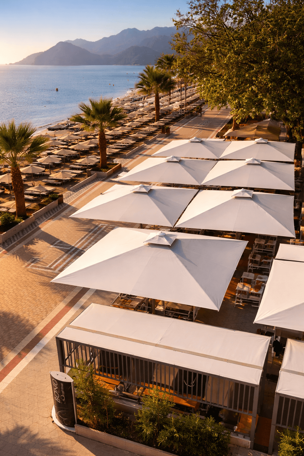 Marmaris sahil hattında konumlanan Bono Beach, gün boyu yoğun güneş alan plaj ve beach-club düzeniyle yüksek performanslı gölgelendirme çözümlerine ihtiyaç duyar. Bu kapsamda uygulanan 99 Serisi – 500×500 Kare Şemsiye, geniş kare formu sayesinde şezlong ve oturma alanlarını tek bir gölgelendirme altında toplayarak mekâna düzenli ve güçlü bir görünüm kazandırır.
