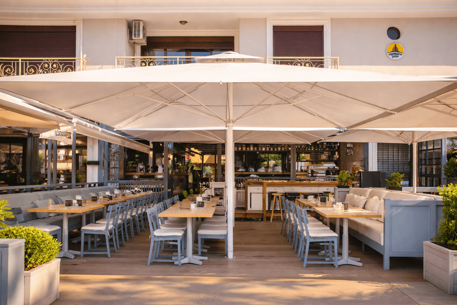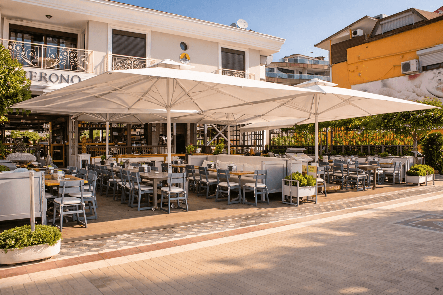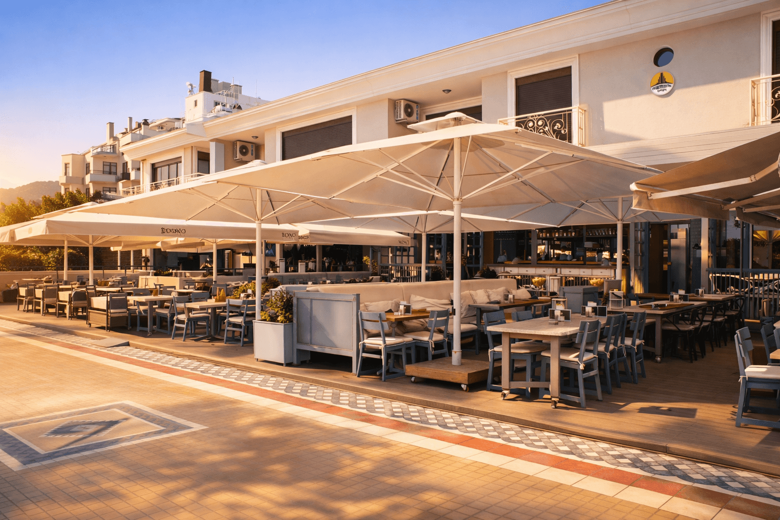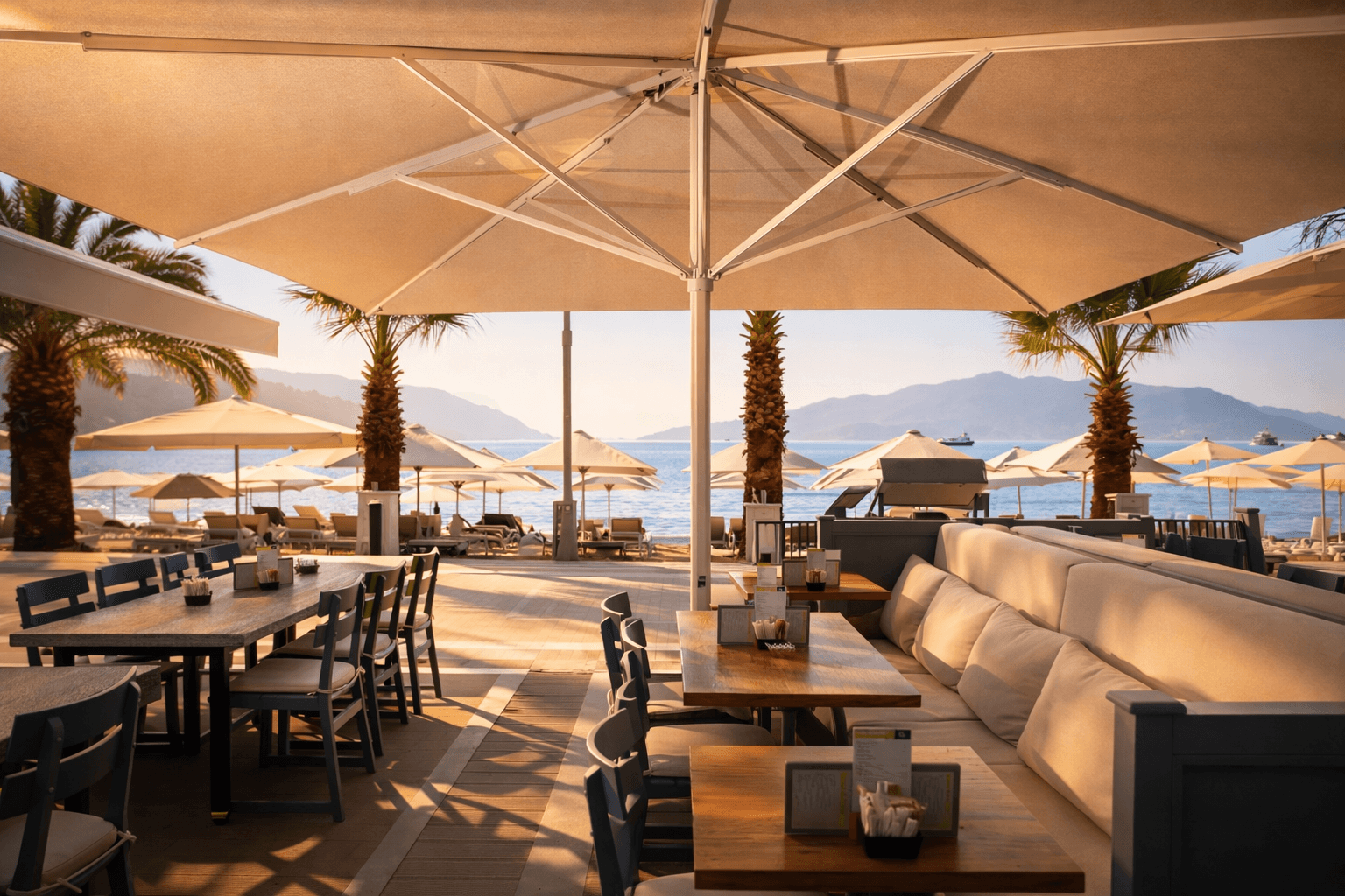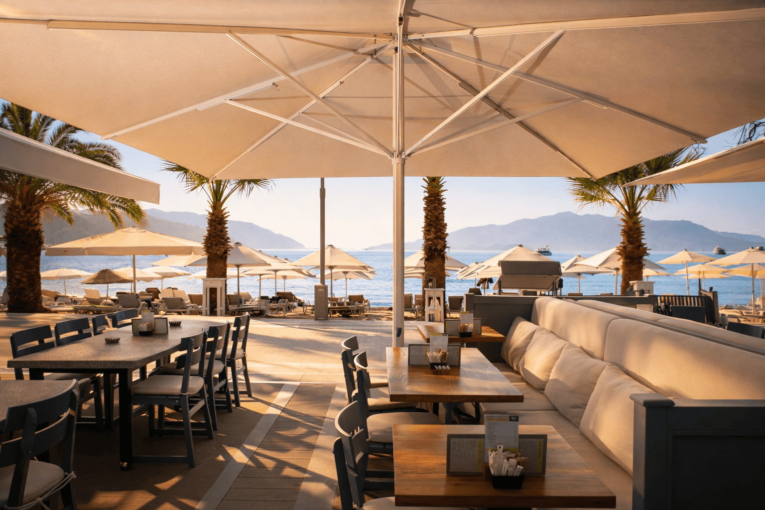 Marmaris sahil hattında konumlanan Bono Beach, gün boyu yoğun güneş alan plaj ve beach-club düzeniyle yüksek performanslı gölgelendirme çözümlerine ihtiyaç duyar. Bu kapsamda uygulanan 99 Serisi – 500×500 Kare Şemsiye, geniş kare formu sayesinde şezlong ve oturma alanlarını tek bir gölgelendirme altında toplayarak mekâna düzenli ve güçlü bir görünüm kazandırır.