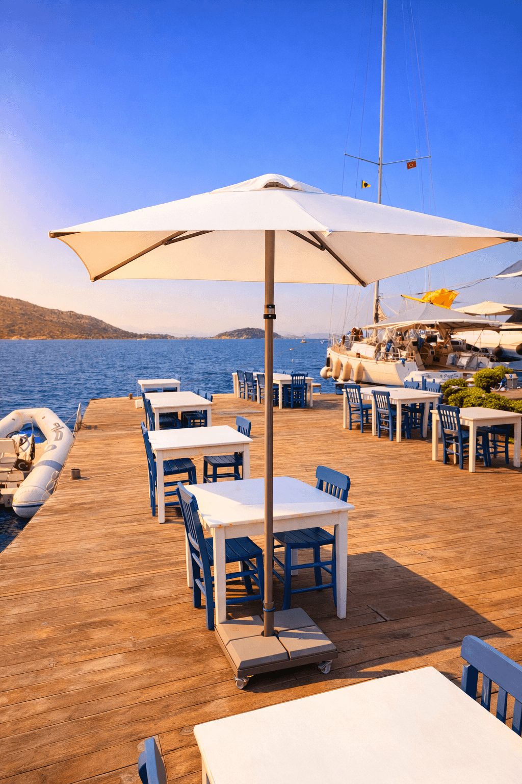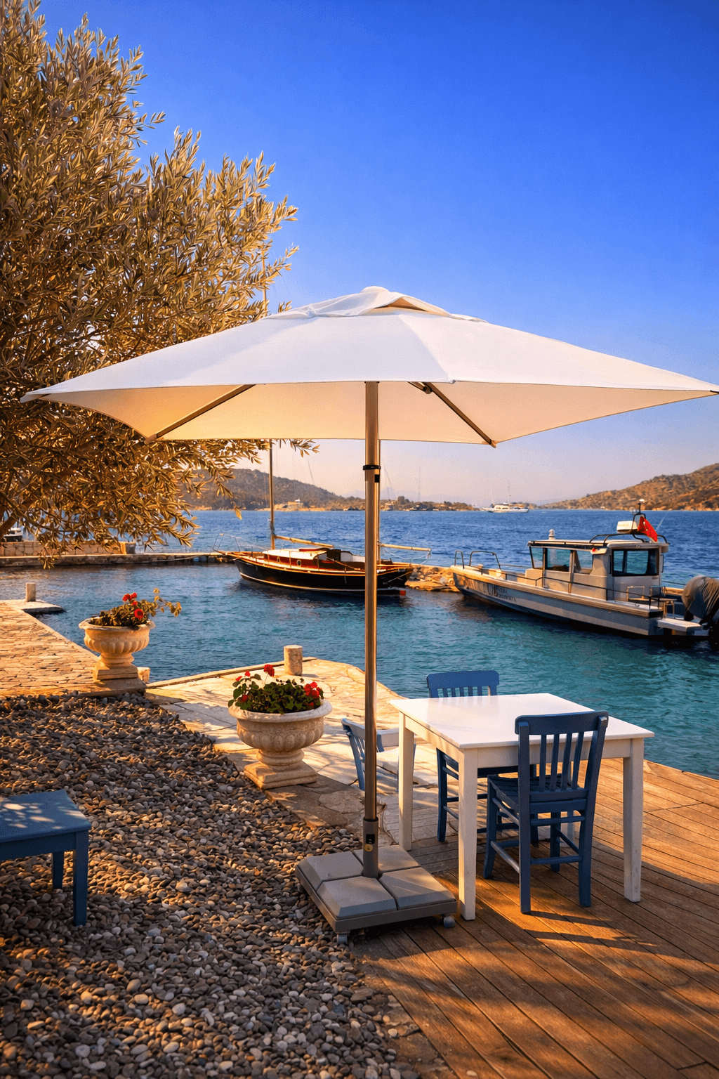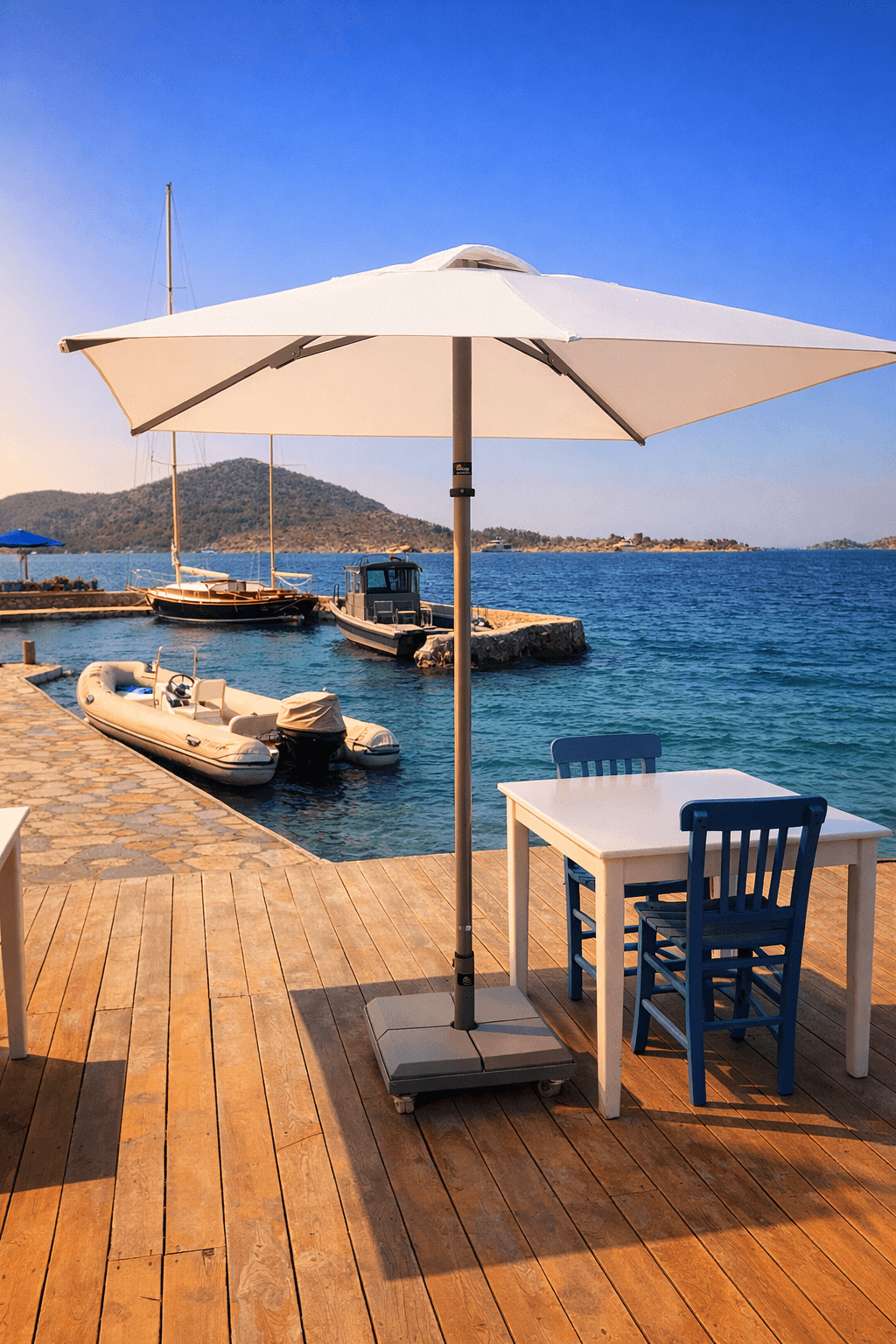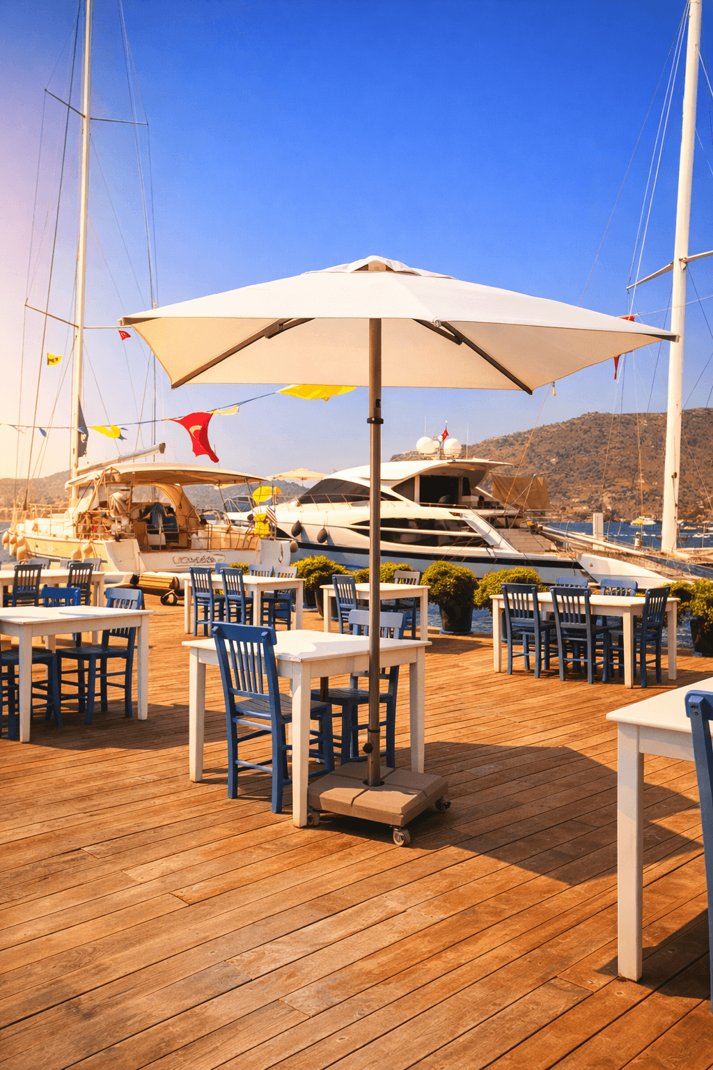 Yatch Club’ın denize sıfır oturma alanlarında tercih edilen 50 Serisi 200x200 Kare Şemsiyemiz, Bozburun’un sakin ve sofistike ruhunu tamamlayan zarif bir gölgelendirme çözümü sunuyor. Açık renk kumaşı ve net geometrisiyle deniz mavisiyle güçlü bir kontrast oluşturan ürünümüz, misafir deneyimini konforlu ve seçkin bir seviyeye taşıyor. Uzun ömürlü yapısı ve estetik duruşuyla üst segment sahil ve marina işletmeleri için ideal bir uygulamadır.