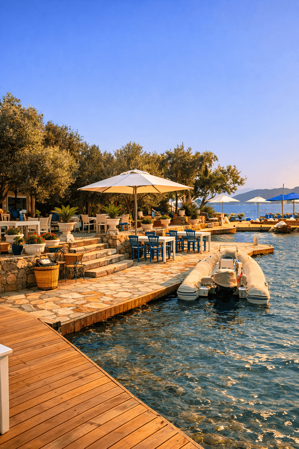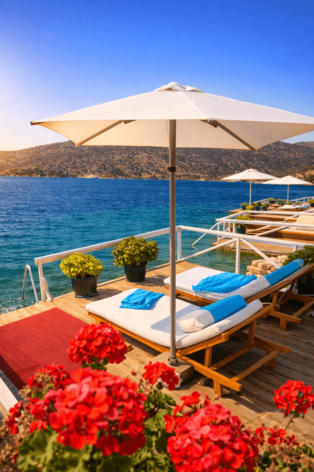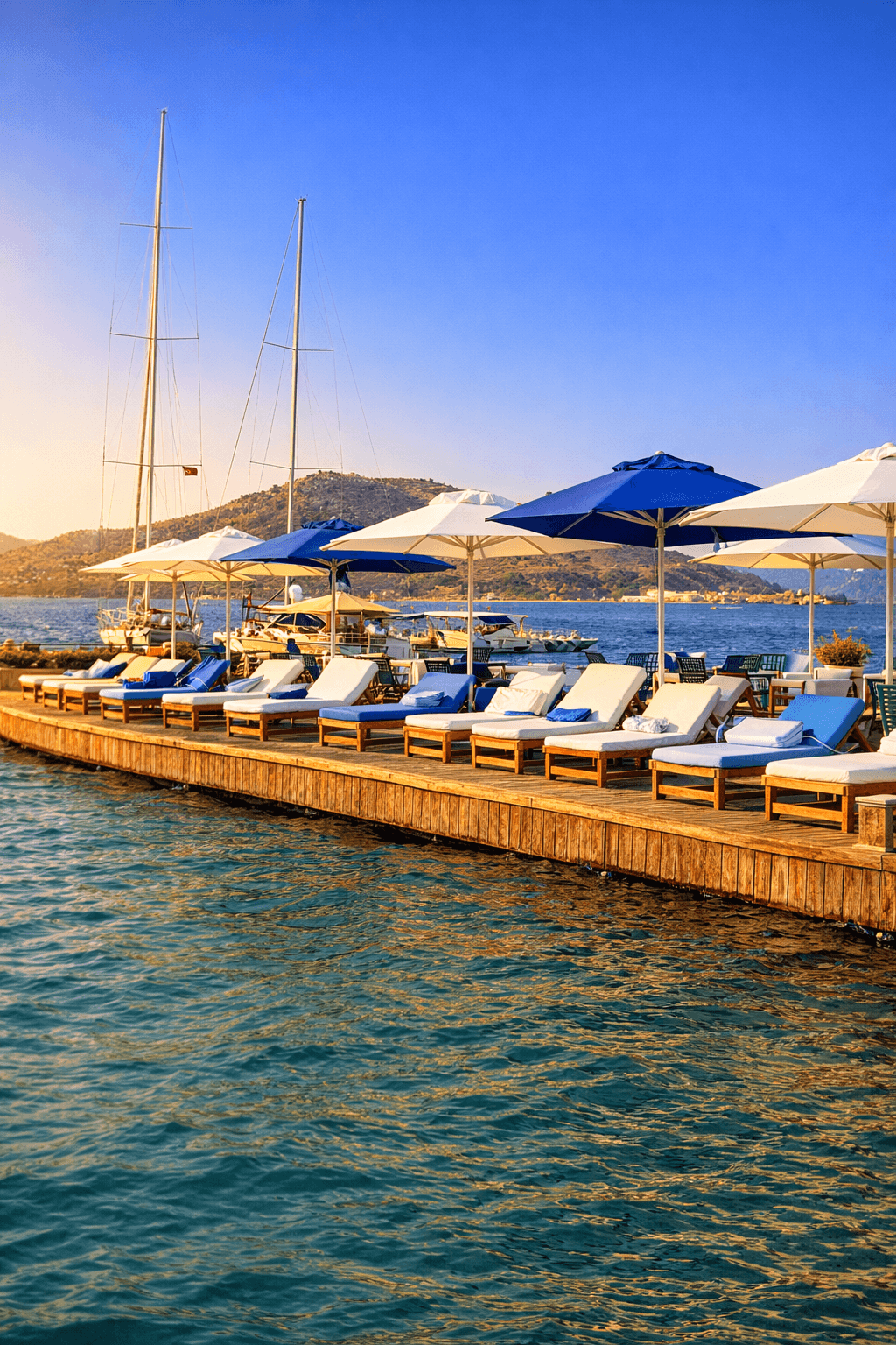 Yatch Club’ın denize sıfır oturma alanlarında tercih edilen 50 Serisi 200x200 Kare Şemsiyemiz, Bozburun’un sakin ve sofistike ruhunu tamamlayan zarif bir gölgelendirme çözümü sunuyor. Açık renk kumaşı ve net geometrisiyle deniz mavisiyle güçlü bir kontrast oluşturan ürünümüz, misafir deneyimini konforlu ve seçkin bir seviyeye taşıyor. Uzun ömürlü yapısı ve estetik duruşuyla üst segment sahil ve marina işletmeleri için ideal bir uygulamadır.