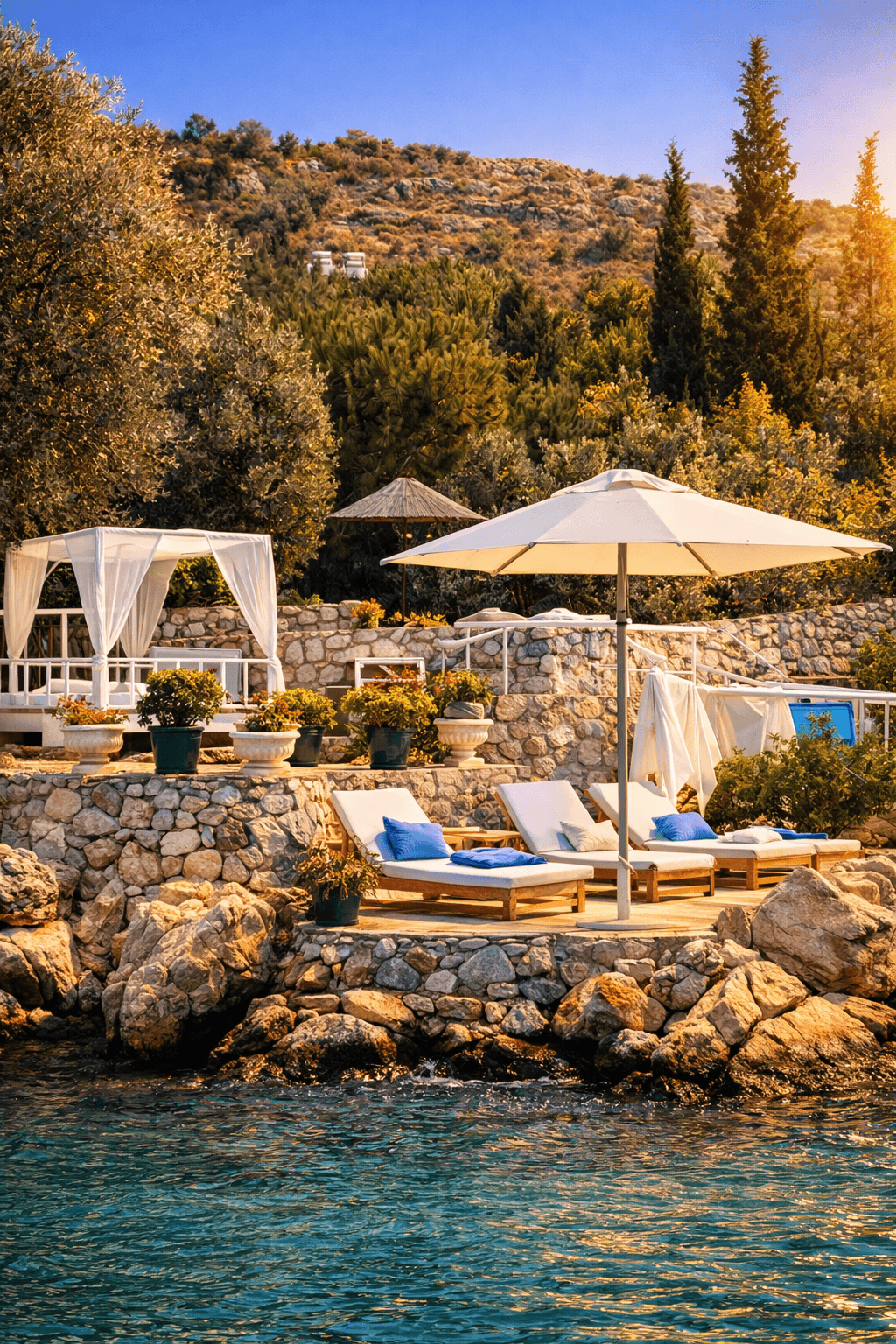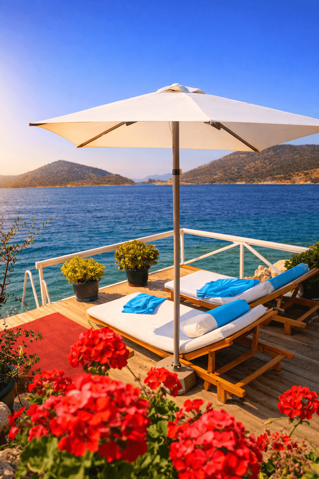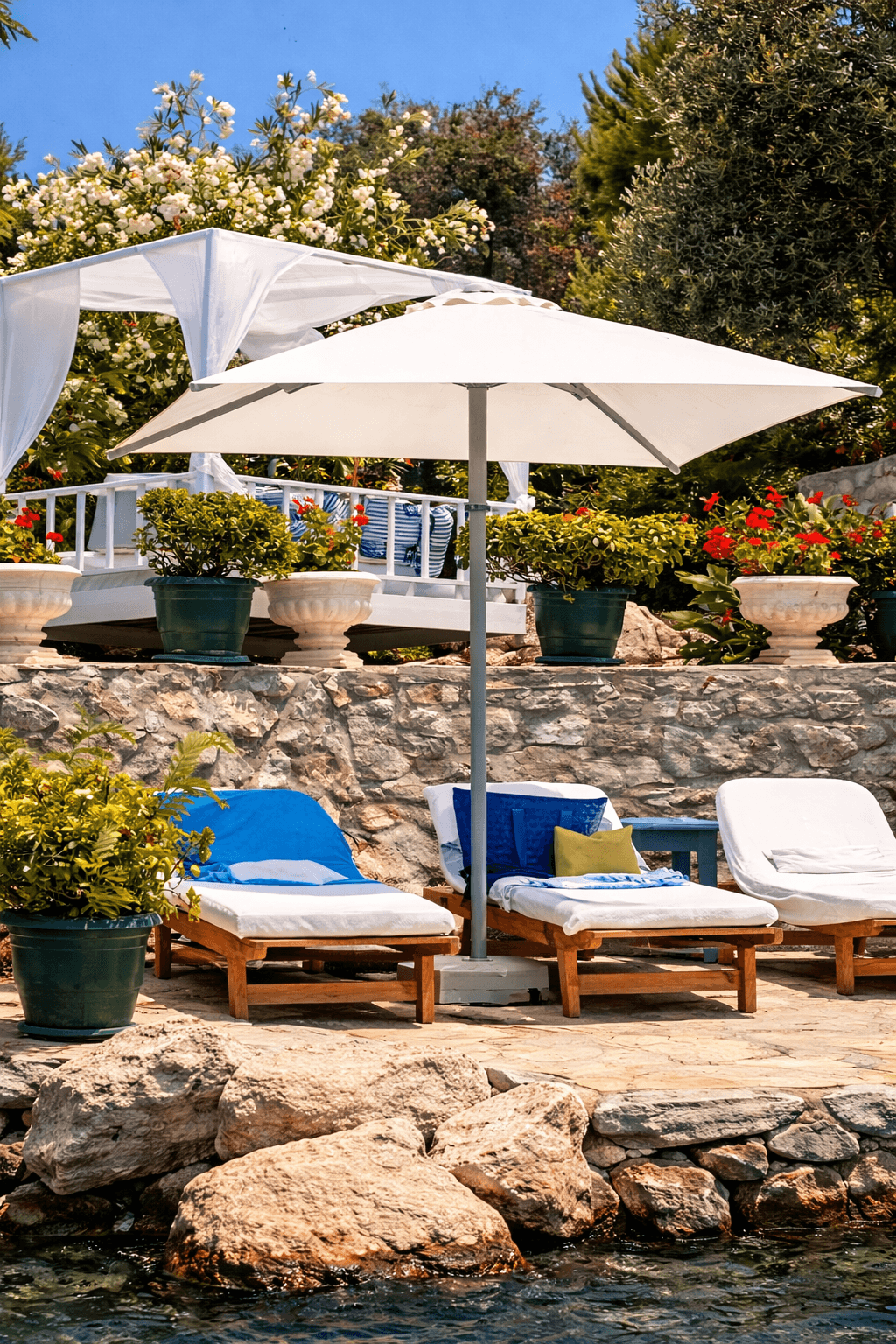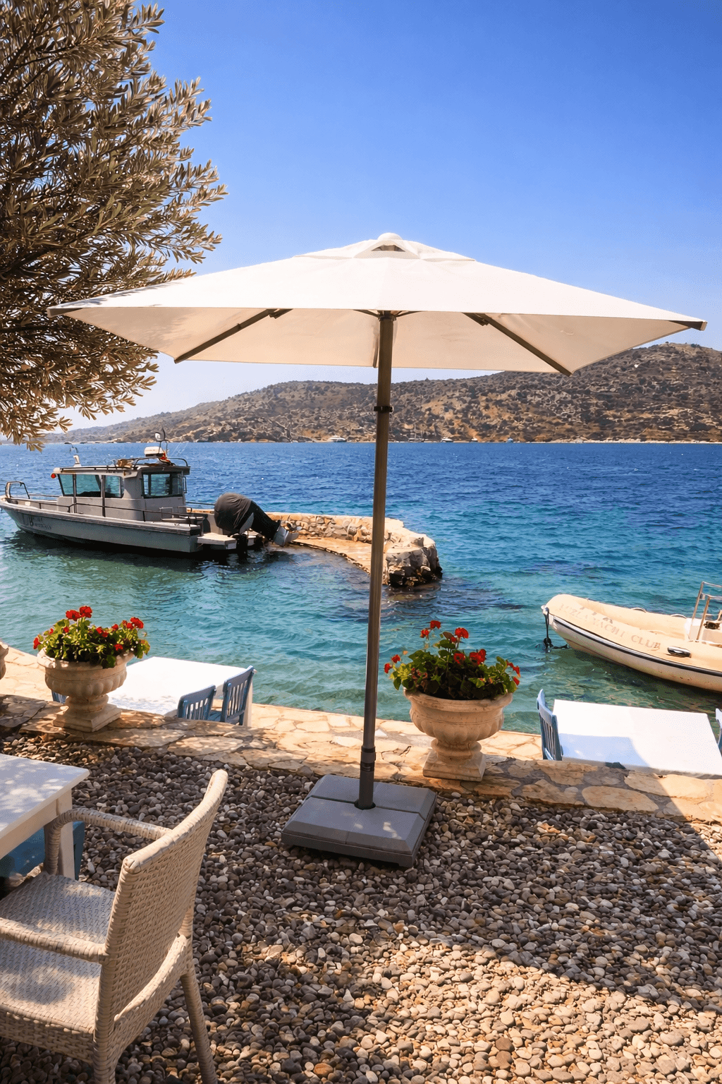 Yatch Club’ın denize sıfır oturma alanlarında tercih edilen 50 Serisi 200x200 Kare Şemsiyemiz, Bozburun’un sakin ve sofistike ruhunu tamamlayan zarif bir gölgelendirme çözümü sunuyor. Açık renk kumaşı ve net geometrisiyle deniz mavisiyle güçlü bir kontrast oluşturan ürünümüz, misafir deneyimini konforlu ve seçkin bir seviyeye taşıyor. Uzun ömürlü yapısı ve estetik duruşuyla üst segment sahil ve marina işletmeleri için ideal bir uygulamadır.