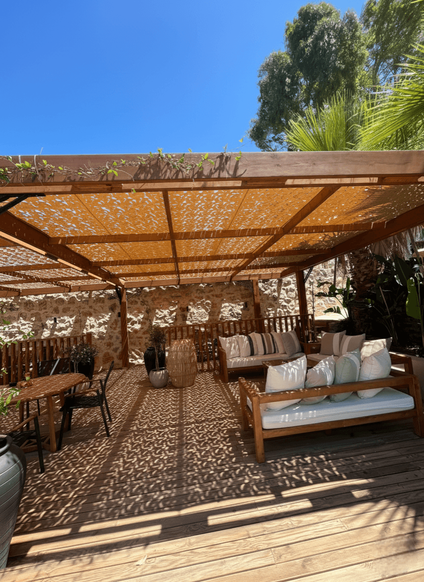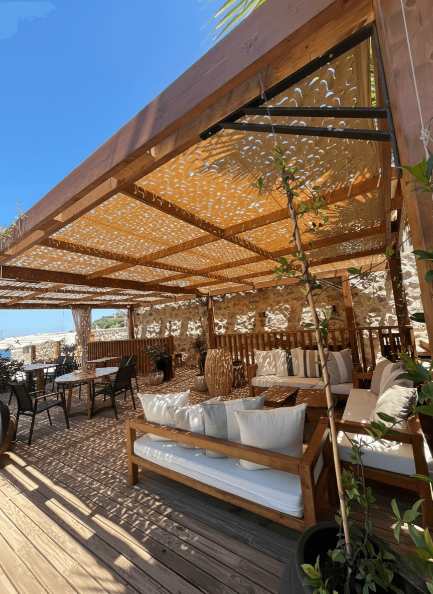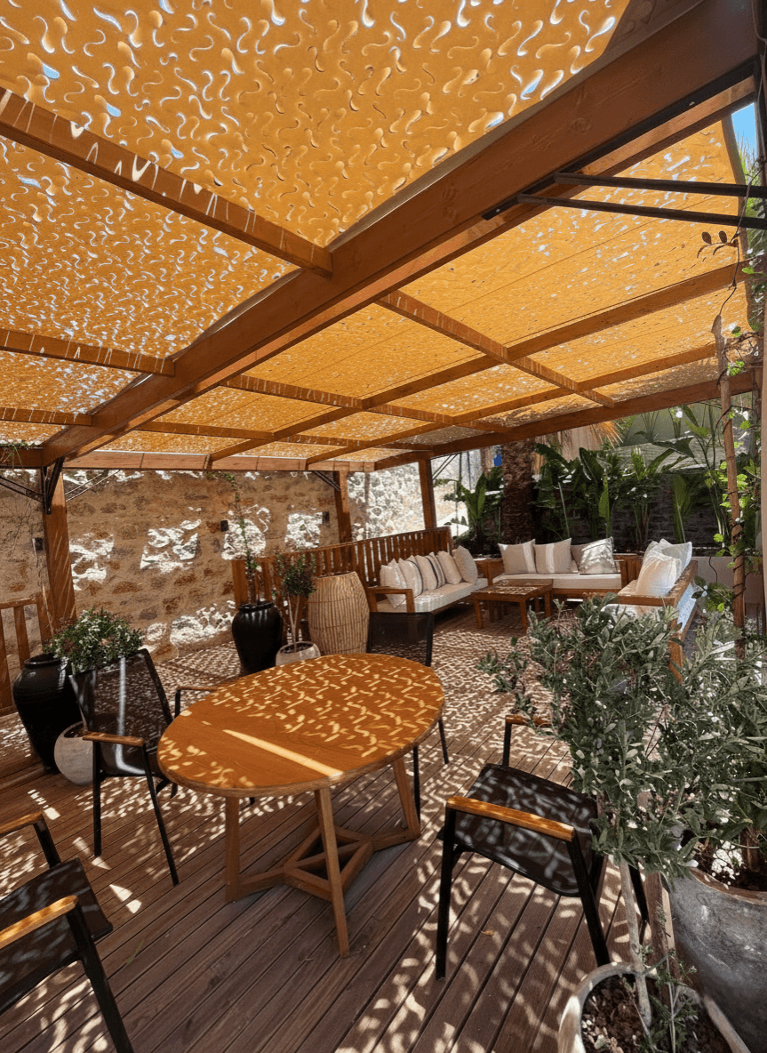 Bodrum Yalıkavak’ ın masmavi koylarında, her şey dahil konseptiyle ailelerin ve tatilcilerin vazgeçilmezi olan Cactus Hotels grubu bünyesindeki işletme için estetik bir dış mekan çözümü sunduk. Otelin geniş teras ve havuz başı dinlenme alanlarını, Sabit Tente iskeleti üzerine kurguladığımız Kamuflaj Tente modelimizle yeniledik. Lazer teknolojisiyle açılan özel "S" gözenekler, Yalıkavak’ ın o meşhur ve serinletici rüzgarının kumaşın içinden akıp gitmesini sağlar. Bu sayede rüzgar direnci minimuma inerken, kumaş hafif formunu korur ve yırtılma riski tamamen ortadan kalkar. Mekanda basık ve kapalı bir tavan yerine; misafirlerin ferah nefes alabileceği, ışığın zarif desenlerle yere düştüğü şık bir atmosfer oluşturulmuştur. Sistem, yılların tecrübesiyle geliştirdiğimiz özel emniyet kolonları ve radansa bağlantıları sayesinde sahil bandındaki sert hava koşullarında bile yapıya sarsılmaz bir şekilde tutunur.