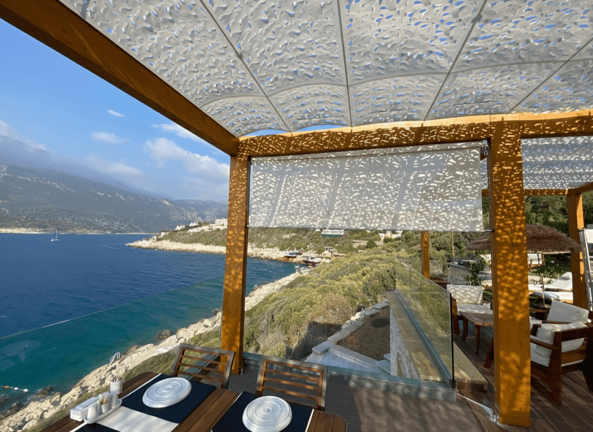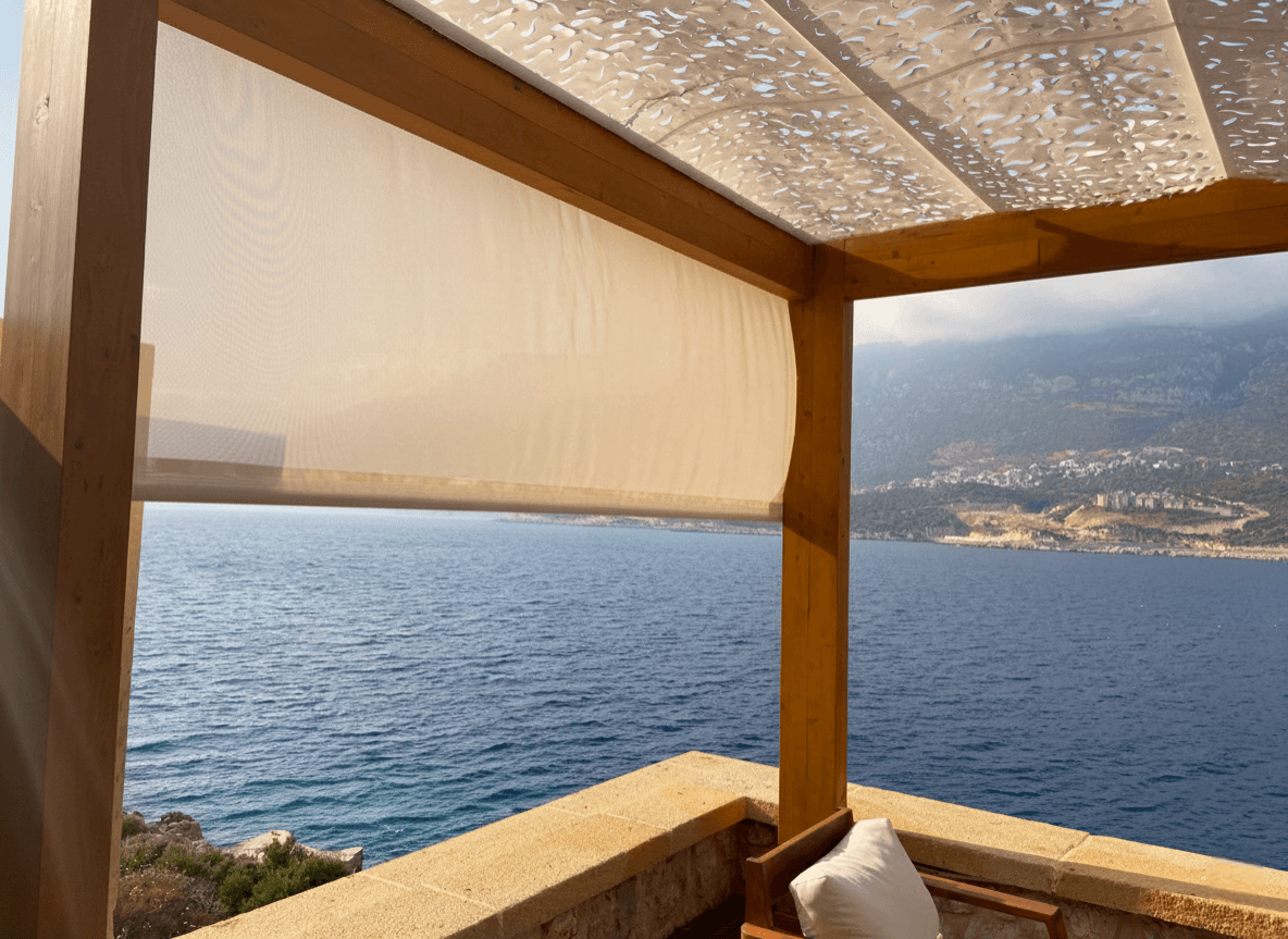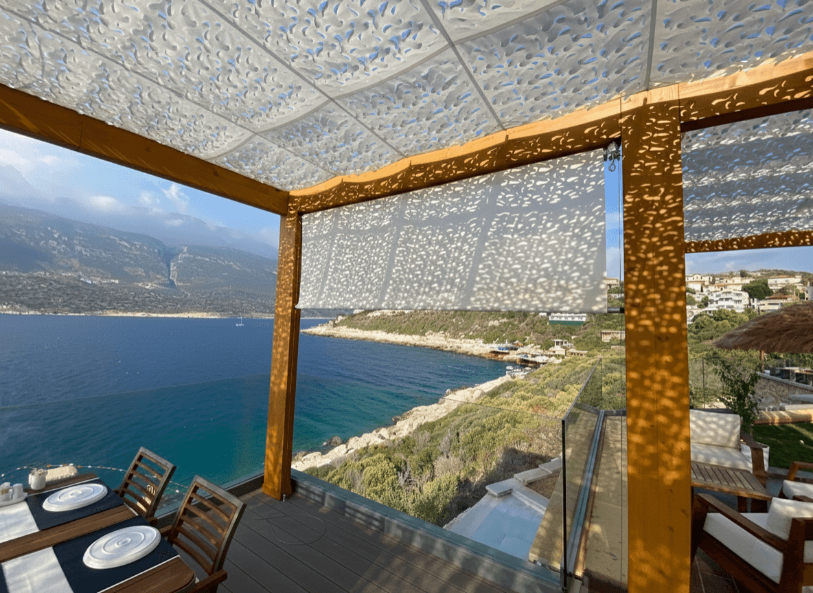 • Screen Kumaş ile Panoramik Manzara: Otelin en büyük varlığı olan Kaş manzarasının kapanmaması için Screen (delikli) kumaş teknolojisi tercih edilmiştir. Bu sayede manzara içeriden net şekilde izlenmeye devam ederken, güneşin yakıcı ısısı ve ışığı filtrelenir.