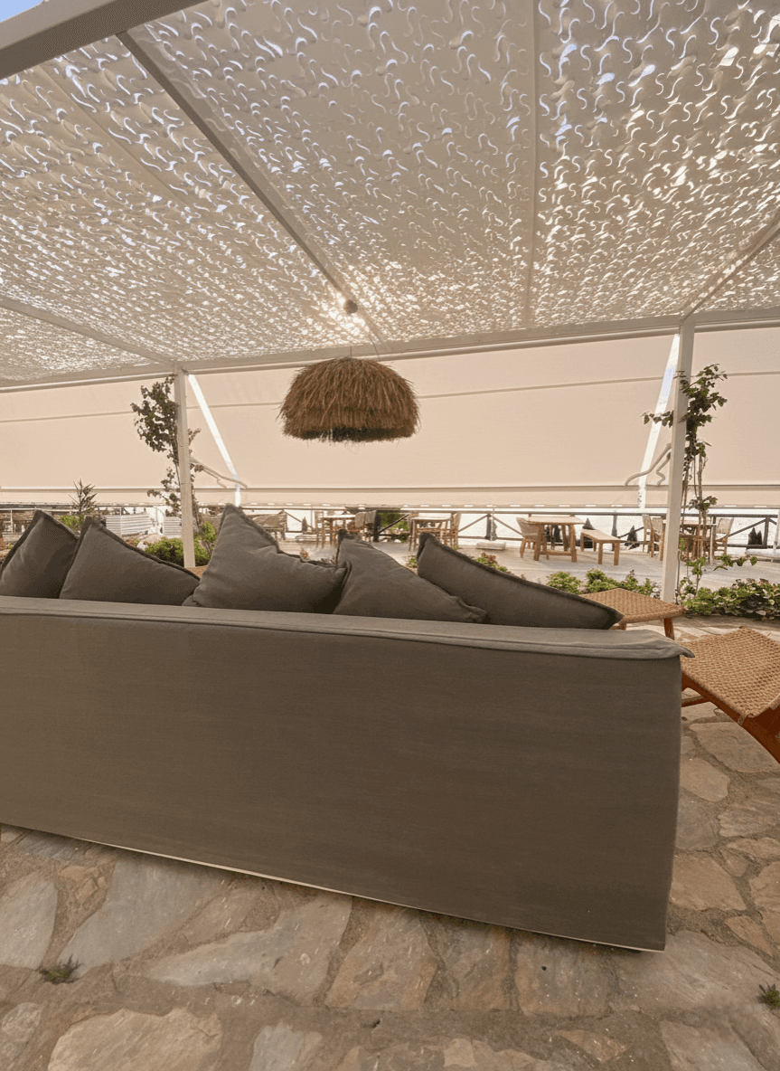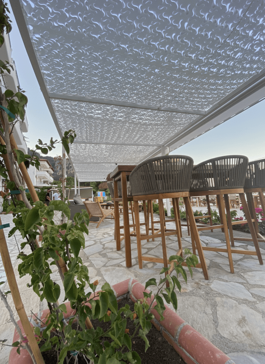 Marmaris Turunç’ un kristal berraklığındaki denizine sıfır konumda yer alan Diplomat Otel, klasik Ege tatili anlayışını modern konforla birleştirir. Otelin sahil restoranı ve açık hava bar alanlarını, Sabit Tente üzerine uyguladığımız Kamuflaj Tente modelimizle yenileyerek mekanın havasını değiştirdik. Turunç koyunun korunaklı ama zaman zaman esintili yapısında, lazer kesim "S" gözenekler rüzgarı süzerek kumaşın içinden akmasını sağlar ve yapının ömrünü uzatır. Basık ve karanlık alanlar yaratmak yerine; ışığın dans ettiği, nefes alan ve her an ferah hissettiren bir atmosfer sunulmuştur.
