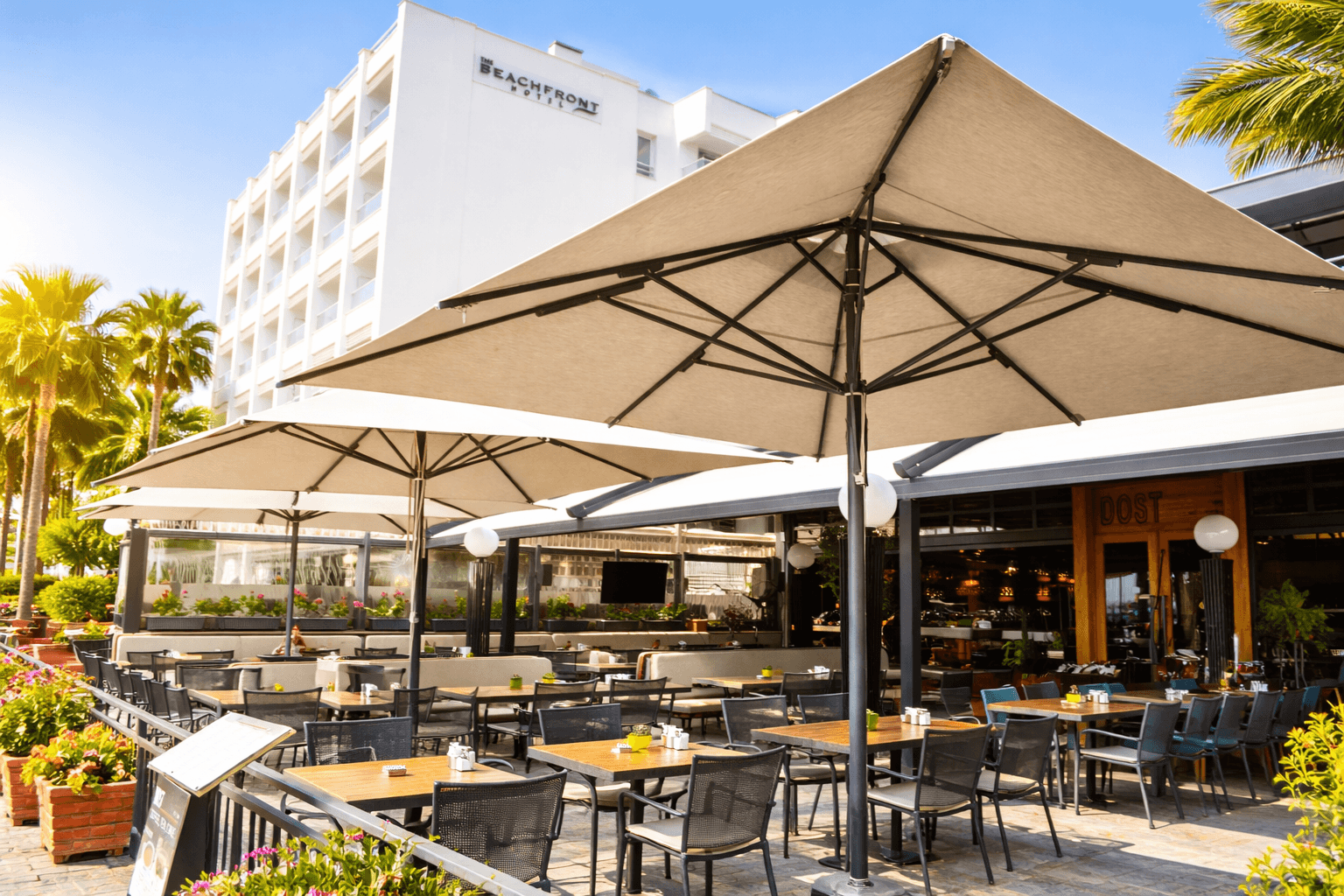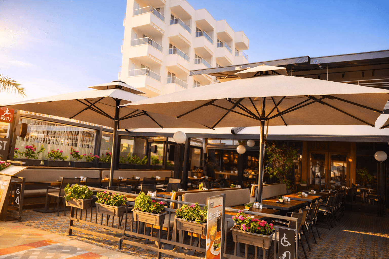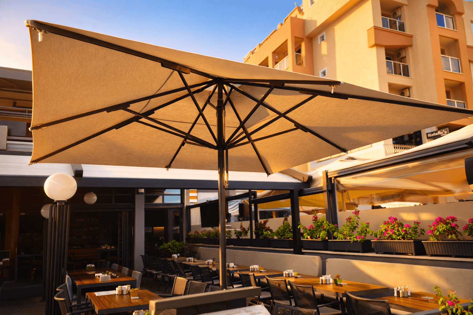 Marmaris sahil hattında konumlanan Dost Restaurant, denizle bütünleşen teras düzeni ve ferah masa yerleşimiyle konforlu bir açık alan deneyimi sunuyor. Teras alanlarında tercih edilen 70 Serisi – 400×400 Kare Şemsiye, büyük ölçekli kare formu sayesinde çoklu masa gruplarını tek bir gölgelendirme altında toplayarak gün boyu dengeli ve kesintisiz bir gölge alanı oluşturuyor. Geniş ölçü, manzarayı kesmeden kapsayıcı bir konfor sağlıyor. 70 mm çapındaki güçlü orta borusu ve alüminyum taşıyıcı yapısıyla öne çıkan 70 Serisi, sahil koşullarına uygun stabil duruşu ve uzun ömürlü performansıyla yoğun yaz sezonuna güvenle eşlik ediyor. Teleskopik kapanma özelliği, servis esnasında masa ve sandalyelere temas etmeden pratik bir kullanım sunarken; palanga sistemli açma-kapama yapısı işletme ekibine zahmetsiz ve kontrollü bir operasyon avantajı sağlıyor. Dost Restoran’ın düzenli ve modern teras kurgusunu estetikten ödün vermeden tamamlıyor.