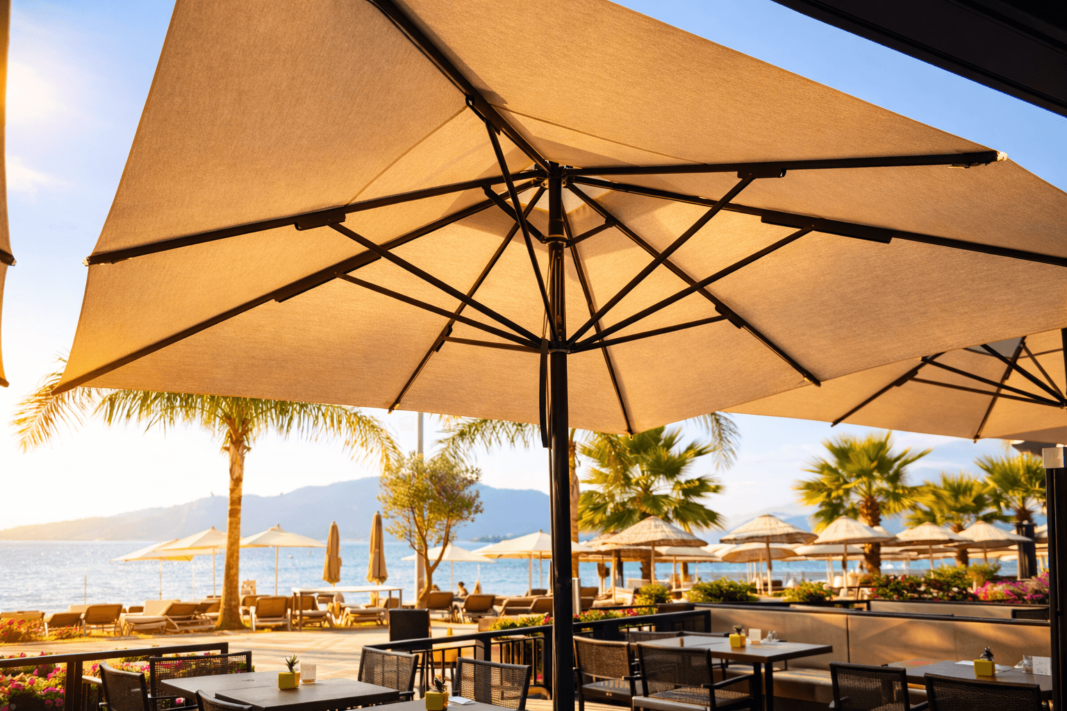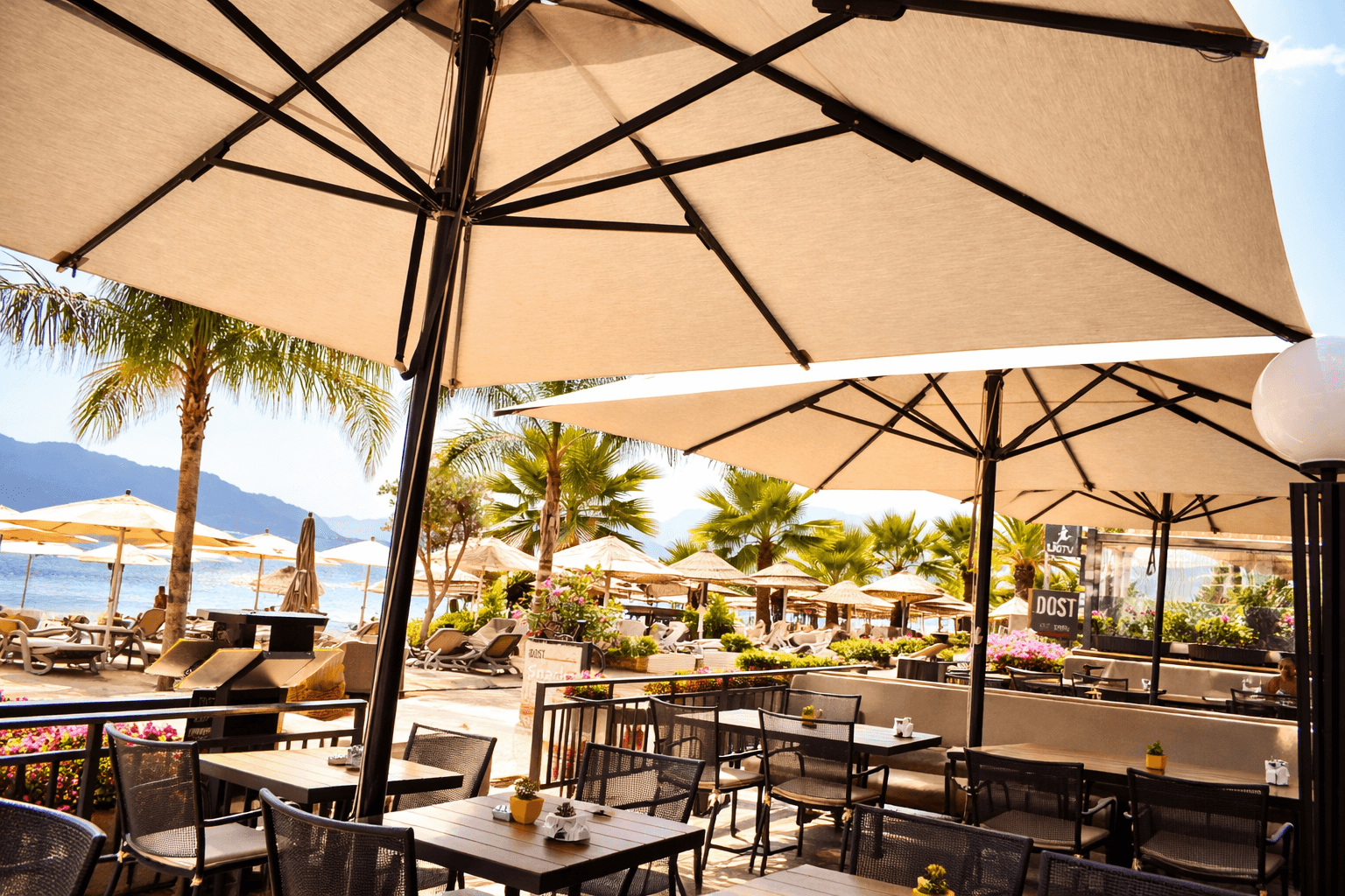 Bu projede tercih edilen Selçuk Tente 70 Serisi – 400×400 Kare Şemsiye, Dost Restaurant’ ın Marmaris’ teki sahil konseptiyle uyum içinde; geniş alan kapsaması, servis konforu ve uzun ömürlü performansı bir arada sunar.