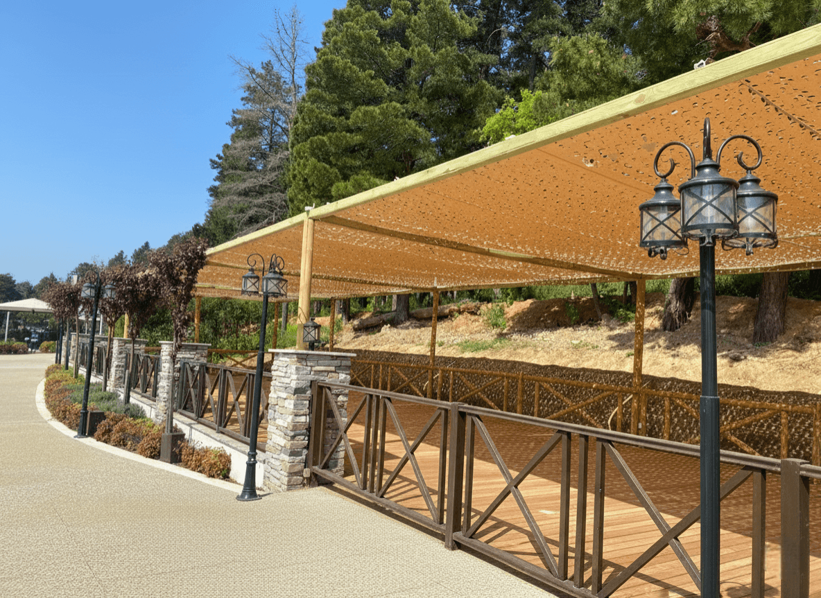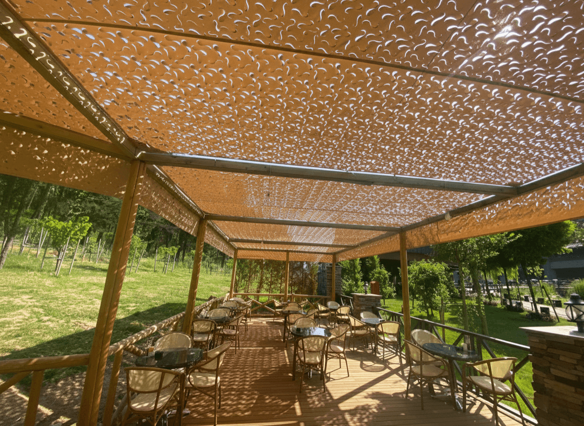 Sapanca’ nın büyüleyici göl manzarası ve yemyeşil orman dokusuna komşu olan Elite World Grand Sapanca, konuklarına yüksek standartlarda bir resort deneyimi yaşatır. Otelin geniş dış mekan ve etkinlik alanları için, Sabit Tente altyapısı üzerinde Kamuflaj Tente sistemimizi hayata geçirdik. Lazer teknolojisiyle açılan özel "S" gözenekler, bölgenin rüzgar akışına uyum sağlayarak direnci minimuma indirir ve kumaşın uçuşan hafif formunu her mevsim korumasını sağlar. Mekanda basık bir tavan hissi yaratmak yerine; ışık oyunlarıyla derinlik katan, ferah ve modern bir gölge alanı sunulmuştur.