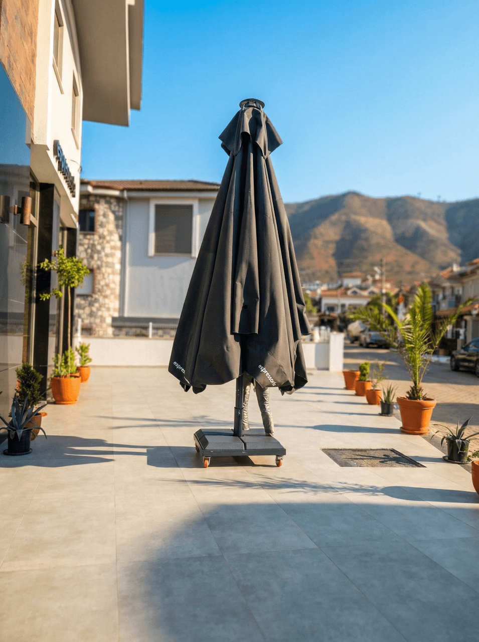 70 mm çapındaki güçlü orta borusu ve alüminyum taşıyıcı yapısıyla öne çıkan 70 Serisi, şehir içi yoğun kullanıma uygun stabil ve uzun ömürlü bir performans sağlar. Teleskopik kapanma özelliği, şemsiye kapatılırken masa ve sandalyelere temas etmeden pratik bir kullanım sunarken; palanga sistemli açma-kapama yapısı işletme ekibi için zahmetsiz ve kontrollü bir operasyon avantajı yaratır. Espressonia Cafe’nin modern ve dinamik atmosferiyle uyumlu, güçlü ama sade bir dış mekân tamamlayıcısı olarak konumlanır.