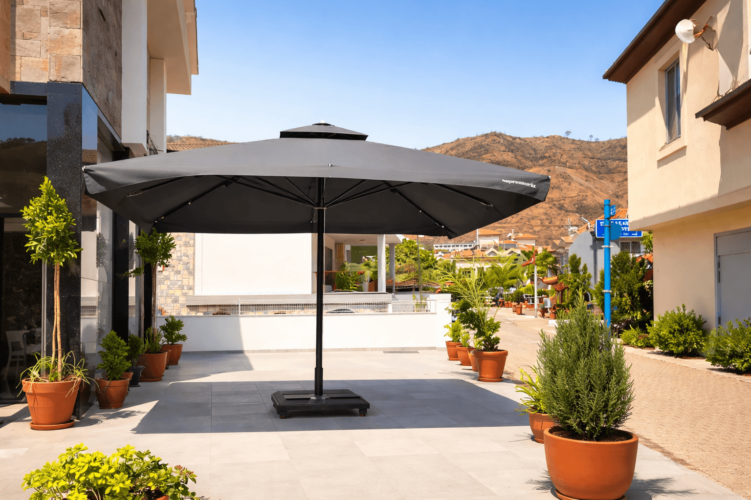 Bu projede tercih edilen Selçuk Tente 70 Serisi – 400×400 Kare Şemsiye, Espressoria Cafe’ nin Marmaris’ teki açık alan konseptiyle uyum içinde; geniş alan kapsaması, kullanıcı konforu ve uzun ömürlü performansı bir arada sunar.