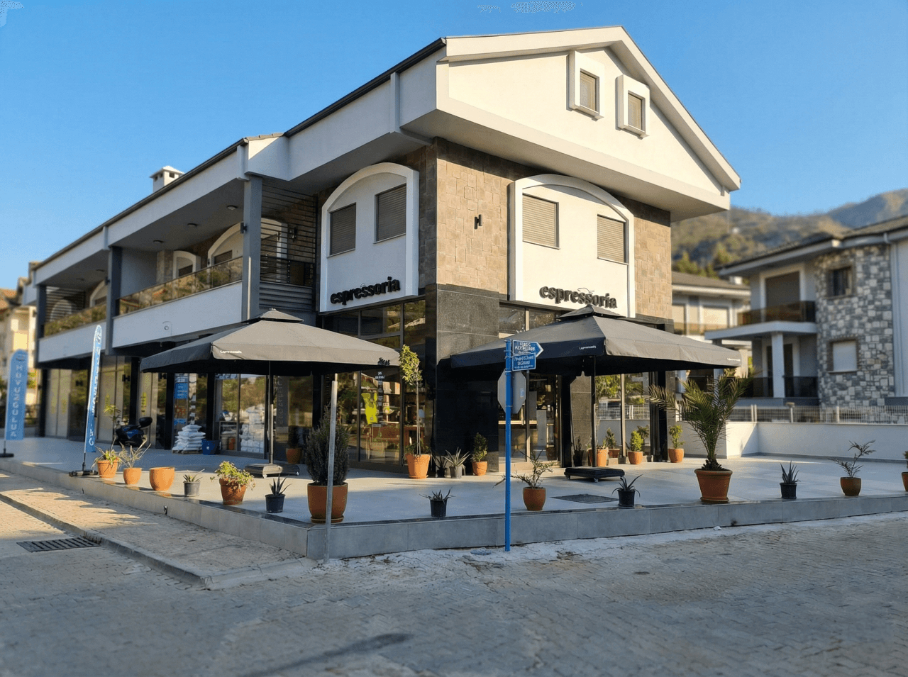 Marmaris’in canlı şehir temposu içinde konumlanan Espressoria Cafe, açık alan düzeninde ferahlık ve düzeni ön planda tutan bir mekân kurgusuna sahiptir. Teras ve dış oturma alanlarında tercih edilen 70 Serisi – 400×400 Kare Şemsiye, büyük ölçekli kare formu sayesinde birden fazla masa grubunu tek bir gölgelendirme altında toplayarak gün boyu dengeli ve kapsayıcı bir kullanım alanı oluşturur. Geniş ölçüsü, yoğun saatlerde dahi kesintisiz gölge konforu sunar.