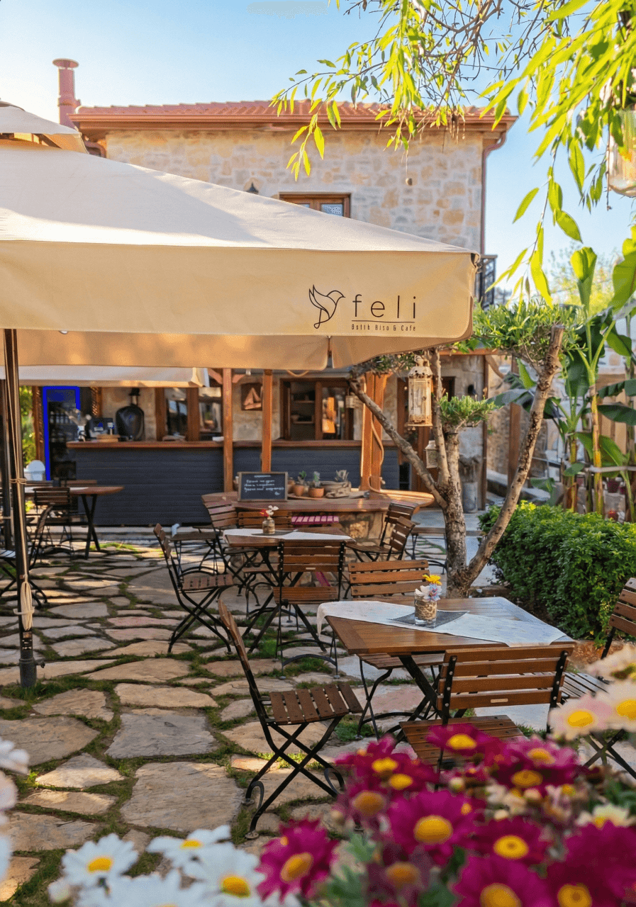 Marmaris’in hareketli şehir dokusu içinde konumlanan Feli Cafe, açık alan kullanımında ferahlık ve düzeni öne çıkaran bir mekân kurgusuna sahiptir. Teras ve dış oturma alanlarında tercih edilen 70 Serisi – 400×400 Kare Şemsiye, büyük ölçekli kare formu sayesinde birden fazla masa grubunu tek bir gölgelendirme altında toplayarak dengeli ve konforlu bir kullanım alanı sunar. Geniş ölçüsü, gün boyu değişen güneş açılarına karşı kesintisiz gölge sağlar. 70 mm çapındaki güçlü orta borusu ve alüminyum taşıyıcı yapısıyla öne çıkan 70 Serisi, şehir içi yoğun kullanıma uygun stabil ve uzun ömürlü bir performans sergiler. Teleskopik kapanma özelliği sayesinde şemsiye kapatılırken masa ve sandalyelere temas etmeden pratik bir kullanım sağlanırken; palanga sistemli açma-kapama yapısı işletme temposu içinde zahmetsiz ve kontrollü bir operasyon avantajı sunar. Feli Cafe’nin sıcak ve samimi atmosferiyle uyumlu, güçlü ama sade bir dış mekân tamamlayıcısı olarak konumlanır.