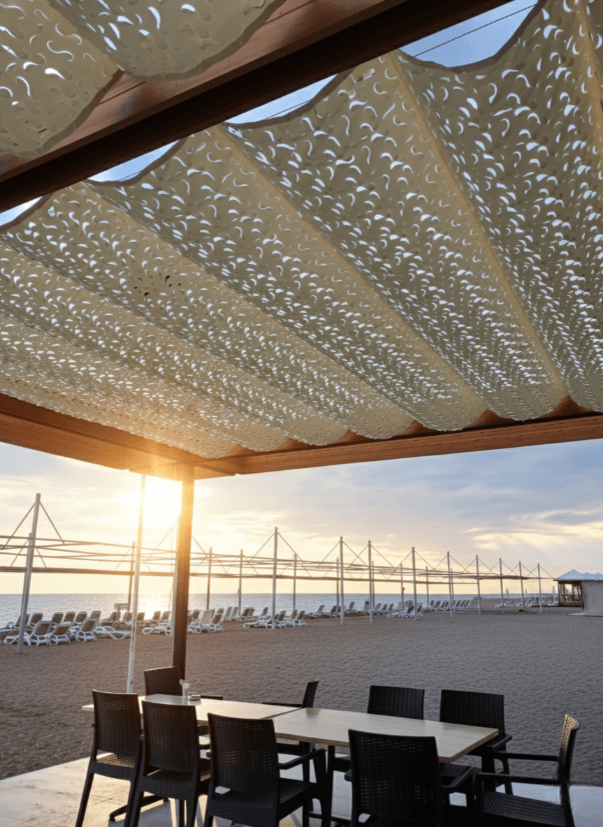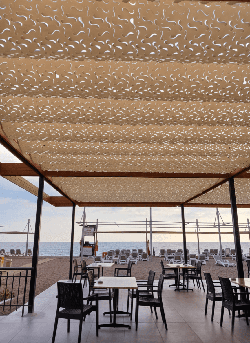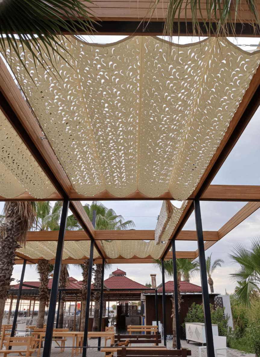Antalya’nın parlayan güneşi ve Side’nin eşsiz kumsallarında, konforu denizle buluşturduk. Felicia Otel’in sahil restoranında, misafirlerin her anına eşlik edecek en şık koruma: Selçuk Tente Telli Tente Sistemi. Geniş açıklıkları zarafetle kapatan bu projemizde, Akdeniz’in enerjisine uygun CNC Kesim Kamuflaj Kumaş tercih ettik. Krom halatlar üzerindeki akordiyon yapısı, en sert deniz rüzgarlarında bile güven sunarken; kamuflaj dokunun arasından süzülen güneş ışığı, zeminde ve masalarda adeta bir kum tanesi parıltısı etkisi yaratıyor. Fotoğraflarda göreceğiniz o uçsuz bucaksız deniz manzarası, tente sistemimizin modern hatlarıyla birleşince Side’nin en müthiş gölgeli mekanı ortaya çıkıyor.