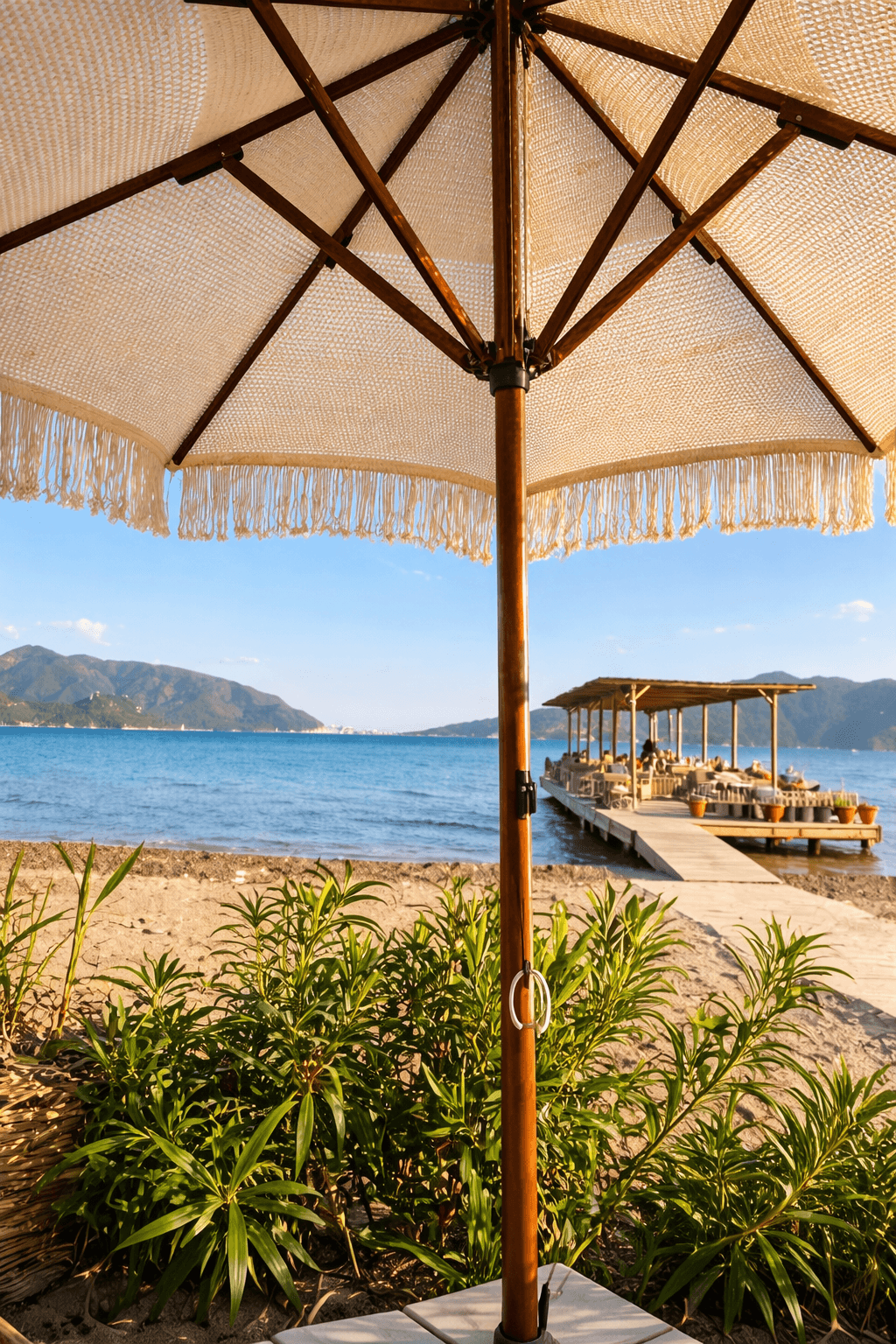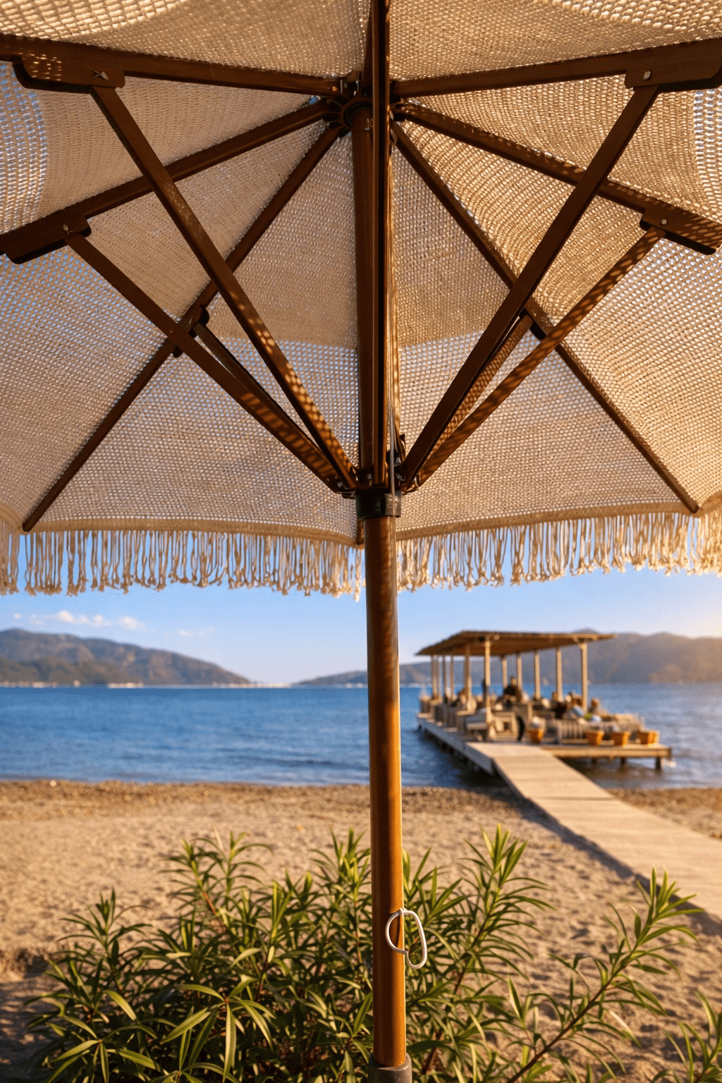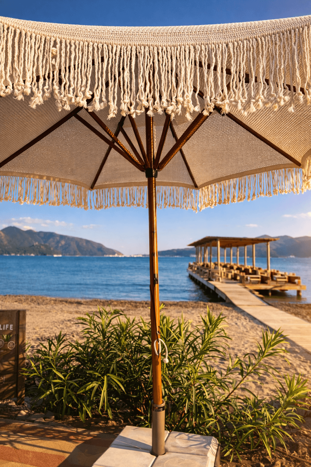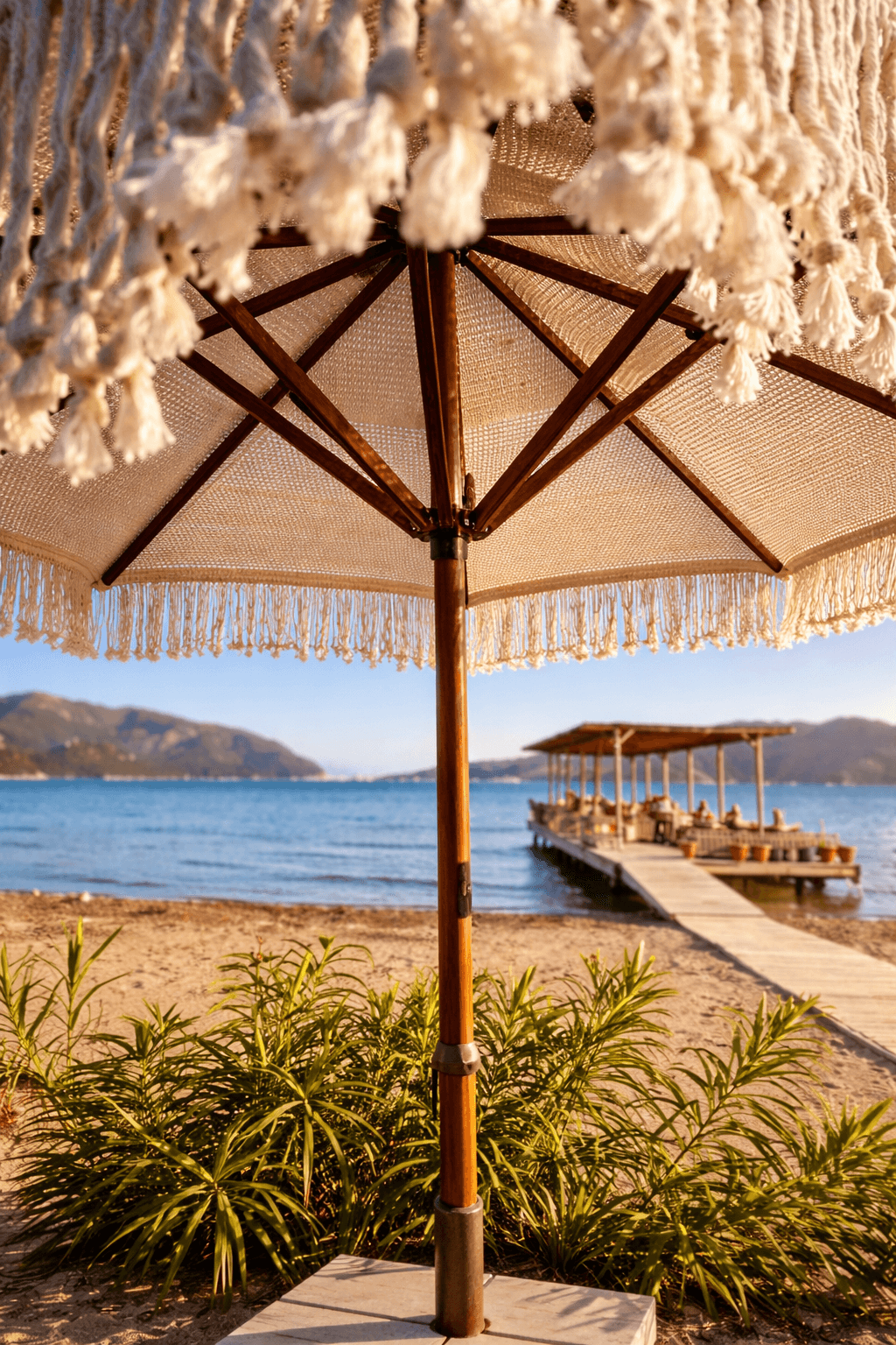 Bu projede kullanılan Selçuk Tente 50 Serisi – Makrome Şemsiye; sahil işletmeleri, restoranlar ve butik oteller için estetik, sağlam ve uzun ömürlü bir gölgelendirme çözümüdür.