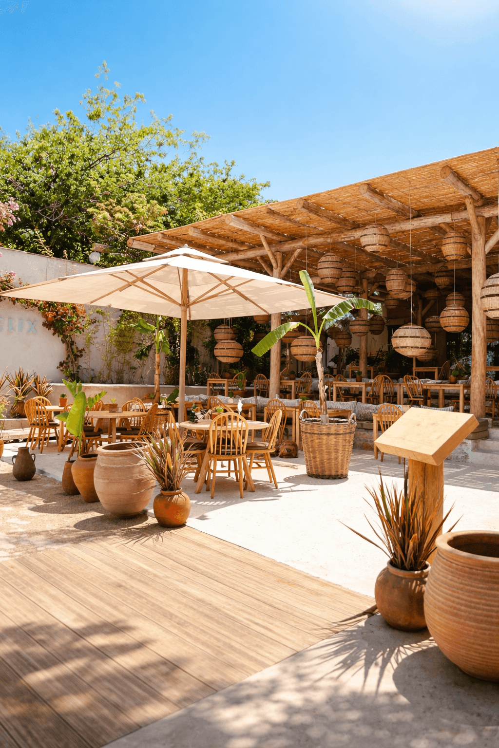 Bodrum sahil hattında konumlanan Felix, denizle bütünleşen teras alanlarında konforu ve prestijli bir dış mekân deneyimini ön planda tutar. Açık alanlarda tercih edilen 99 Serisi – 400×400 Kare Şemsiye, geniş kare formu sayesinde çoklu masa düzenlerini tek bir gölgelendirme altında toplayarak ferah, dengeli ve kesintisiz bir kullanım alanı oluşturur. 400×400 ölçüsü, manzarayı bölmeden homojen gölge sağlayarak gün boyu yüksek konfor sunar.