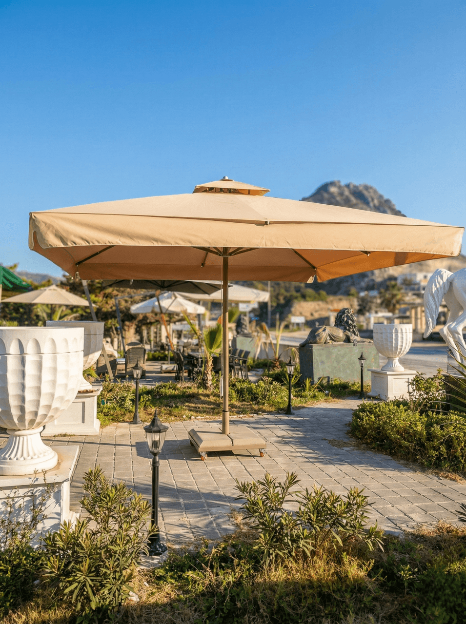 Bodrum’ un dinamik şehir yaşamı içinde konumlanan FoxWood, açık alan düzeninde konforu ve akıcı servis düzenini ön planda tutan bir mekân kurgusuna sahiptir. Teras ve dış oturma alanlarında tercih edilen 70 Serisi – 400×400 Kare Şemsiye, büyük ölçekli kare formu sayesinde birden fazla masa grubunu tek bir gölgelendirme altında toplayarak ferah ve dengeli bir kullanım alanı oluşturur. Geniş ölçüsü, gün boyu değişen güneş açılarında kesintisiz gölge konforu sağlar.