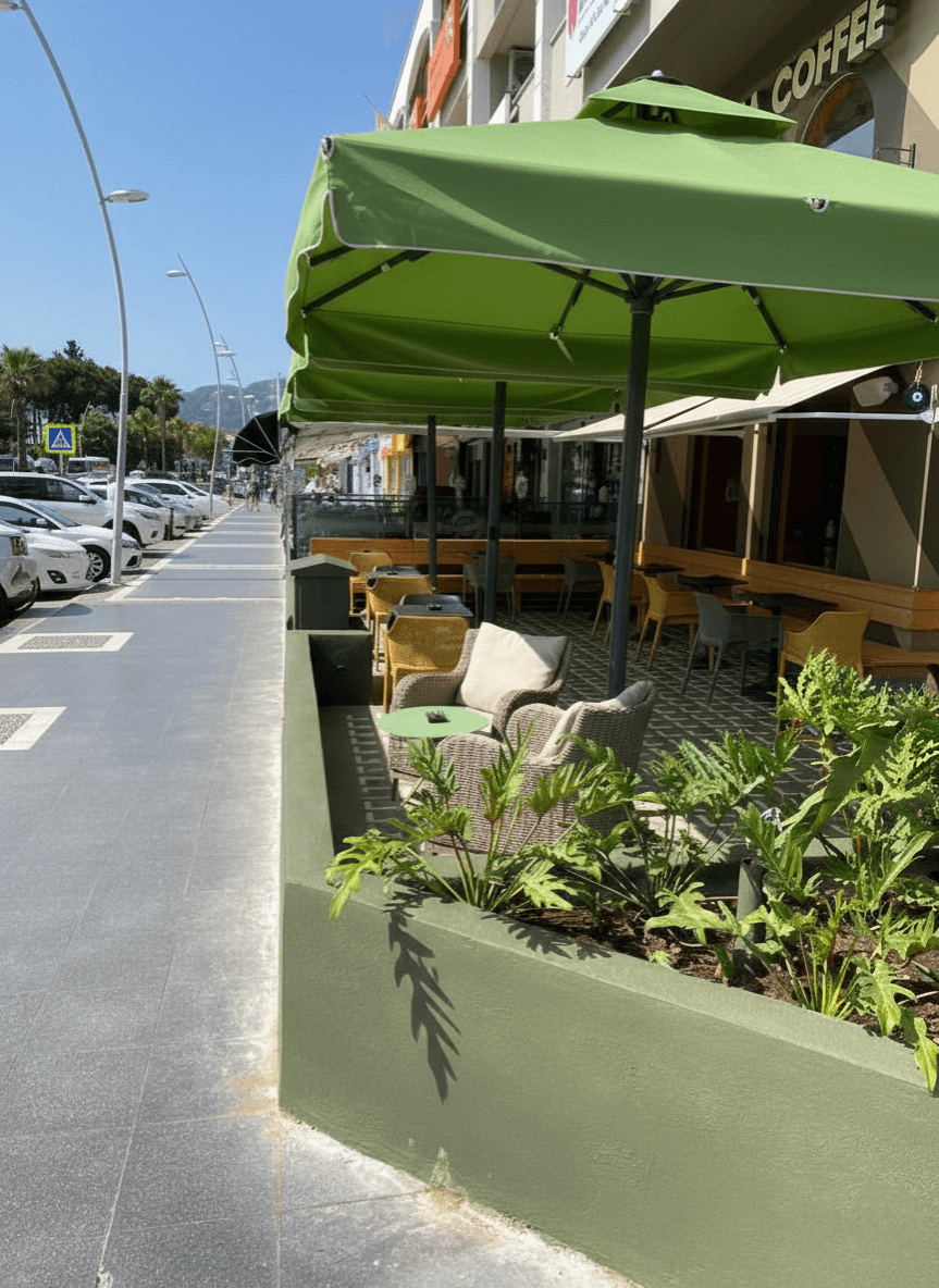 Bu projede tercih edilen Selçuk Tente 99 Serisi – 400×400 Kare Şemsiye, Fredonia’nın Marmaris’teki sahil ve teras konseptiyle uyum içinde; ileri teknoloji, yüksek taşıyıcı güç ve uzun ömürlü performansı bir arada sunar.