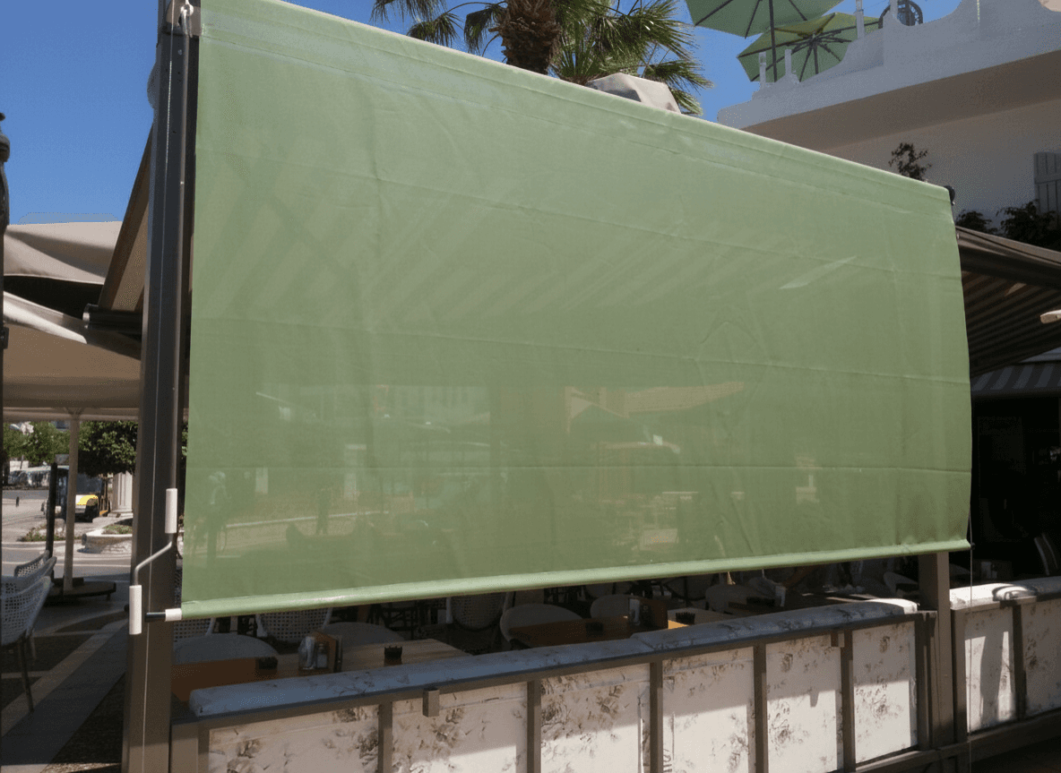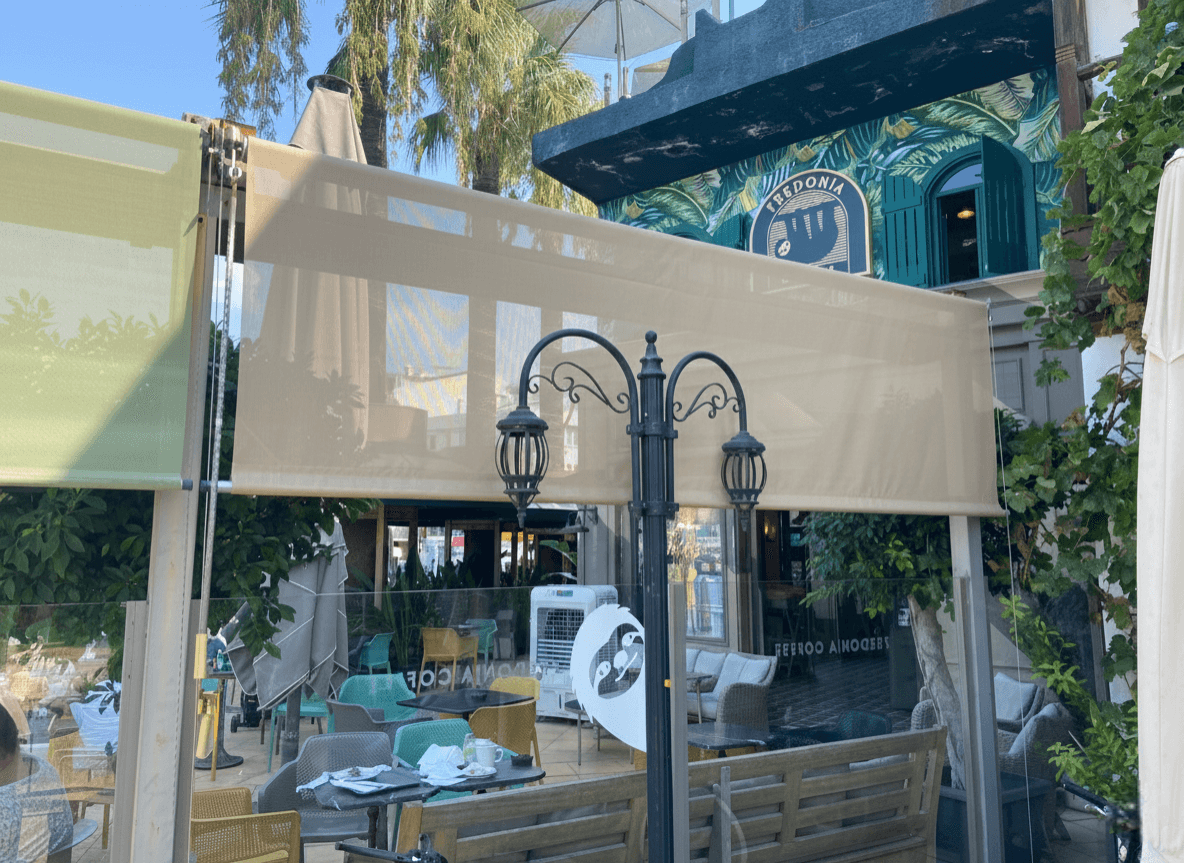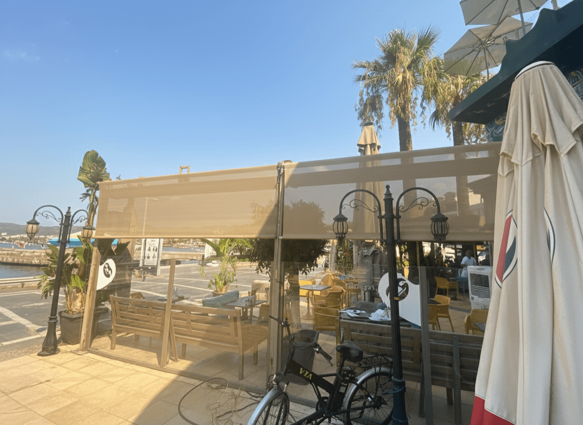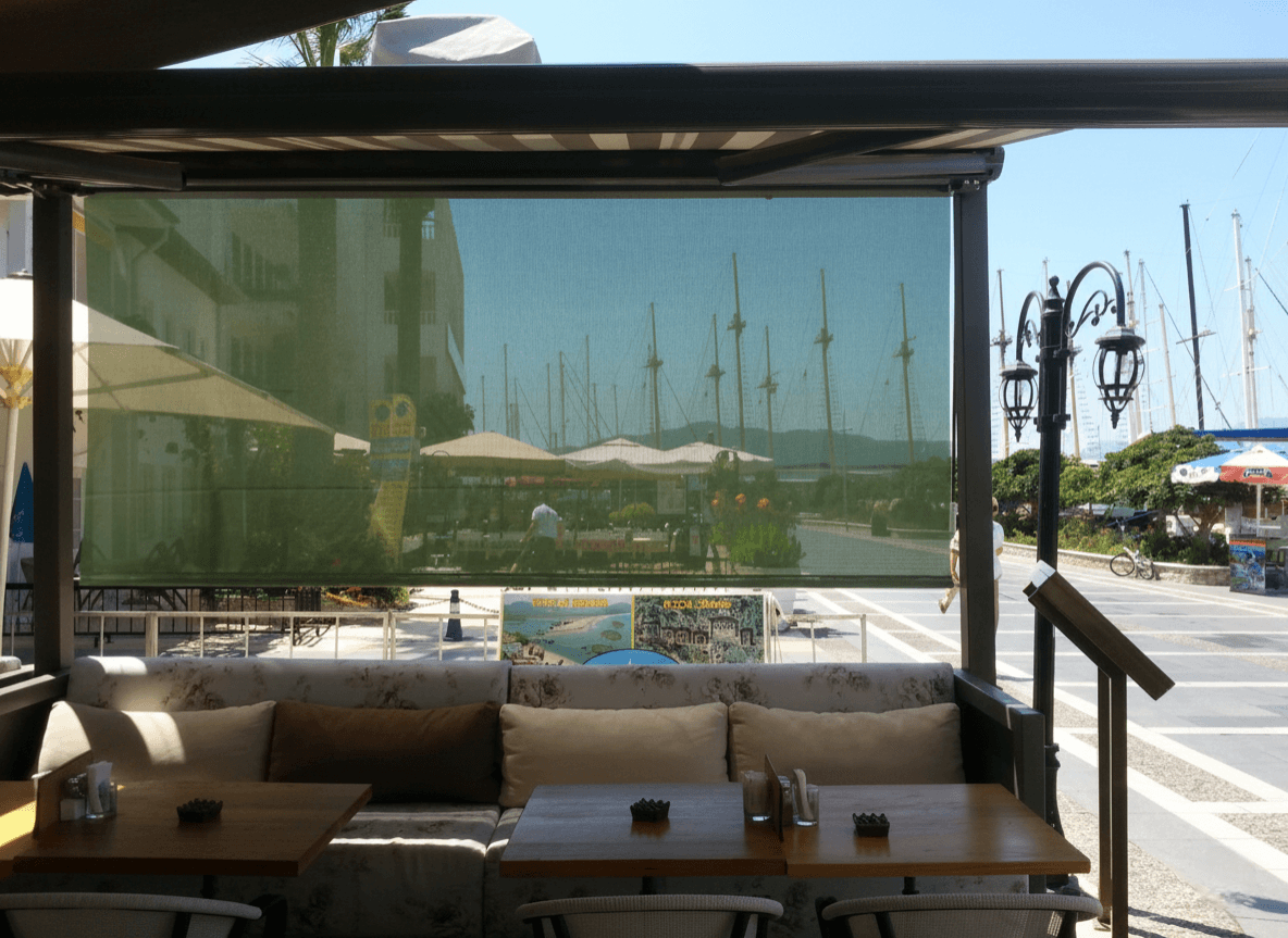• Manzara ve Işık Kontrolü: Seçilen Screen (delikli) kumaş teknolojisi sayesinde, güneşin yakıcı ısısı filtrelenirken kafenin dışarıyla olan görsel bağı kopmaz ve ferahlık hissi korunur.