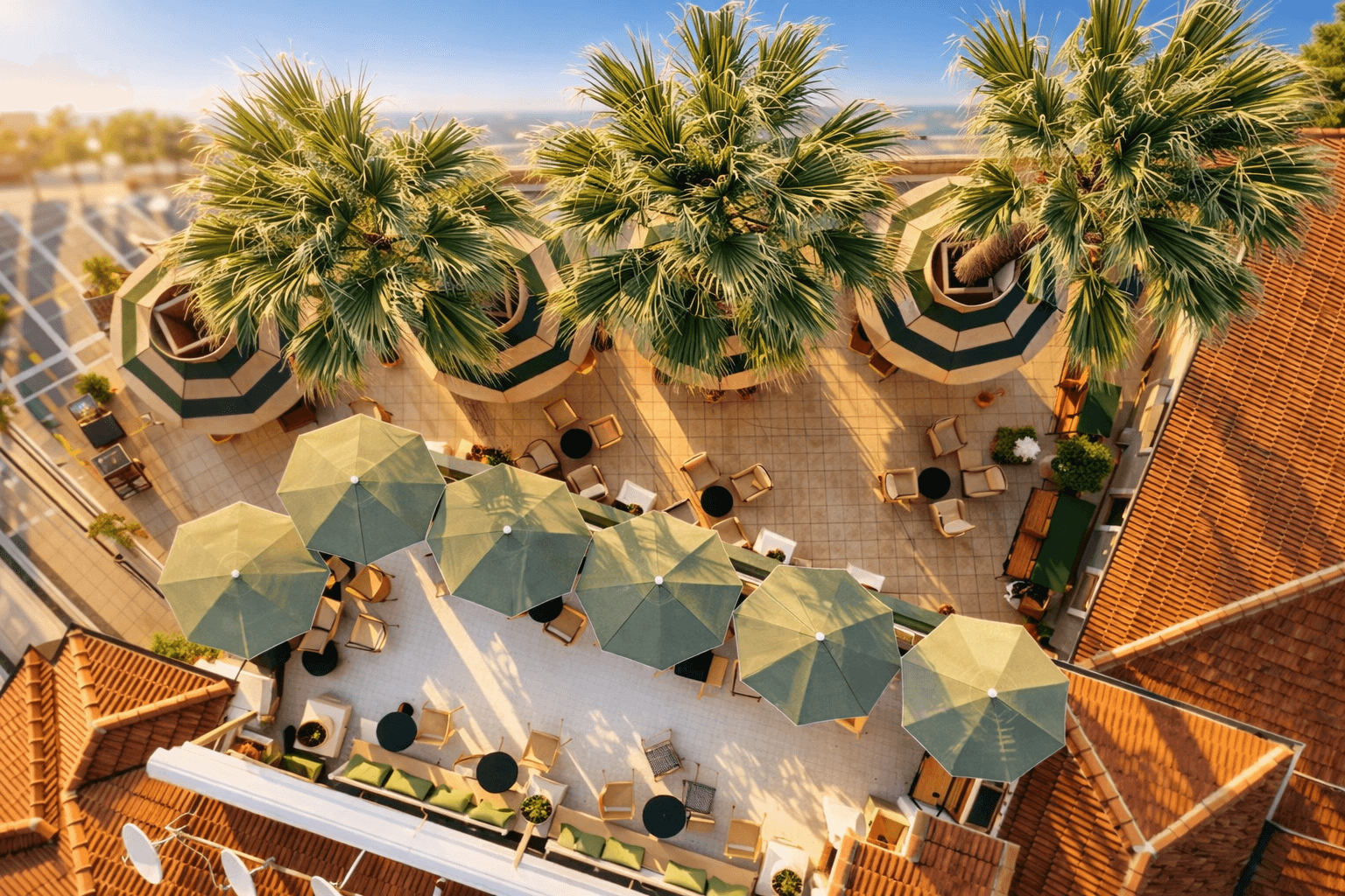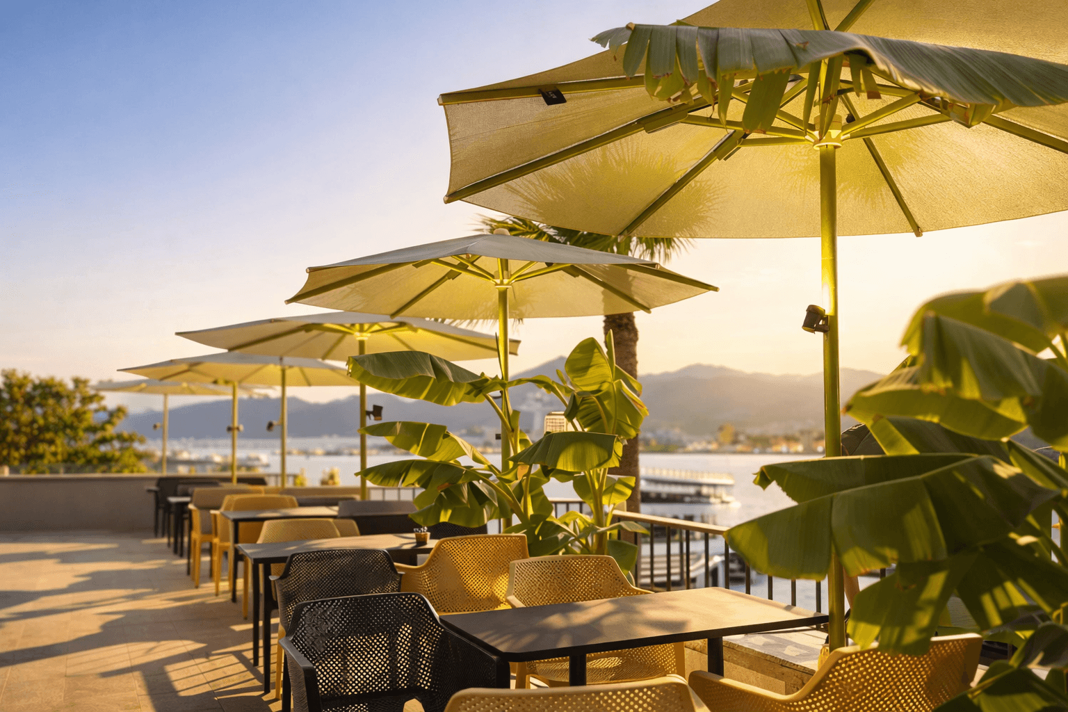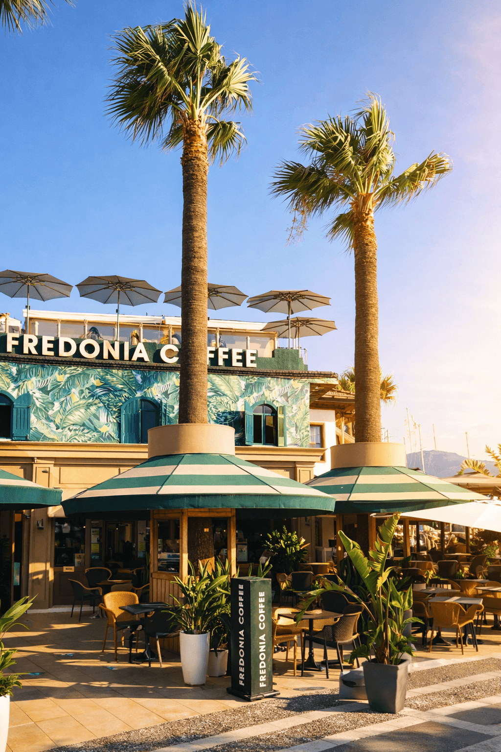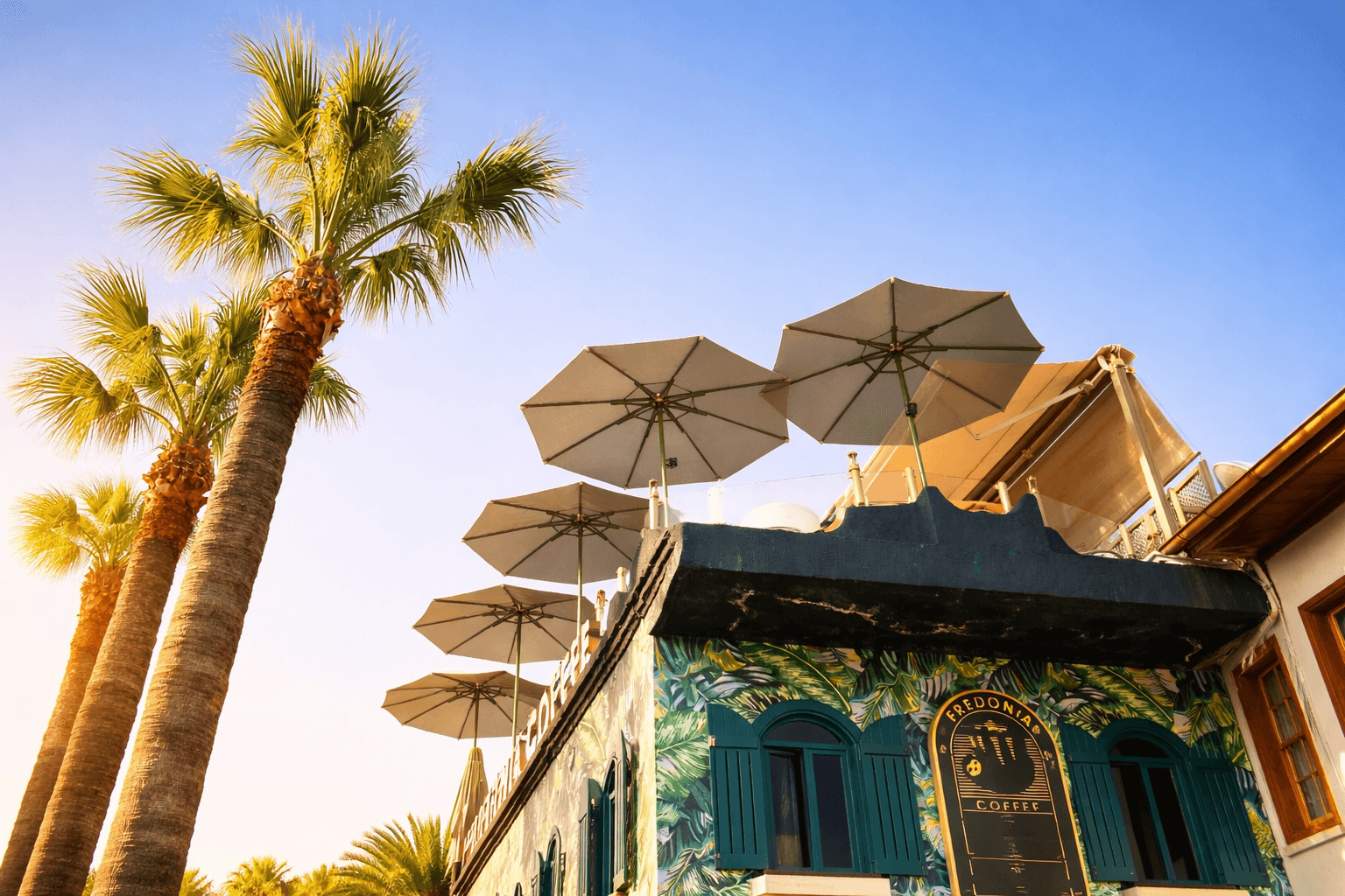Marmaris’in hareketli sahil atmosferinde konumlanan Fredonia Cafe, açık alan konforunu estetikle buluşturan detaylarıyla öne çıkıyor. Palmiye dokusuyla çevrili oturma alanlarında tercih edilen 50 Serisi – Ø 280 Yuvarlak Şemsiye, mekânın doğal siluetiyle uyum sağlayarak gün boyu dengeli bir gölge alanı oluşturuyor. Yuvarlak formu sayesinde masalar arasında görsel bütünlük sağlanırken, ferah bir açık alan deneyimi sunuluyor. Dayanıklı alüminyum taşıyıcı yapısı ve rüzgâra karşı dengeli duruşuyla 50 Serisi, Fredonia Cafe’nin yoğun kullanım temposuna sorunsuz uyum sağlıyor. Açma-kapama kolaylığı ve sade tasarımı, hem işletme ekibi hem de misafirler için pratik bir kullanım avantajı yaratıyor. Açık alanda geçirilen zamanı daha keyifli hale getiren bu çözüm, Marmaris’in güneşli iklimine fonksiyonel ve estetik bir yanıt veriyor.