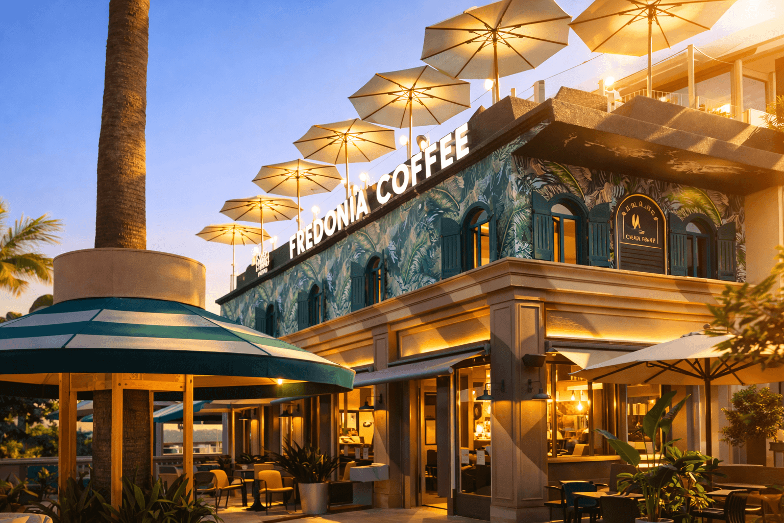Bu projede tercih edilen Selçuk Tente 50 Serisi – Ø 280 Yuvarlak Şemsiye, Fredonia Cafe’nin açık alan konseptiyle bütünleşerek gölgelendirme konforu, görsel denge ve uzun ömürlü kullanım avantajlarını bir arada sunar.