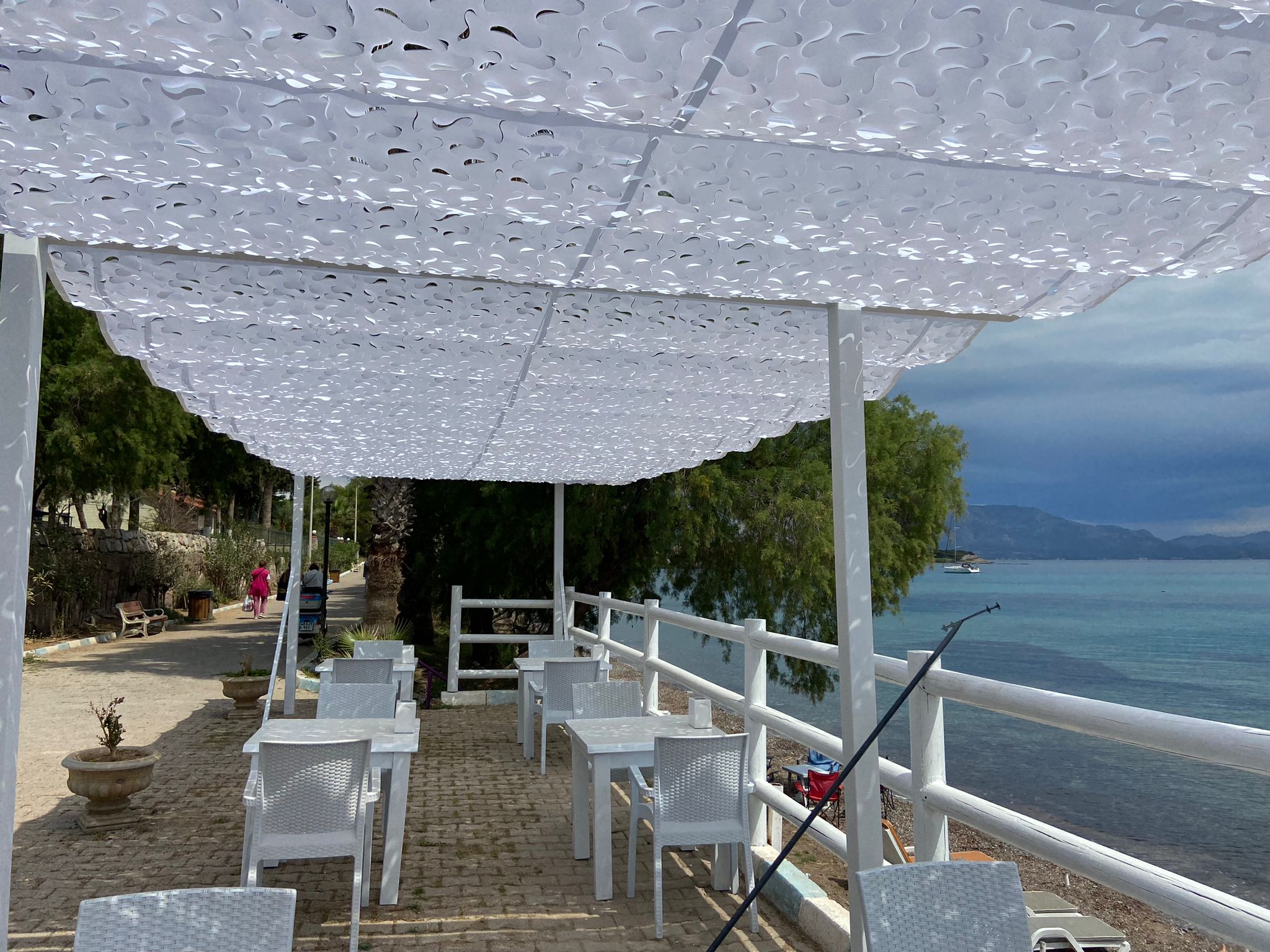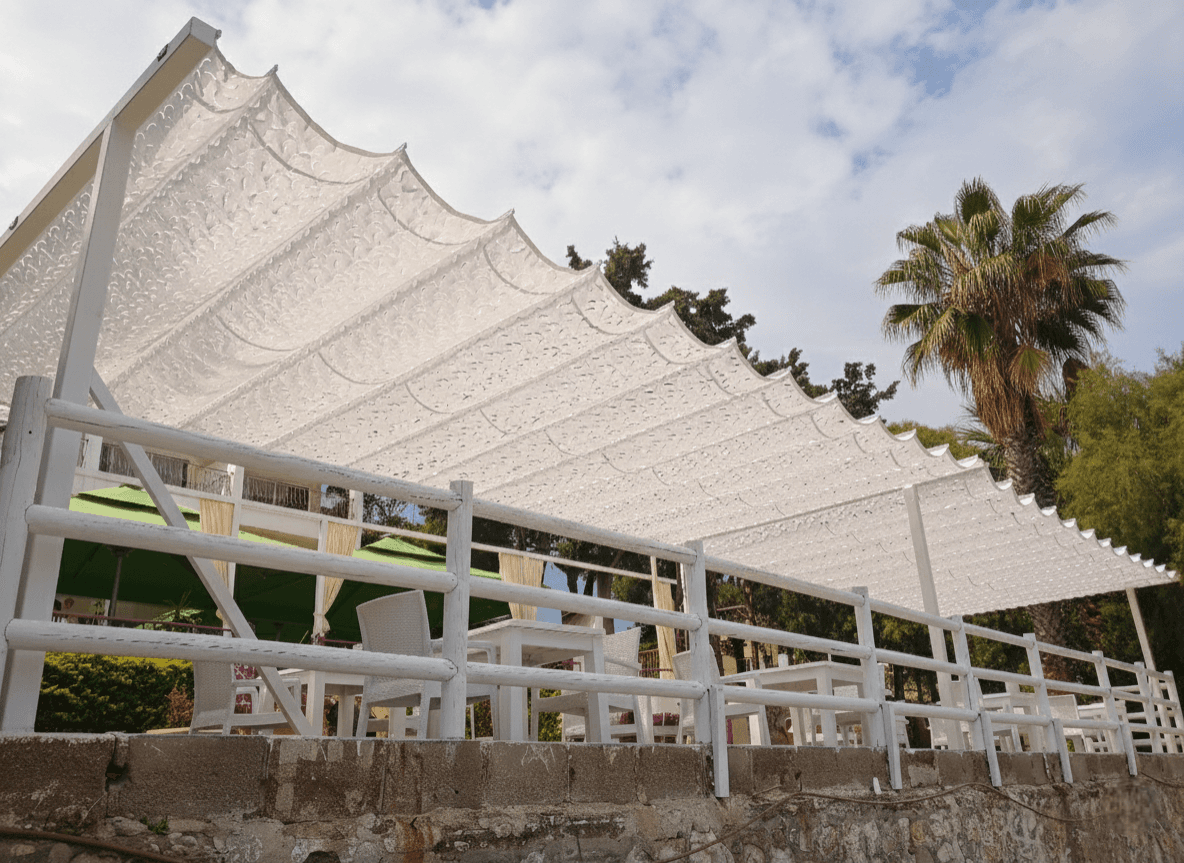 Ege’nin en duru sularına ev sahipliği yapan Datça’da, Fuda Otel’in sahil terasını Selçuk Tente şıklığıyla taçlandırdık. Mavinin her tonuna eşlik eden bu özel projemizde, sadeliği konforla birleştirdik. Telli Tente Sistemimiz, bu eşsiz lokasyonda CNC Kesim Kamuflaj Kumaş ile hayat buldu. Krom halatlar üzerindeki akordiyon yapısı, denizden gelen o meşhur Datça esintisini kesmeden misafirlere gölgenin en ferah halini sunuyor. Fotoğraflarda göreceğiniz gibi; kamuflaj dokunun arasından süzülen yumuşak ışık, sahilin doğal dokusu ve otelin beyaz mobilyalarıyla kusursuz bir bütünlük sağlıyor. Denize sıfır bu terasta kahvenizi yudumlarken, üzerinizdeki gölge oyunları size huzuru fısıldayacak. Doğanın içinde, tasarımın merkezinde bir Akdeniz keyfi.