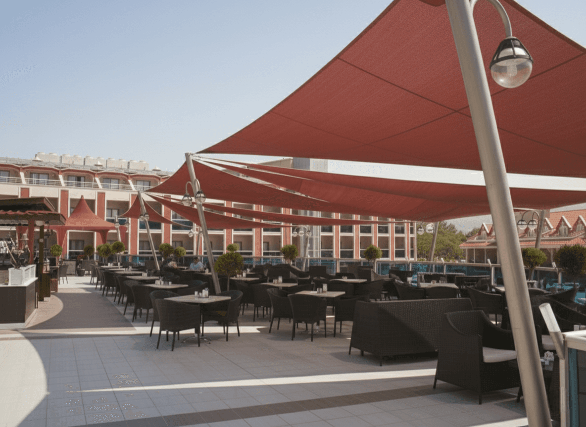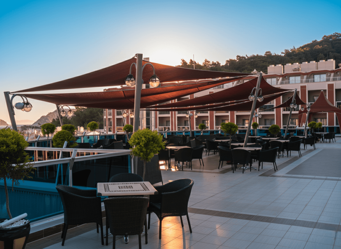 Marmaris’ in yeşili ile mavisi arasında konumlanan Green Nature’ ın dış mekan kullanım alanlarını, mimari birer odak noktasına dönüştürdük. İşletmenin yüksek kalite standartlarına ve modern çizgisine uyum sağlaması amacıyla, bu projede estetiğin en gergin formu olan Yarasa Tente sistemimizi tercih ettik. Bu projenin en vurucu ve dikkat çekici detayı, kumaş ile emniyet şeridi arasındaki renk kontrastıdır.