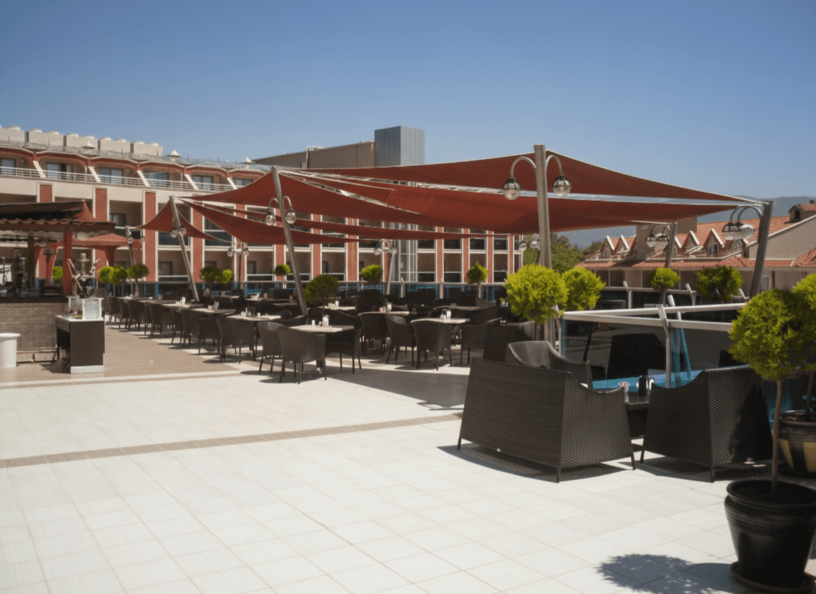 Uzun ömürlülüğü ve güneş kontrolü ile bilinen jüt kumaş seçimimize , kumaş rengine uygun ancak farklı bir tonda kurgulanan özel emniyet kolonu (şerit) eşlik etmiştir. Kumaşın tüm çevresine dikilen bu şeritler, hem tentenin sarsılmaz bir gerginlikte durmasını sağlayarak sarkmaları önler, hem de Green Nature’ ın mimarisine modern ve dinamik bir çerçeve kazandırarak göz alıcı bir derinlik yaratır. Selçuk Tente’ nin teknik imzası olan köşe bağlantılarında ise, sıradan halkalar yerine altlı- üstlü krom plakalar kullanılmıştır. Kumaşı sandviç sistemiyle araya sıkıştıran bu paslanmaz parçalar, yükü dengeli dağıtarak rüzgara karşı maksimum direnç oluştururken, parlak yüzeyleriyle tesise teknik bir şıklık katmaktadır. Tamamen güneşten korunma ve dekorasyon odaklı bu uygulama, Marmaris’in yakıcı sıcağında misafirlere serin ve ferah bir atmosfer sunmaktadır.